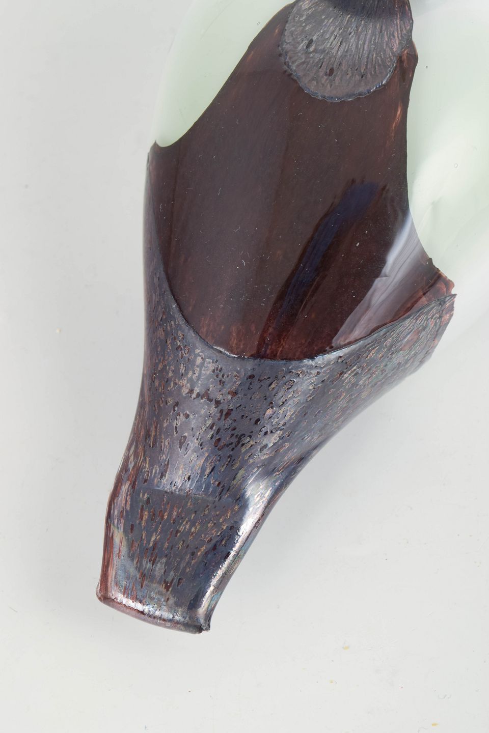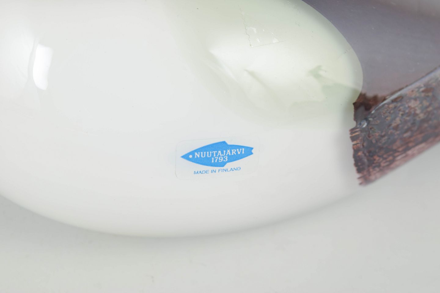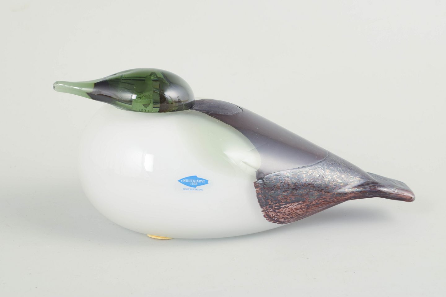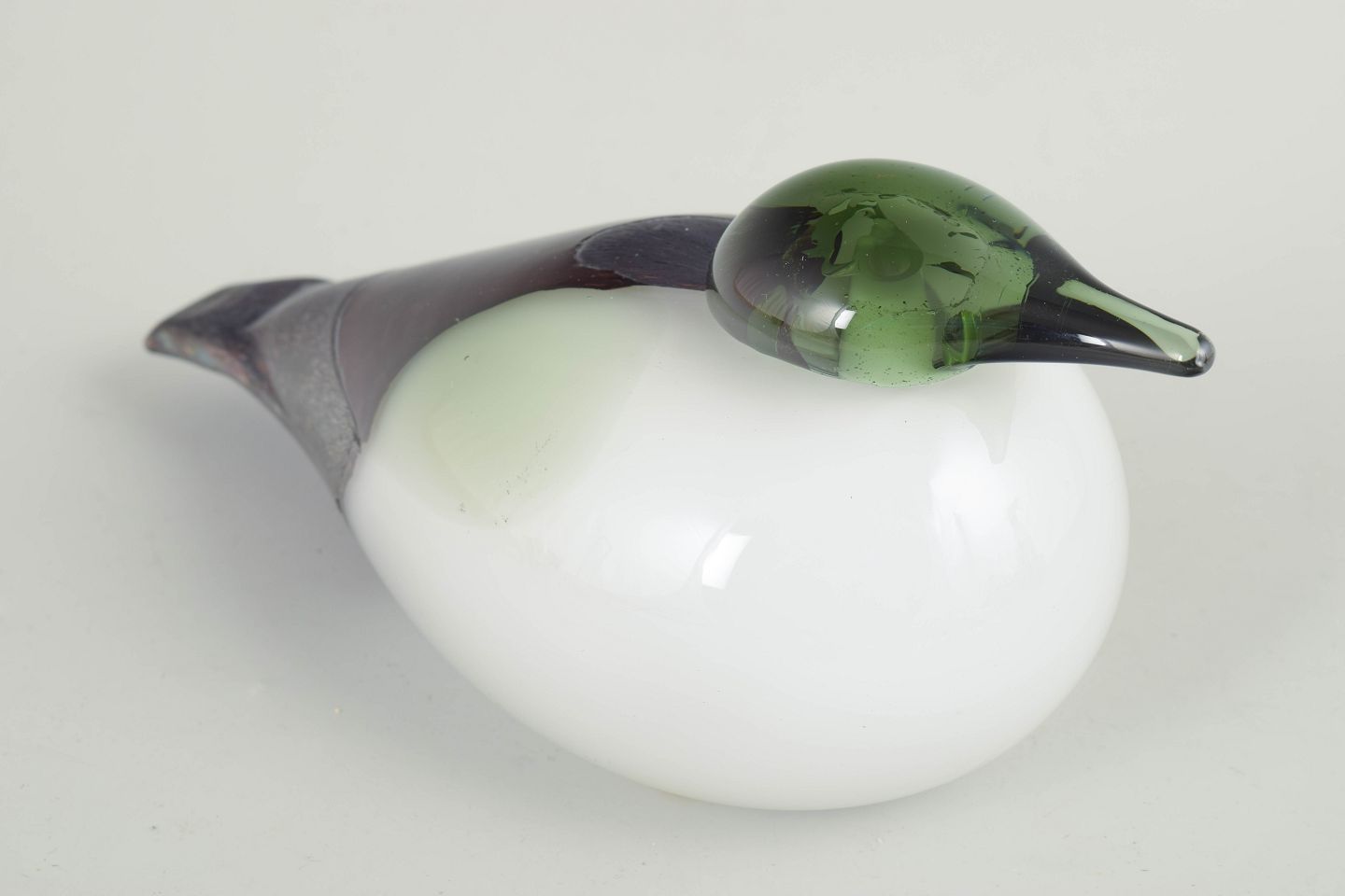 Oiva Toikka for Nuutajärvi, stor fugl.Stor fuglefigur i mundblæst kunstglas med hvid, opaliserende krop, grønligt hoved og røgfarvede til violette partier med indsmeltede farvespil; et karakteristisk eksempel på finsk studioglas fra 1980’erne.