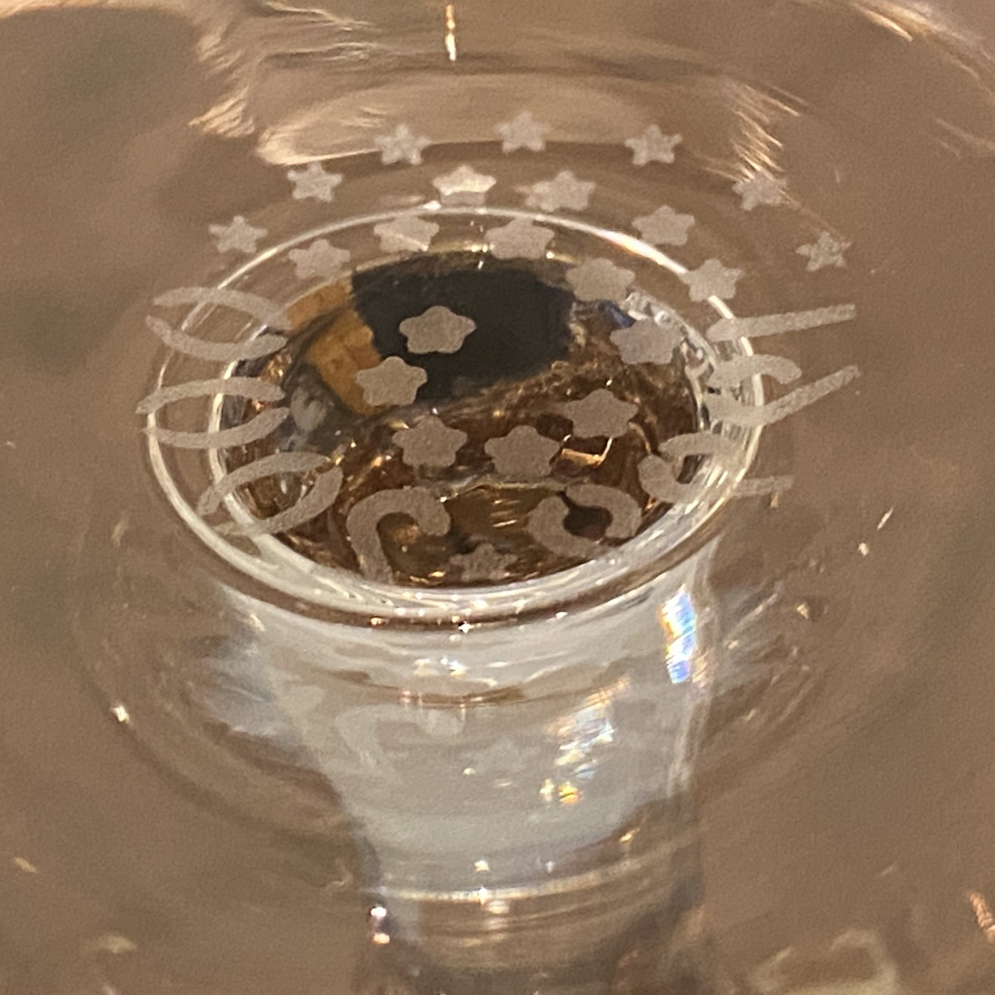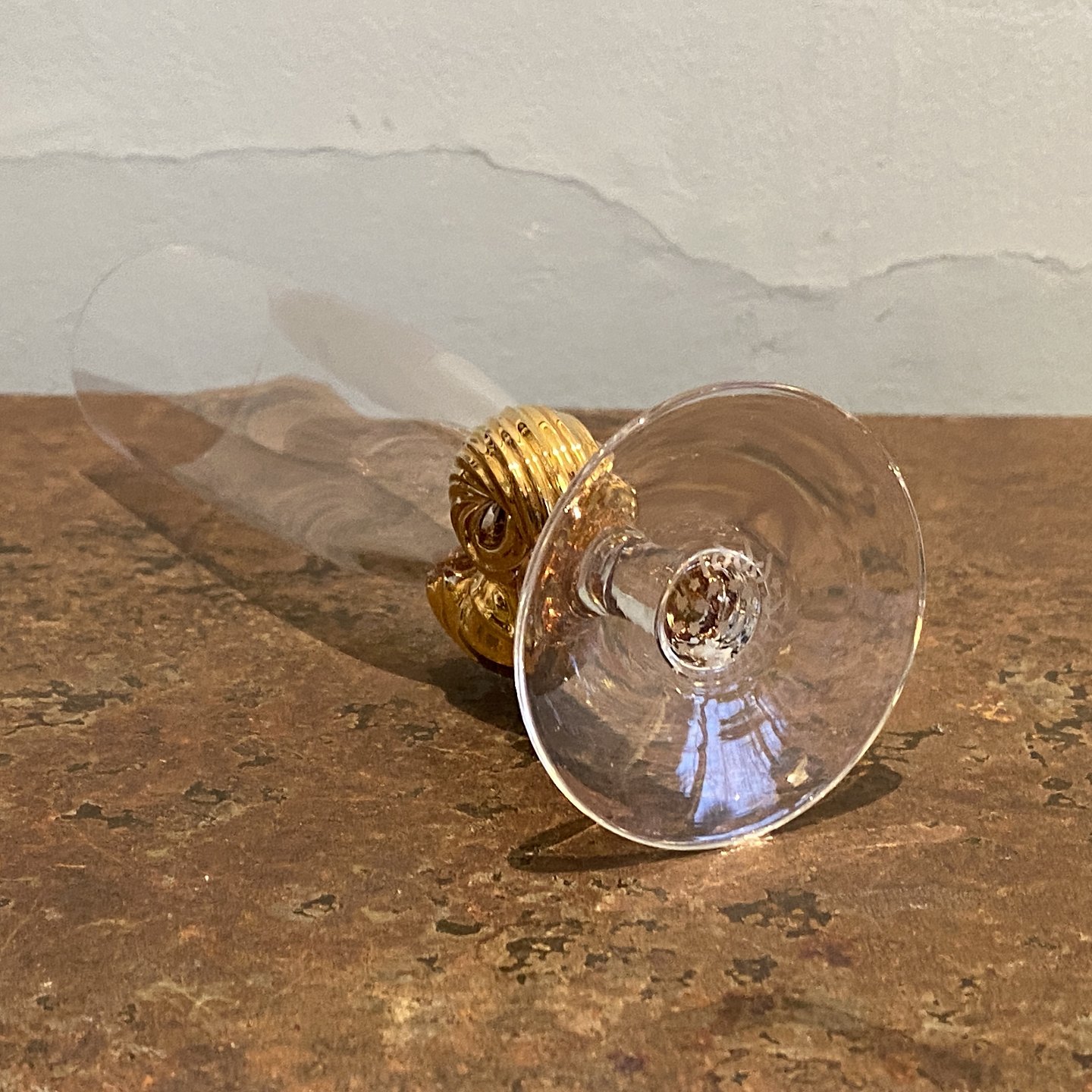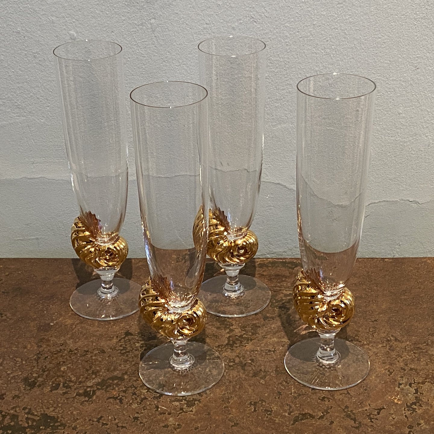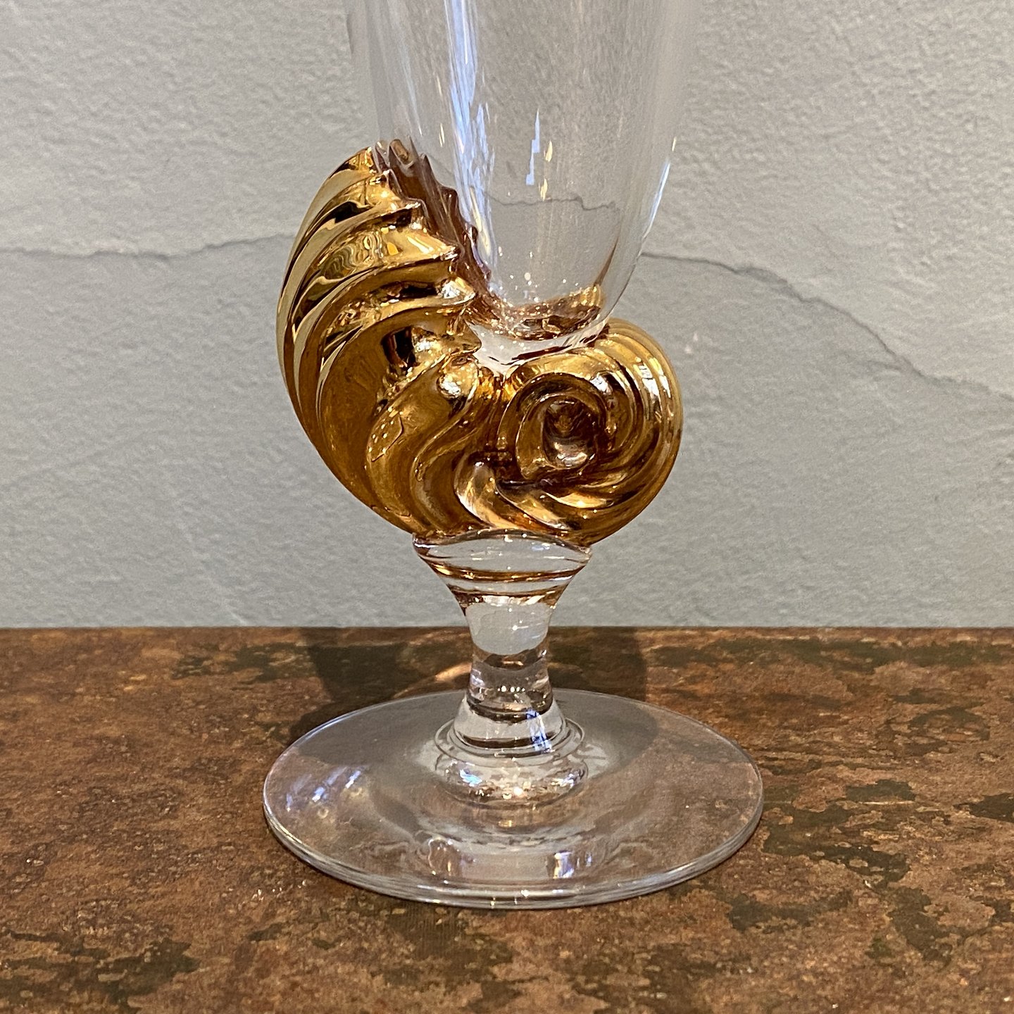 Designet af Darryle Hinz. Fremstillet af klart glas med en forgyldt dekorativ stilk i form af konkylie.