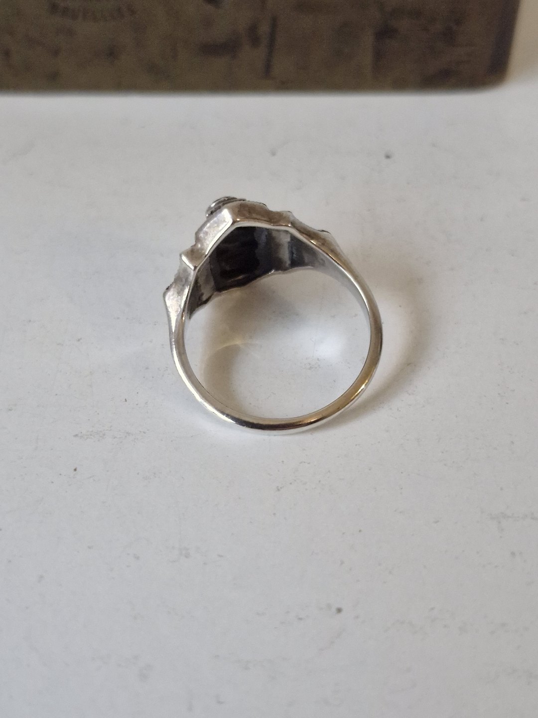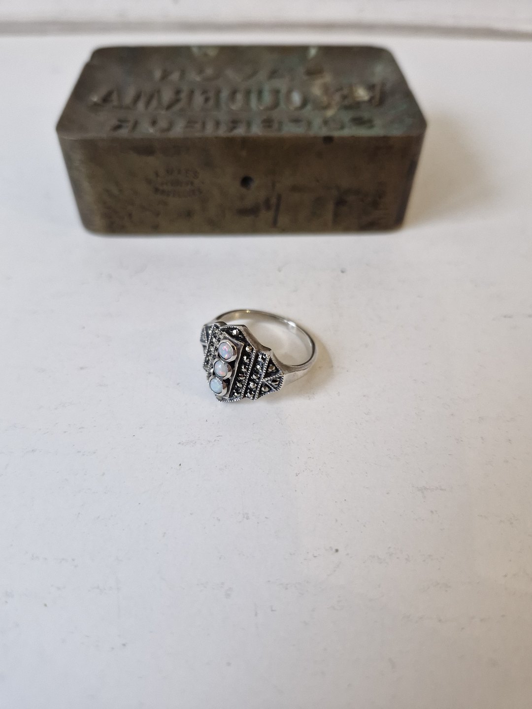 Art deco ring i sterlingsølv med tre opaler omkranset af markasitterStemplet 925