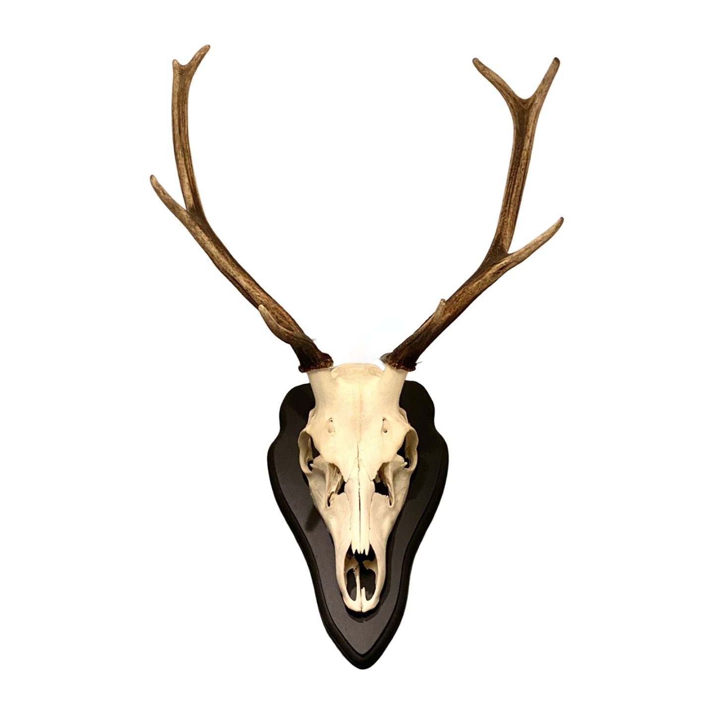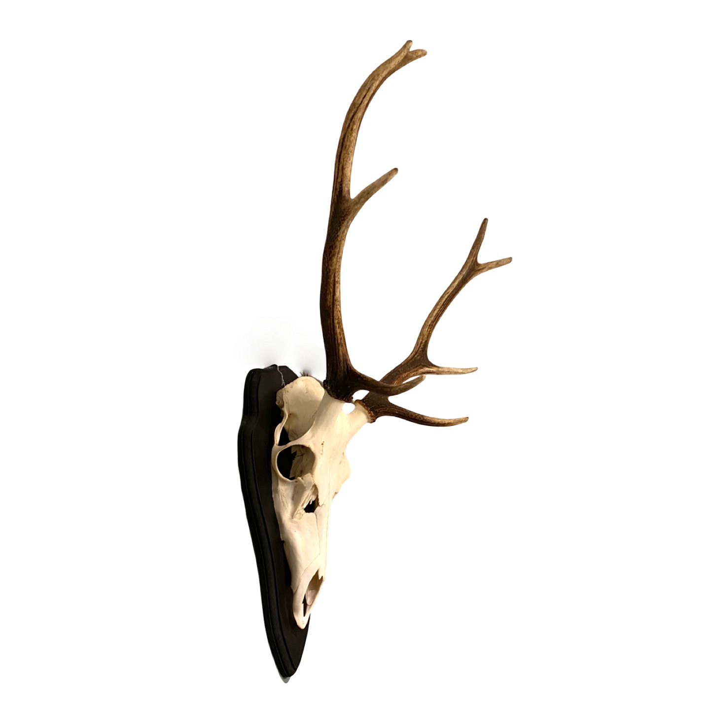 Jagttrofæ af Kronhjort monteret på plade.H. 80 cm.