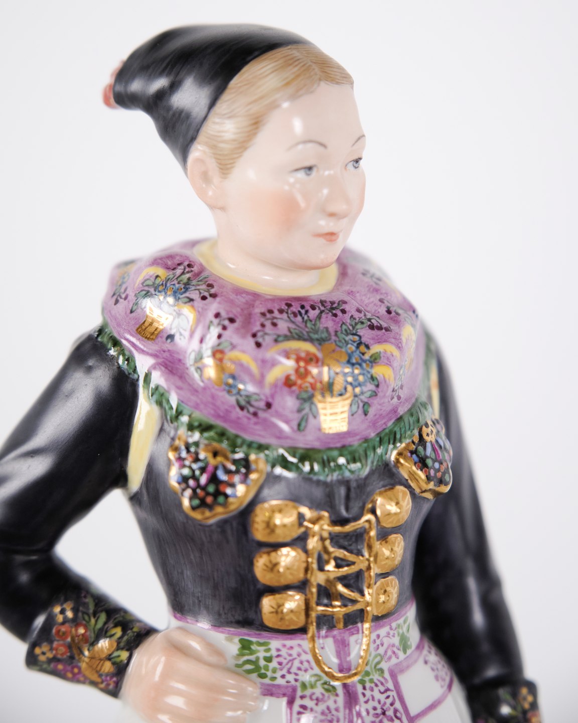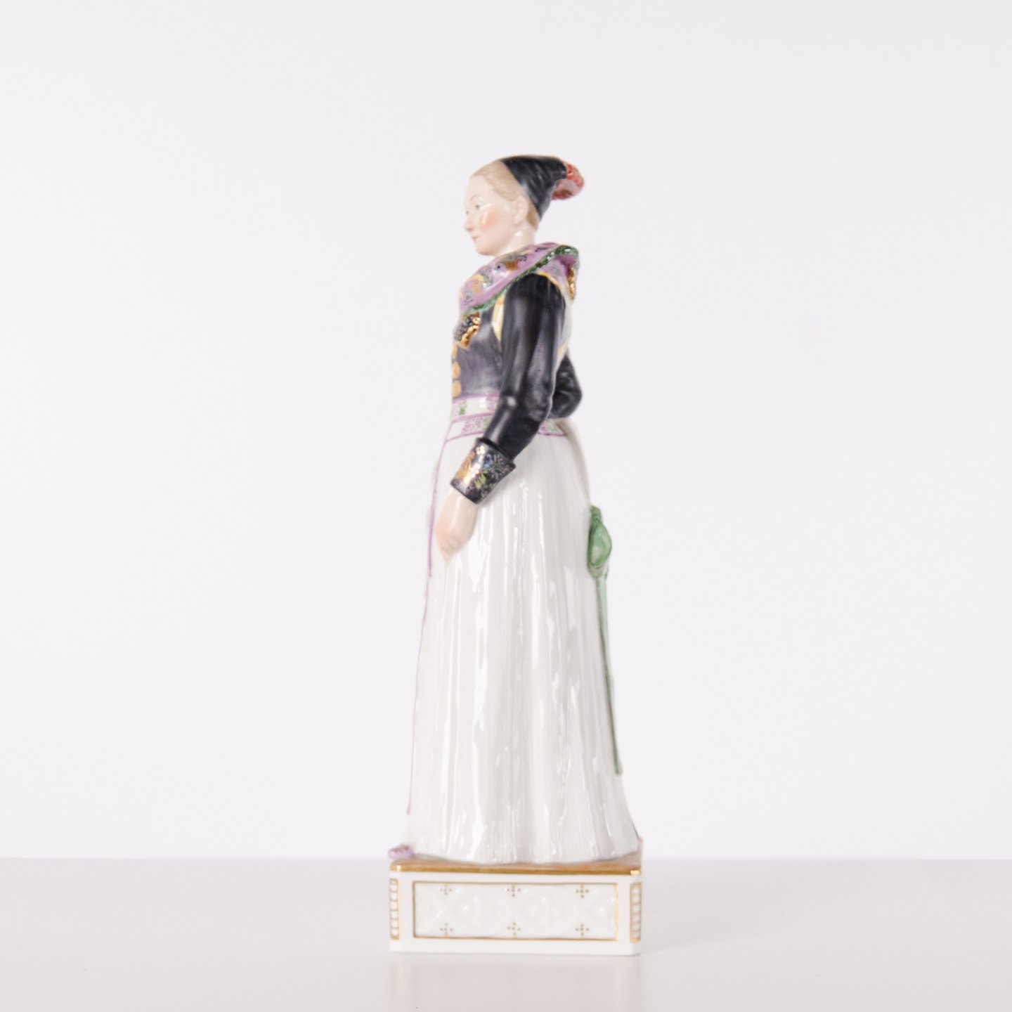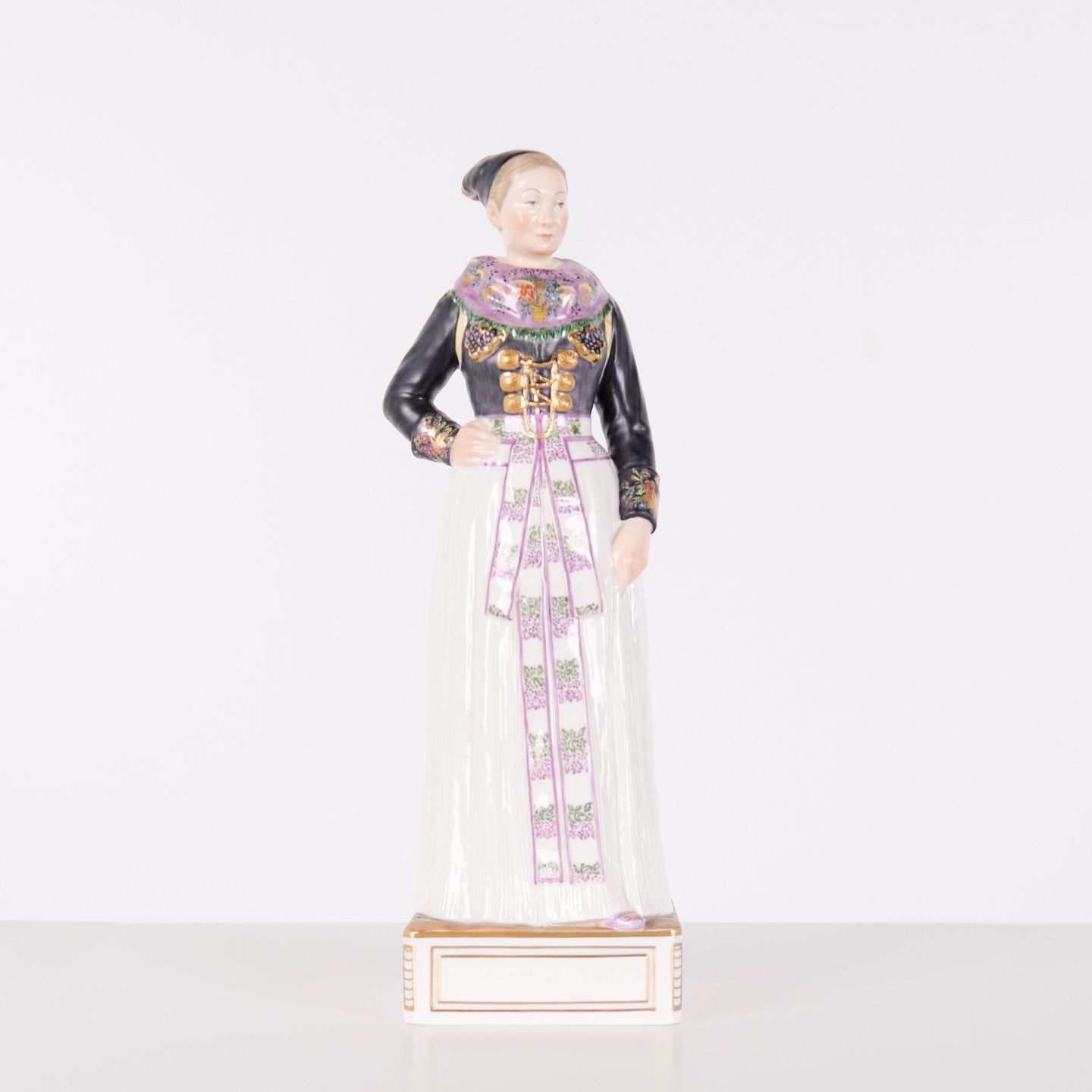 Überglasur-Porzellanfigur in dänischer Nationaltracht, Modell 12104, mit Darstellung einer Kochtracht aus Amager. Entworfen von Carl Martin-Hansen (1877–1941) für Royal Copenhagen und Teil der Serie Dänische Nationaltrachten.Die Serie umfasst insgesamt 47 Figuren und wurde im Zeitraum 1906–1925 produziert. Carl Martin-Hansen war für seine Figuren, Büsten und öffentlichen Denkmäler bekannt und gehörte zur naturalistischen Tradition der dänischen Kunst um die Jahrhundertwende. Die Serie der dänischen Nationaltrachten gilt als eines seiner bedeutendsten Werke für Royal Copenhagen und zeichnet sich durch eine detailreiche und präzise Wiedergabe regionaler Trachten aus.