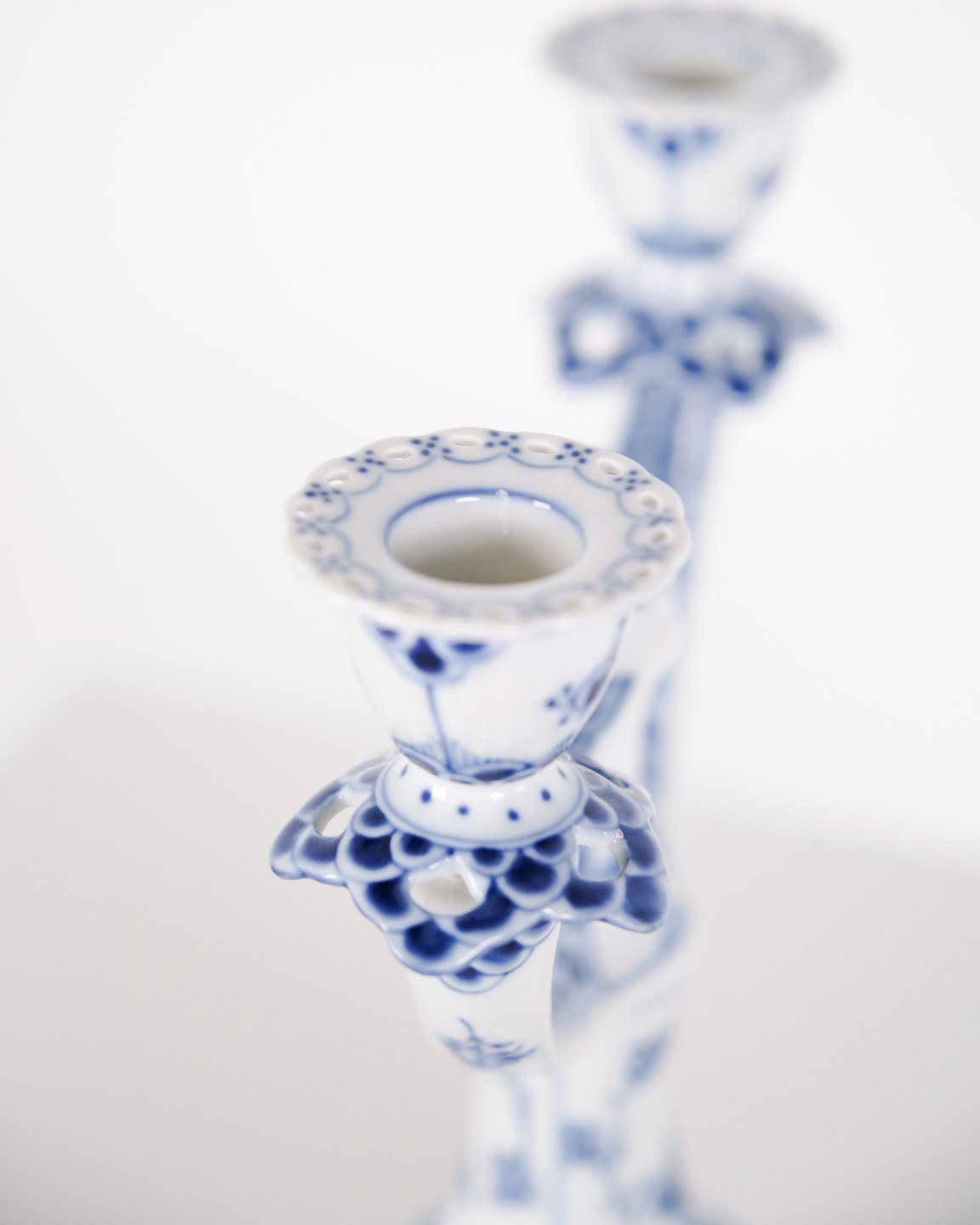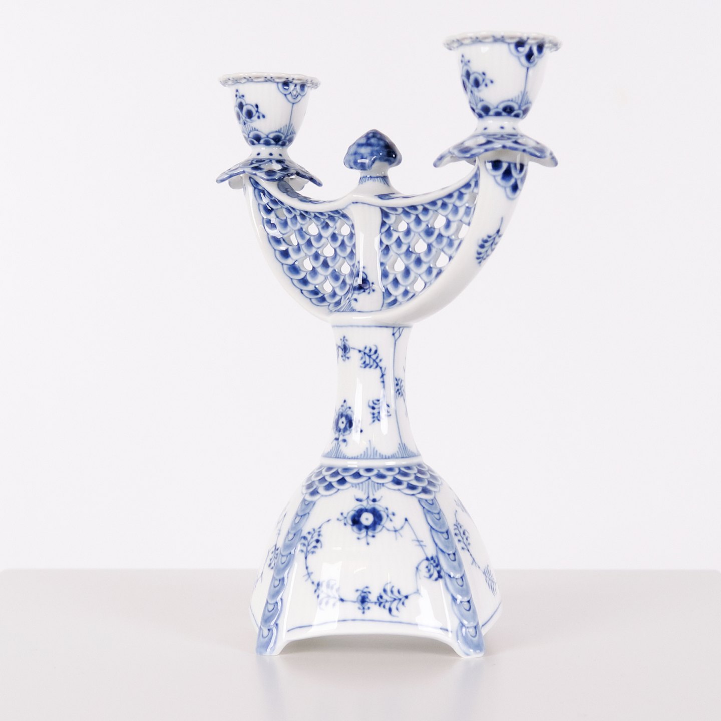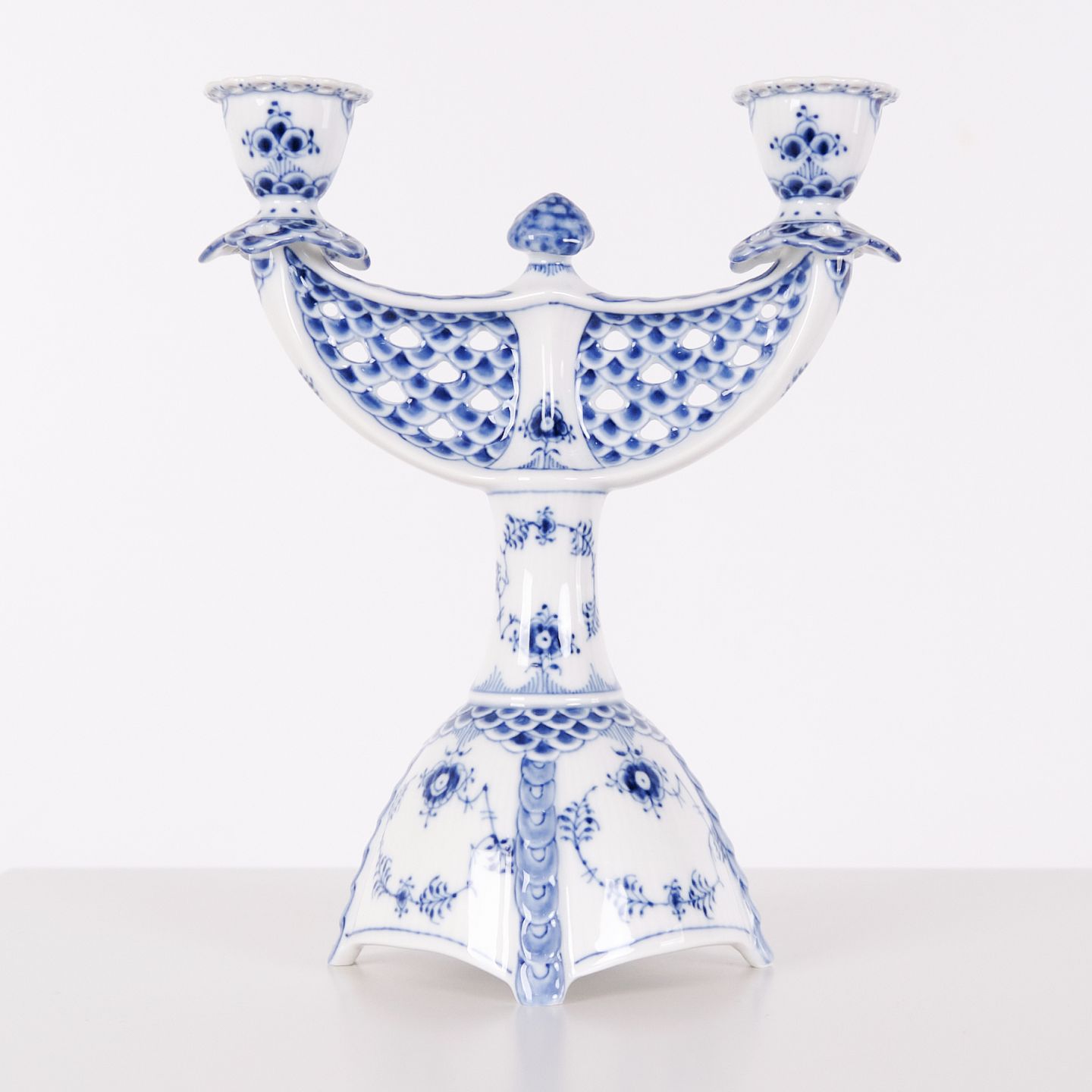 Zweiarmiger Kerzenleuchter aus Porzellan mit Musselmalet Vollspitze, Modell 1169, hergestellt von Royal Copenhagen. Handbemaltes Porzellan mit charakteristischem durchbrochenem Spitzenrand und Unterglasurdekoration. Als 1. Wahl gefertigt und Teil der klassischen Serviceproduktion von Royal Copenhagen.— Hersteller: Royal Copenhagen