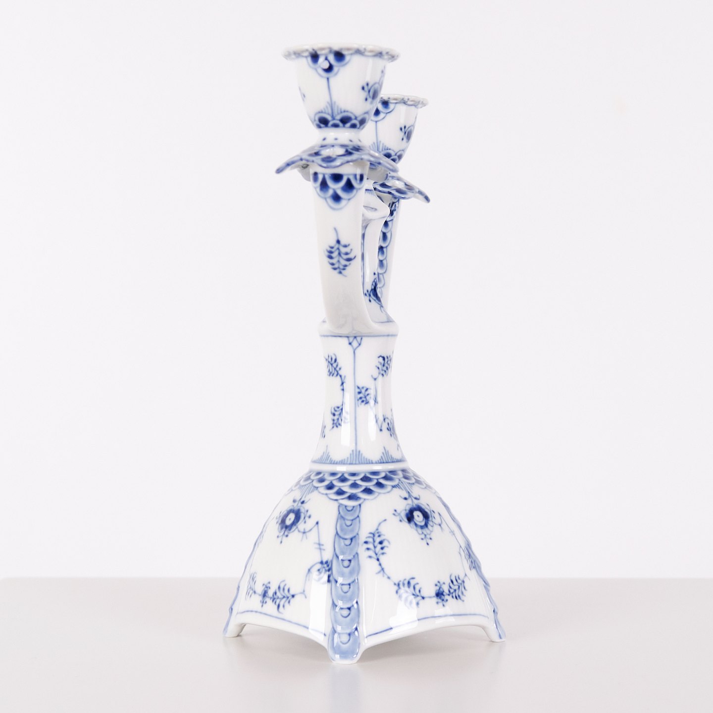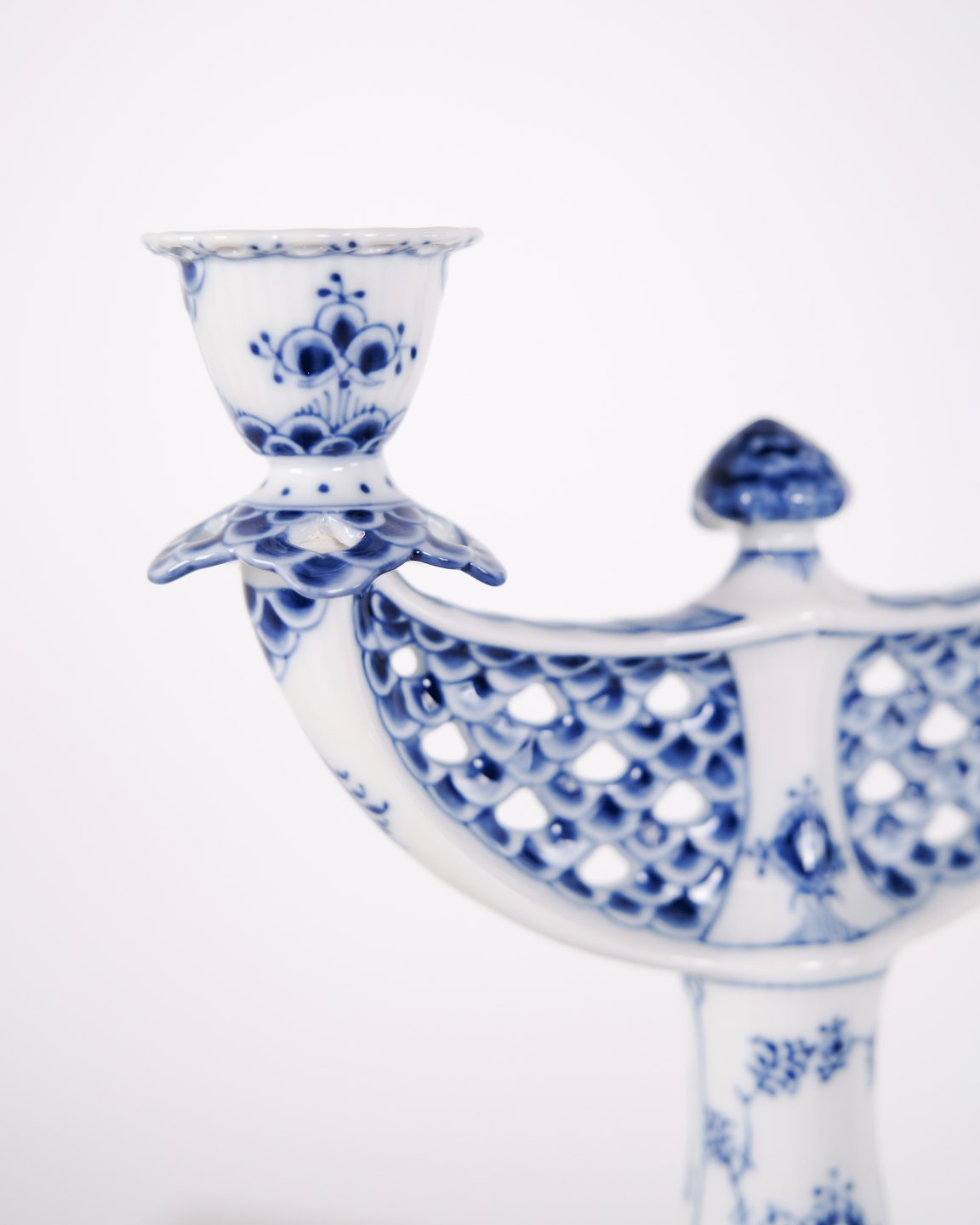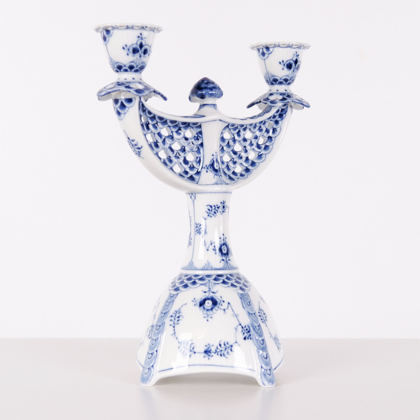 Zweiarmiger Kerzenleuchter aus Porzellan mit Musselmalet Vollspitze, Modell 1169, hergestellt von Royal Copenhagen. Handbemaltes Porzellan mit charakteristischem durchbrochenem Spitzenrand und Unterglasurdekoration. Als 1. Wahl gefertigt und Teil der klassischen Serviceproduktion von Royal Copenhagen.— Hersteller: Royal Copenhagen