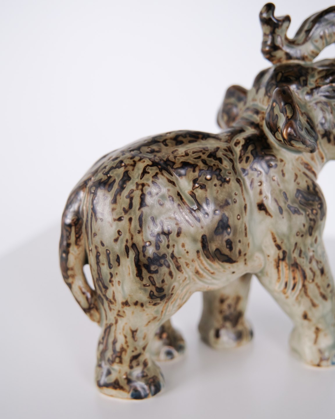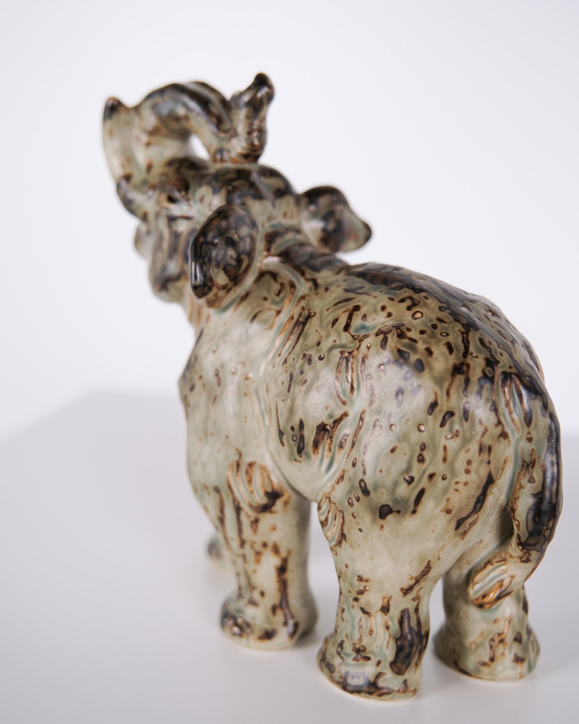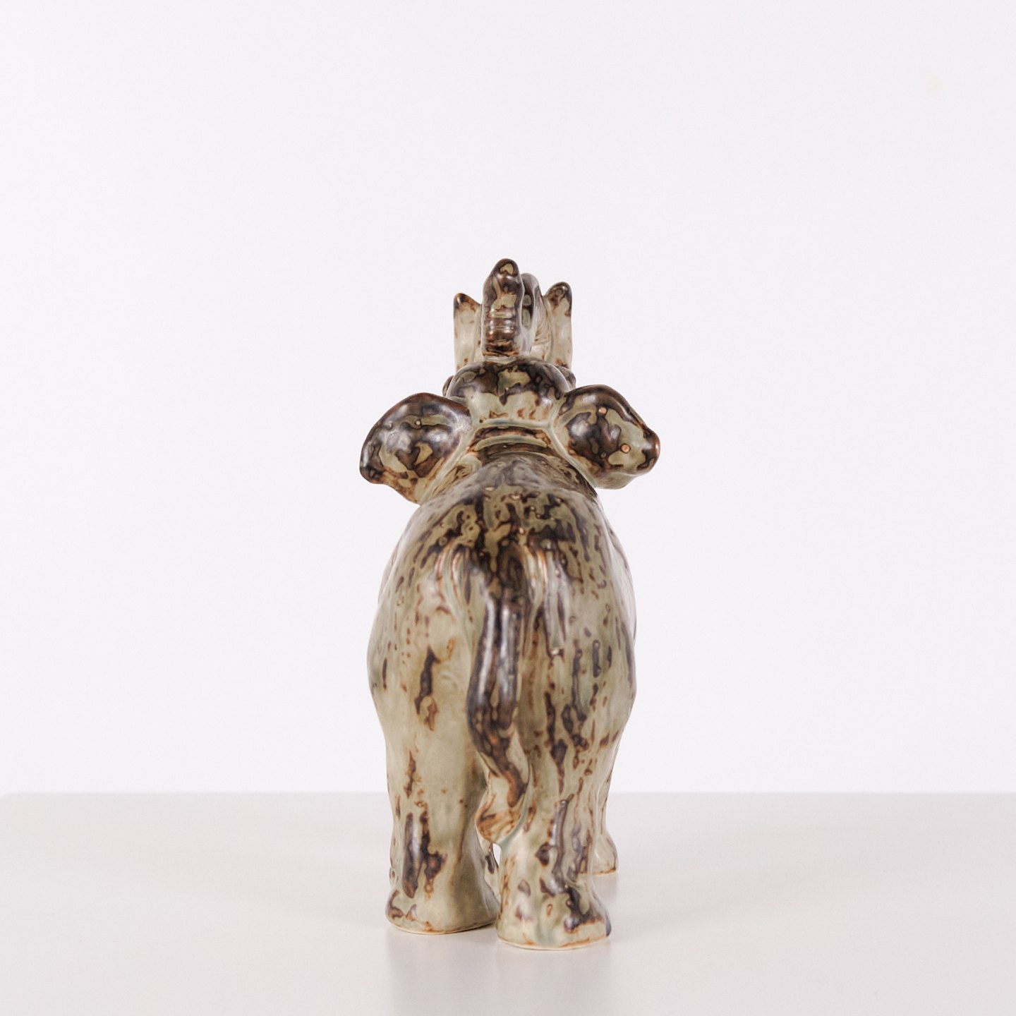 Steinzeugfigur in Form eines stehenden Elefanten, Modell 21517, entworfen von Knud Kyhn für Royal Copenhagen. Die Figur wurde aus Steinzeug gefertigt und gehört zu Knud Kyhns bekannten Tierdarstellungen, die bei Royal Copenhagen vor allem ab den 1930er-Jahren produziert wurden. Kyhns Arbeiten sind für ihre klare Formgebung und materialbetonte Ausführung bekannt und werden von Sammlern dänischer Keramik geschätzt.Lager: 1