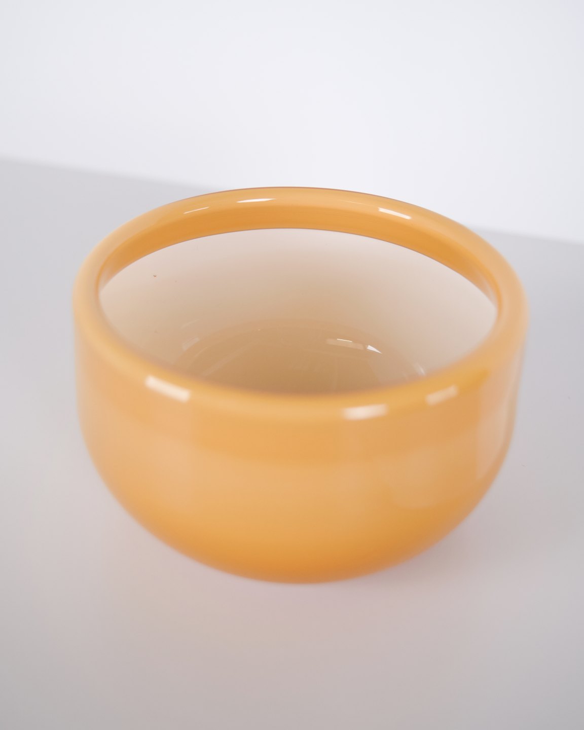 Glasschale aus der Serie Palet, entworfen von Michael Bang für Holmegaard. Die Schale ist aus Glas gefertigt und zeigt einen gelb-karamellfarbenen Ton. Die Palet-Serie wurde bei Holmegaard in der zweiten Hälfte des 20. Jahrhunderts produziert und ist heute im Bereich des dänischen Glasdesigns gefragt.— Designer: Michael Bang