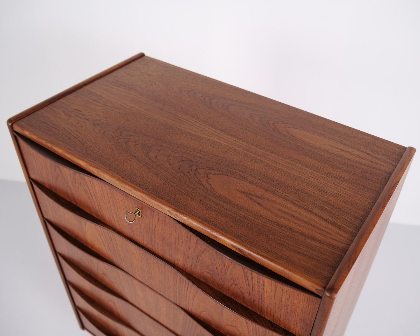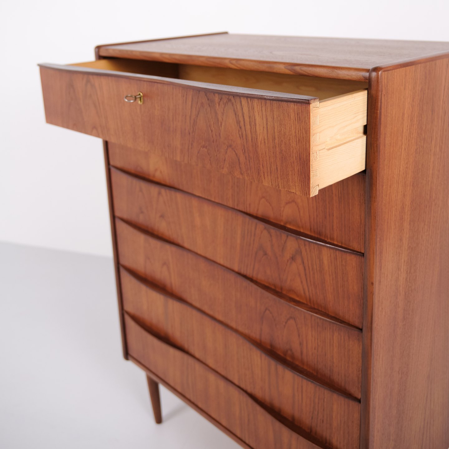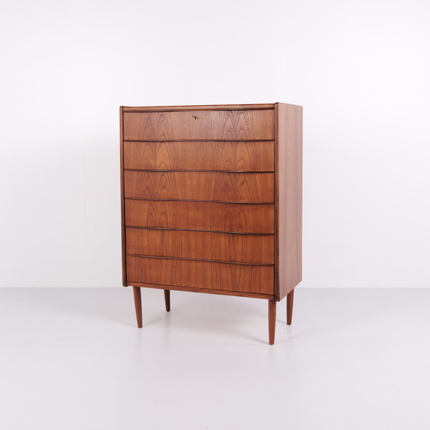 Kommode aus Teakholz mit sechs Schubladen und originalen Griffen. Das Möbelstück ist ein Beispiel für dänisches Möbeldesign der 1950er-Jahre mit Fokus auf Funktionalität, Stauraum und Materialqualität. Durch die hohe Form eignet sich die Kommode für Schlafzimmer, Flur oder Wohnbereich.— Material: Teakholz