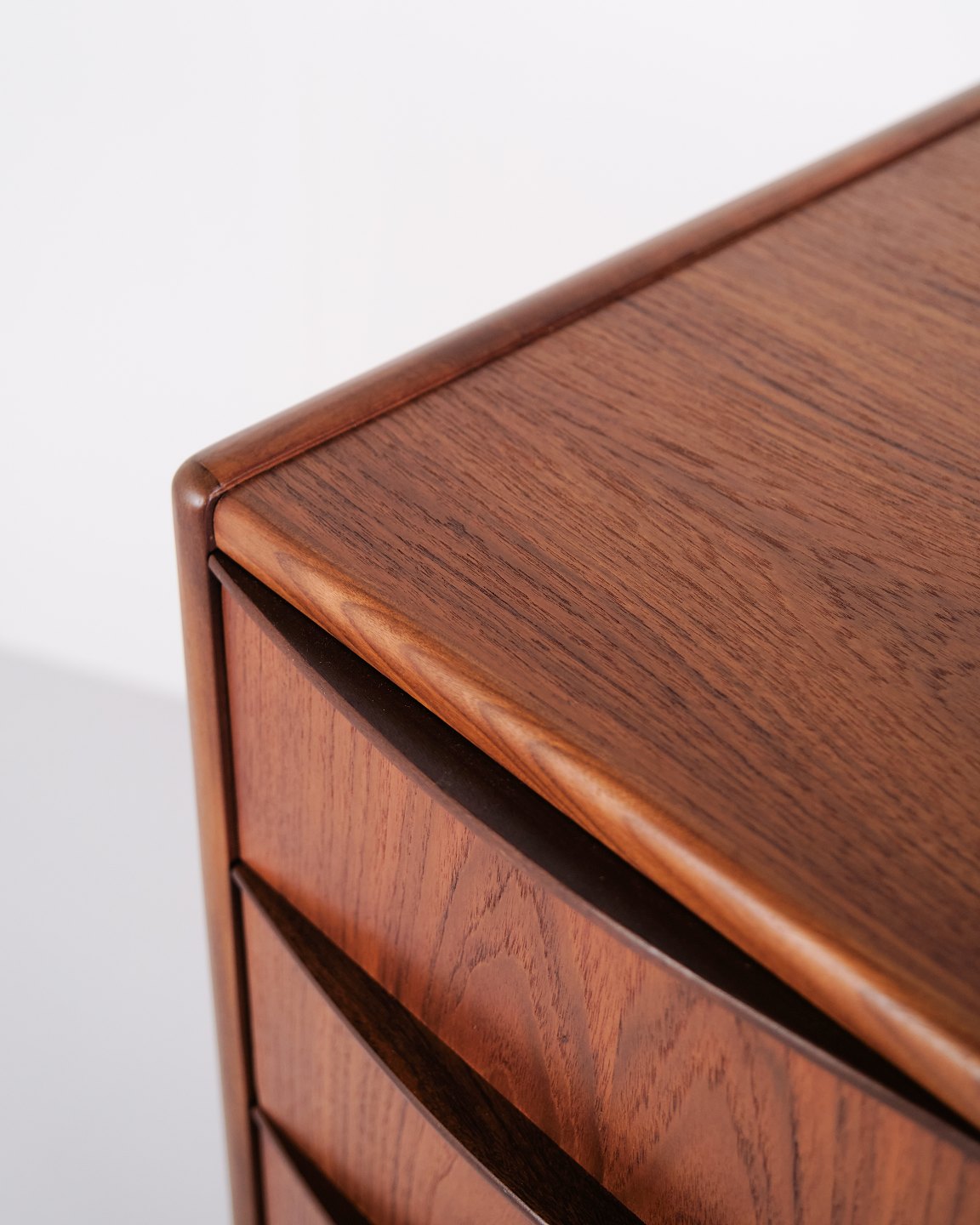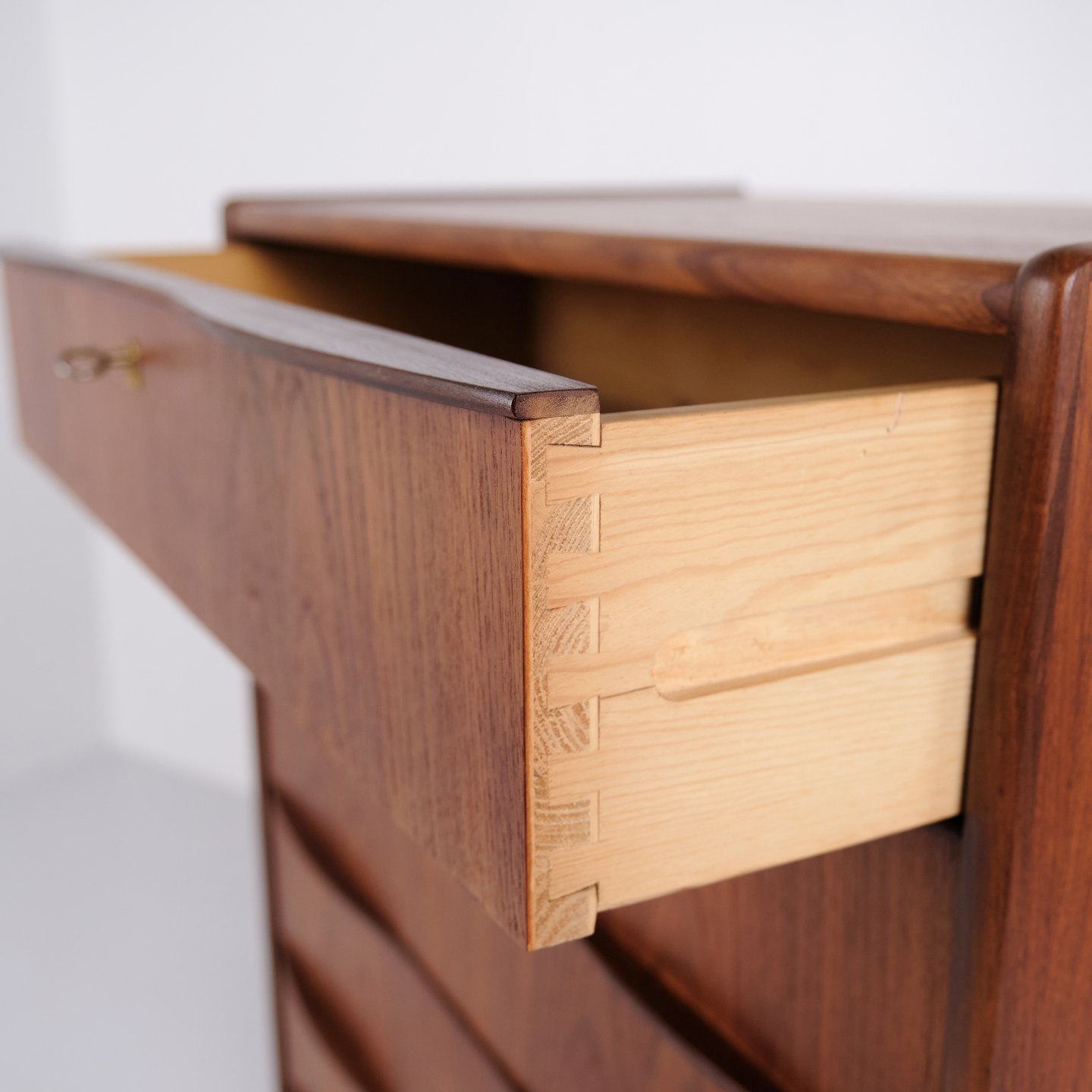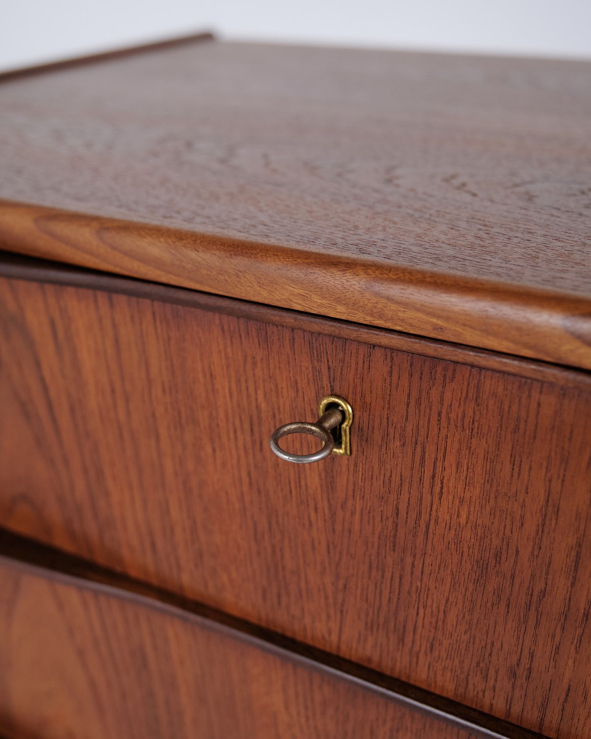 Kommode aus Teakholz mit sechs Schubladen und originalen Griffen. Das Möbelstück ist ein Beispiel für dänisches Möbeldesign der 1950er-Jahre mit Fokus auf Funktionalität, Stauraum und Materialqualität. Durch die hohe Form eignet sich die Kommode für Schlafzimmer, Flur oder Wohnbereich.— Material: Teakholz
