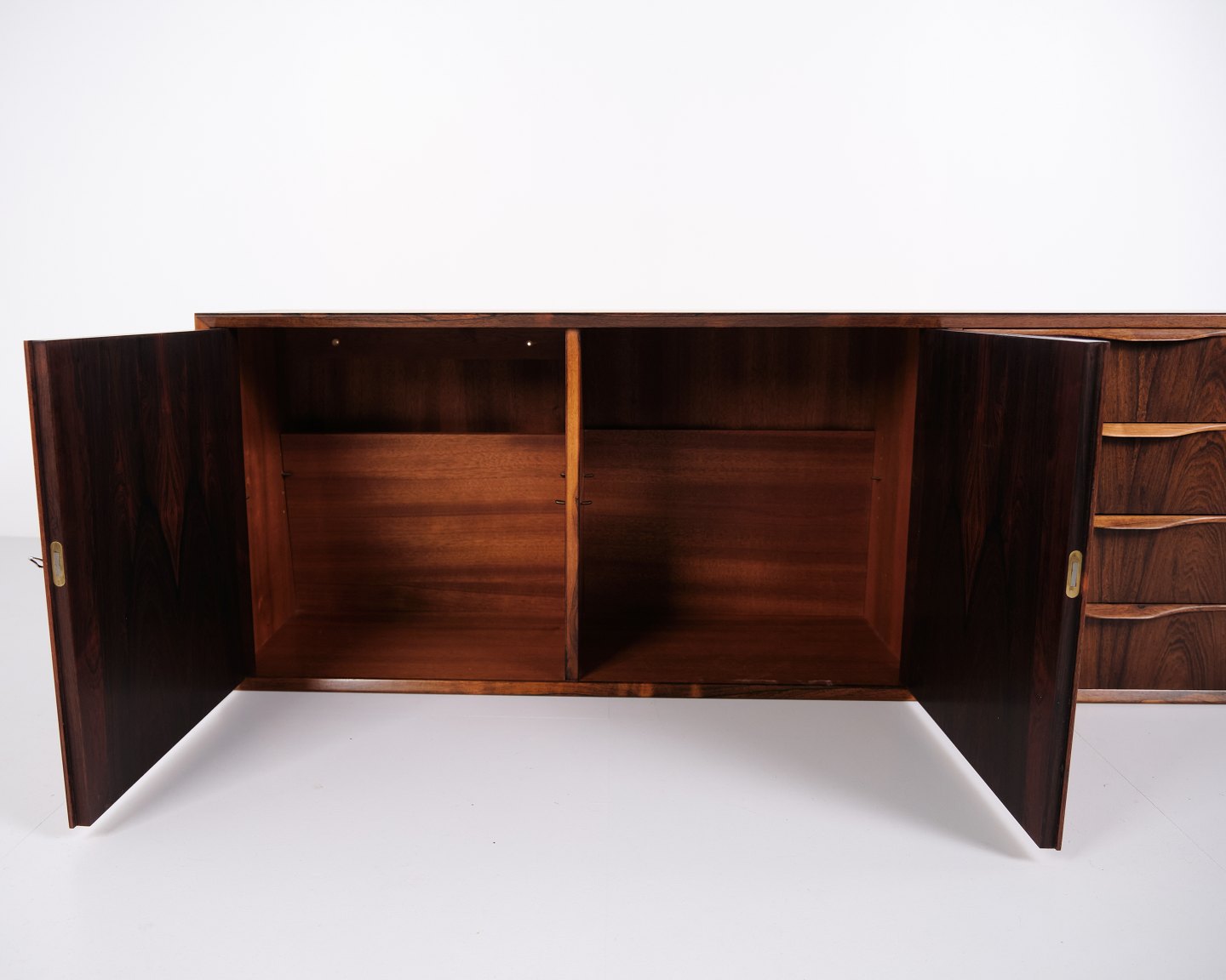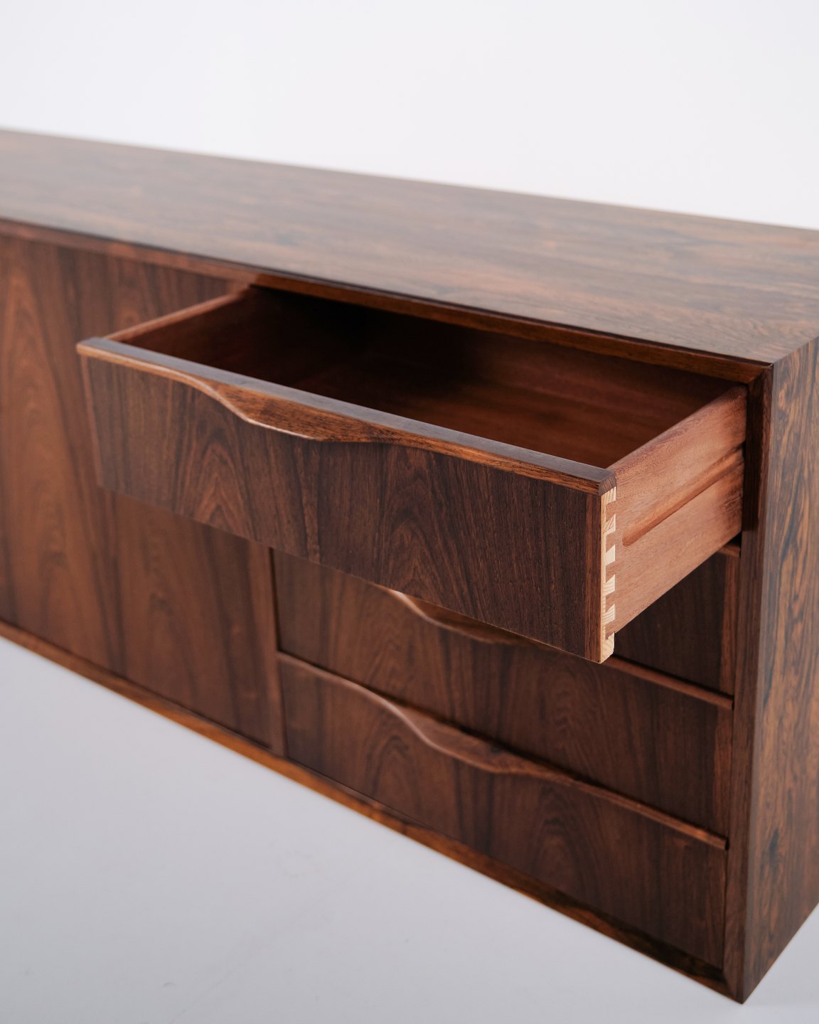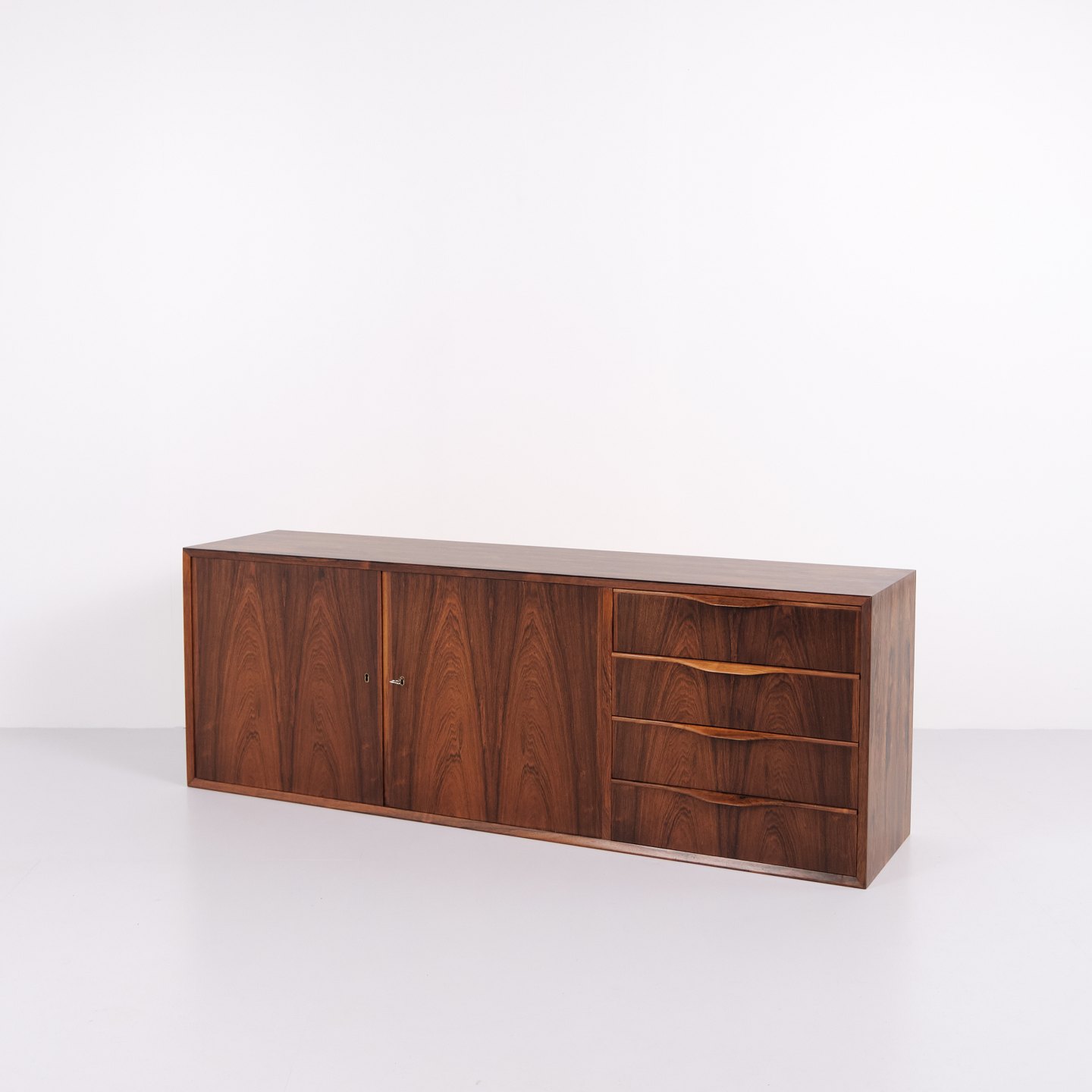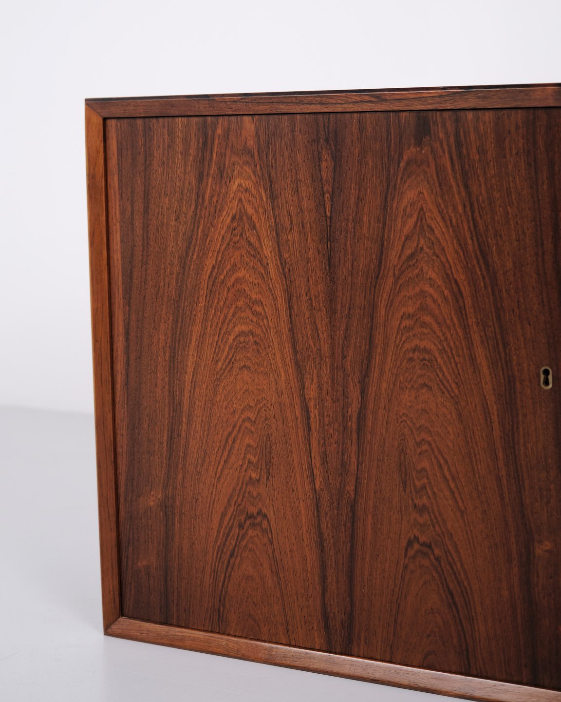 Wandhängendes Sideboard aus Palisander, entworfen von Erling Torvits und hergestellt von Klim Møbelfabrik in den 1950er-Jahren. Die wandhängende Konstruktion entspricht dem funktionalen dänischen Möbeldesign der Zeit und sorgt für eine leichte, platzsparende Wirkung. Die Ausführung in Palisander betont die handwerkliche Qualität.— Designer: Erling Torvits