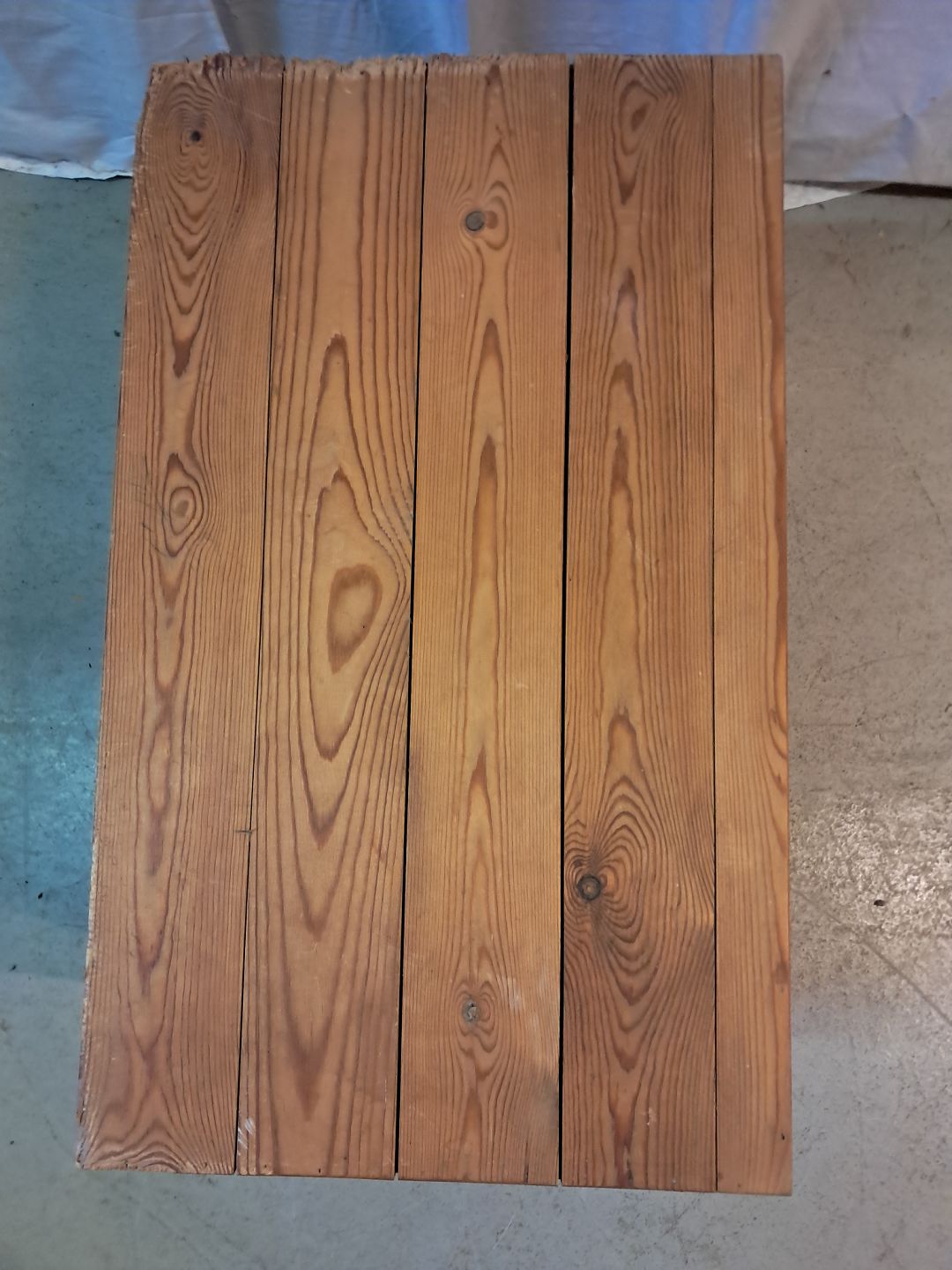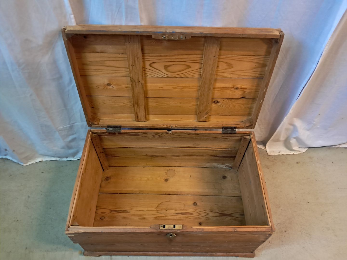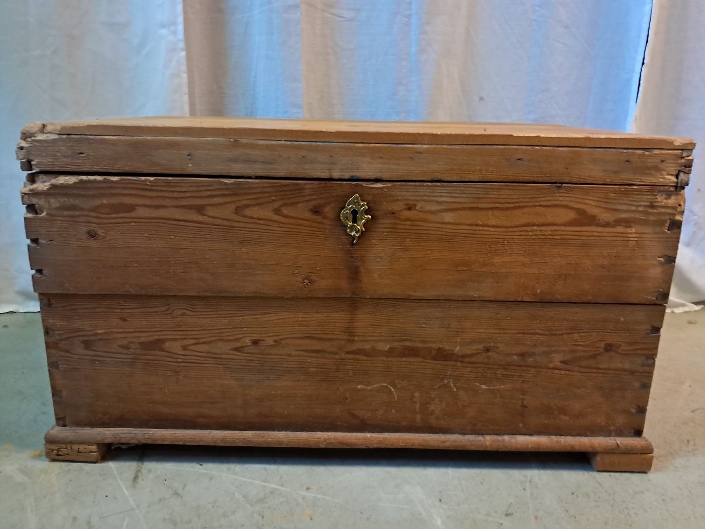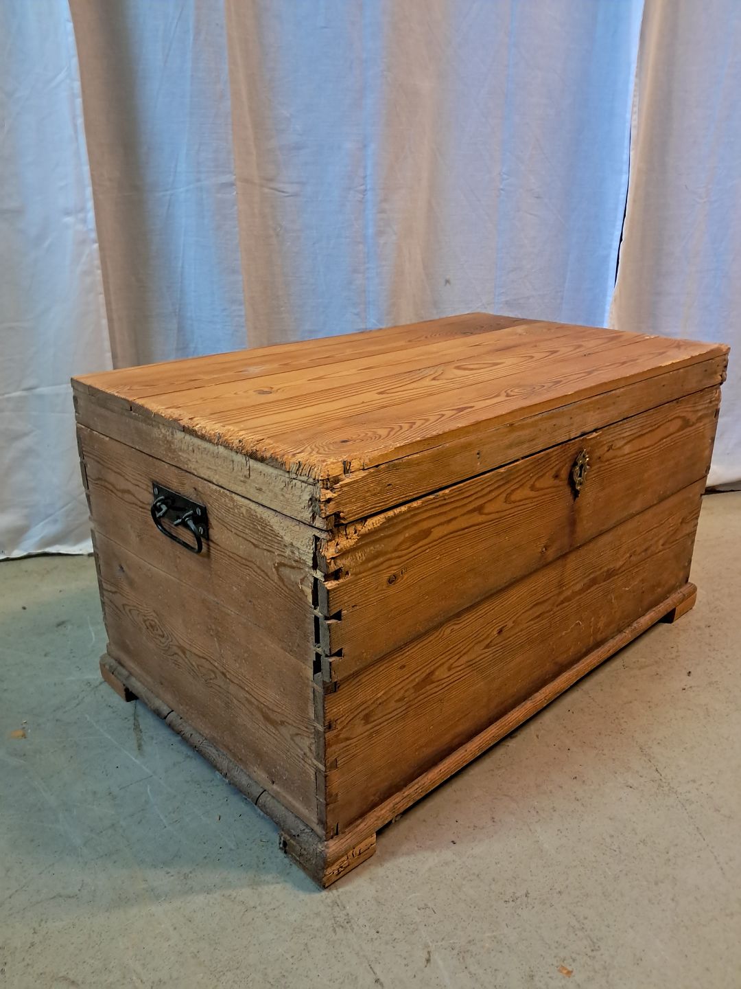 Kiste i massivt fyrretræ, fra 1910erne.Den har brugsspor og skal limes, der med følger ikke nøgle.