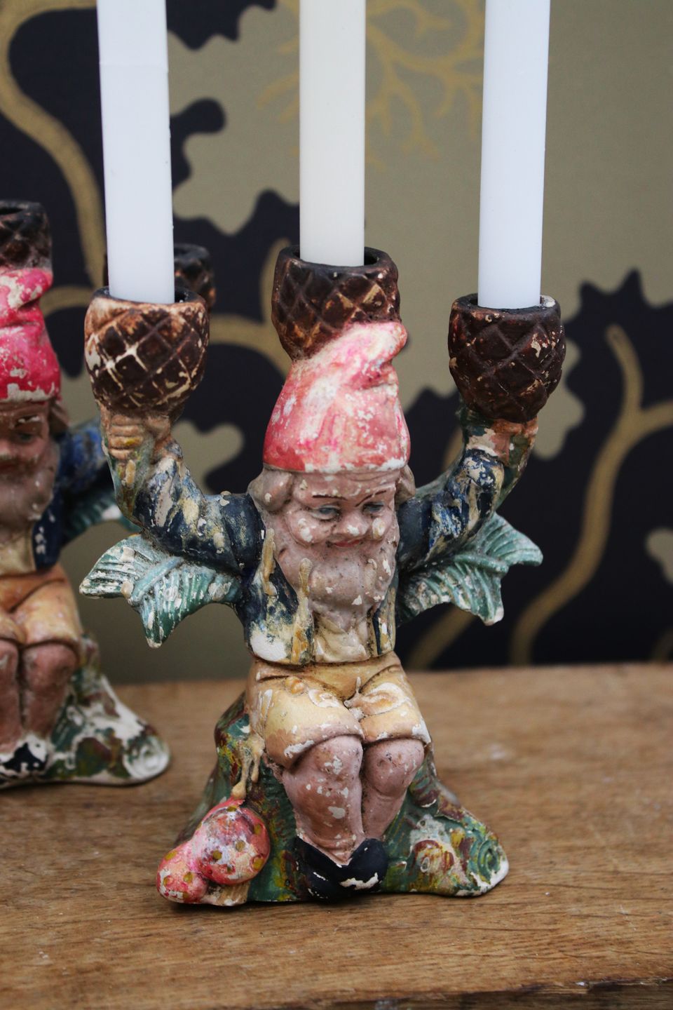 Gammel julestage i form af julenisse i bemalet gips siddende på træstub og bære 3 små julelys...