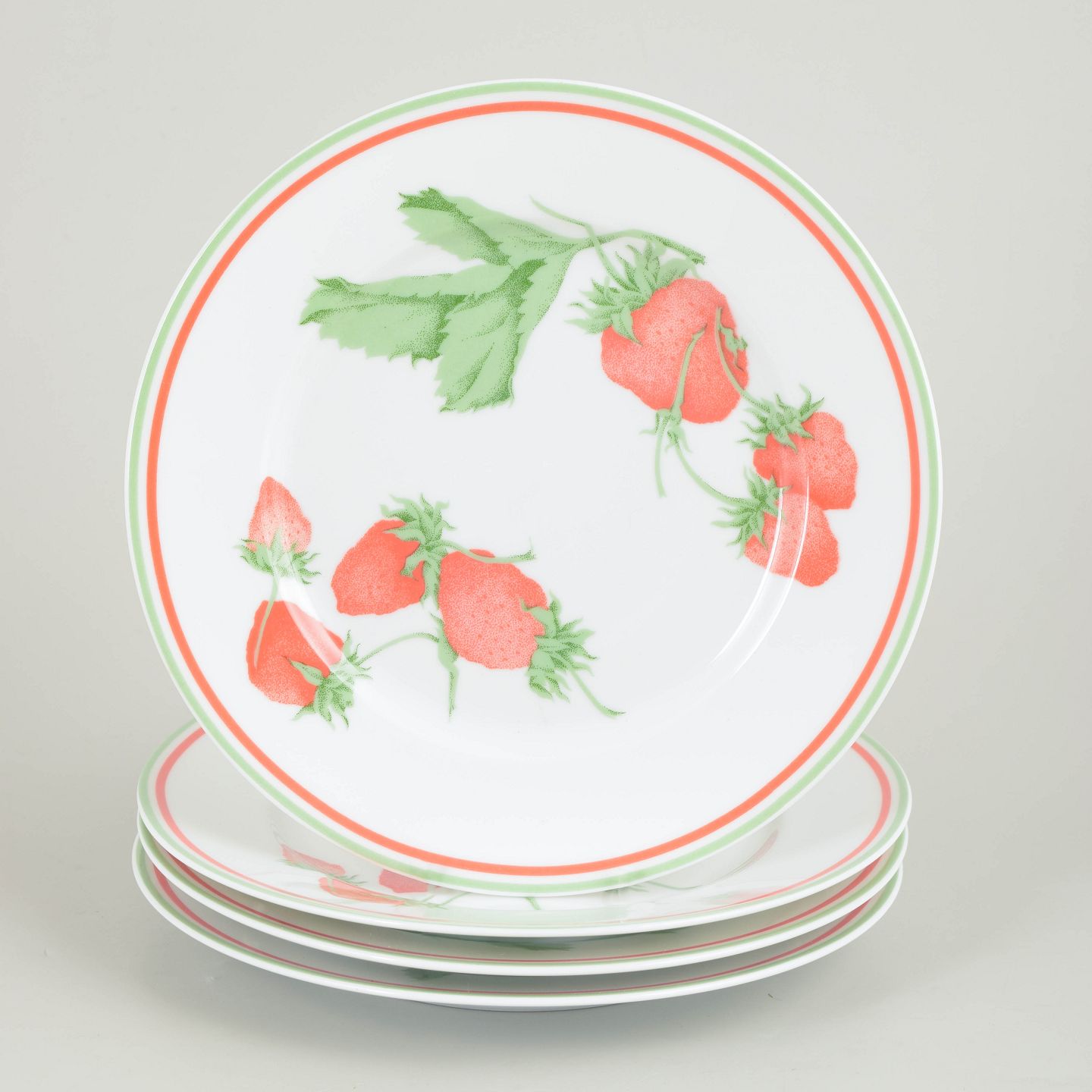 Bill Goldsmith for Limoges, Fraise, sæt på 4 frokosttallerkener.Sæt med fire frokosttallerkener i porcelæn med dekoration af jordbær og blade samt grøn og rød kant i serien Fraise.