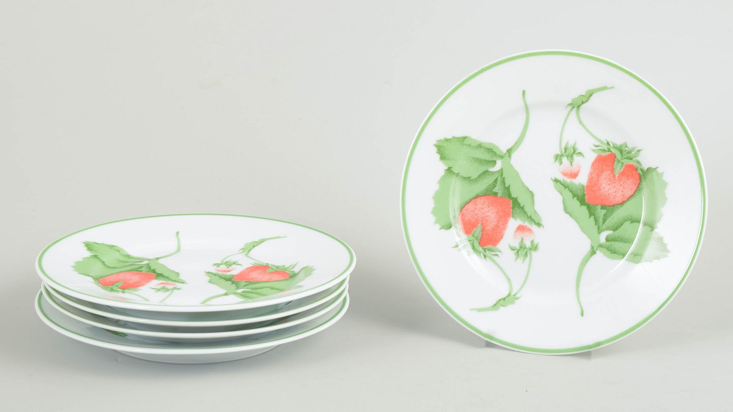 Bill Goldsmith for Limoges, Fraise, sæt på 5 tallerkener.Sæt med fem mindre tallerkener i porcelæn med dekoration af jordbær og blade i serien Fraise.