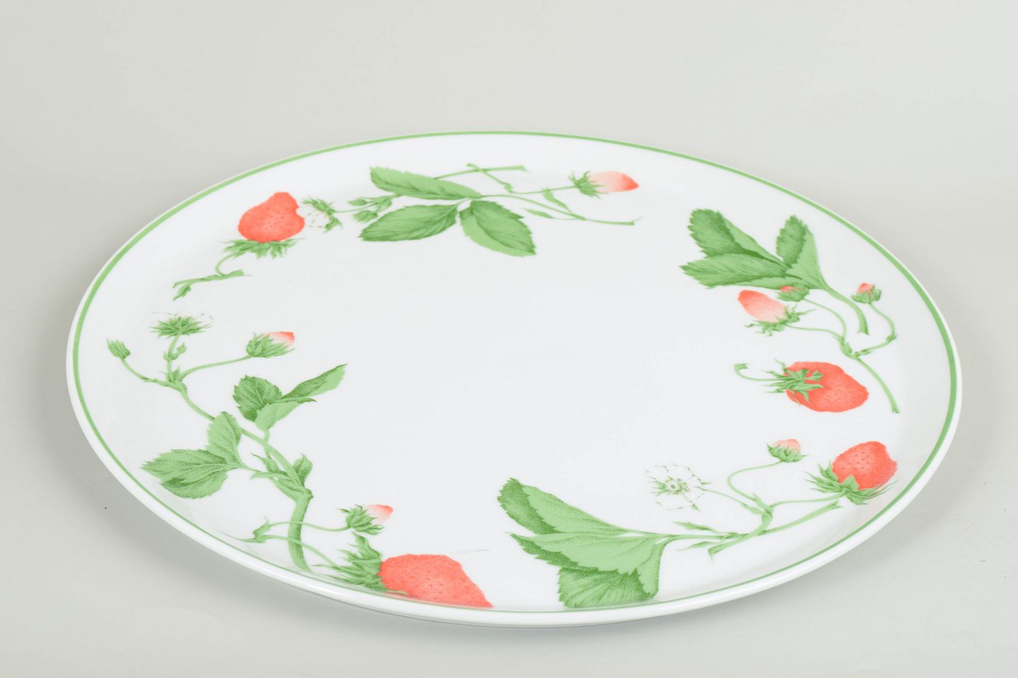 Bill Goldsmith for Limoges, Fraise, stort serveringsfad.Stort rundt serveringsfad, lagkagefad i porcelæn med dekoration af jordbær og blade langs kanten i serien Fraise.