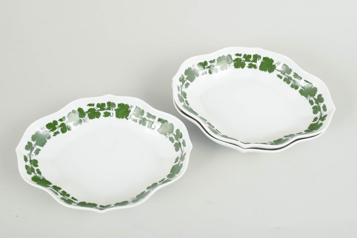 Meissen, sæt med tre små serveringsfade fra den grønne vinløvsserie.Sæt bestående af tre små serveringsfade i porcelæn med grøn vinranke- og vinløvsdekoration langs fanen; fra den grønne vinløvsserie.