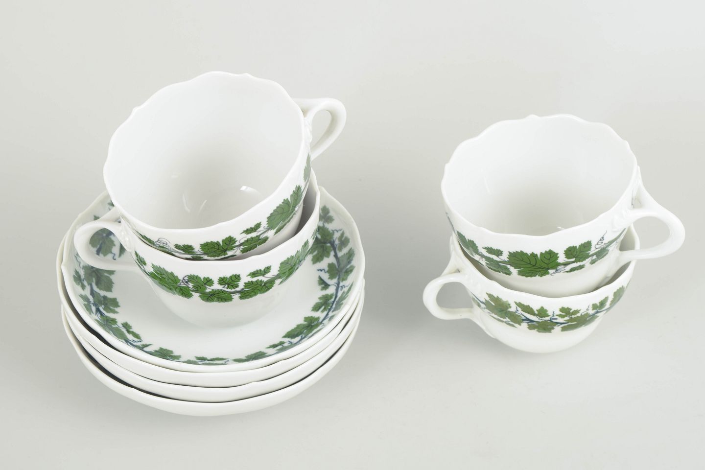 Meissen, kaffesæt til fire personer fra den grønne vinløvsserie.Kaffesæt i porcelæn bestående af fire kopper og fire underkopper med grøn vinranke- og vinløvsdekoration langs kanten; fra den grønne vinløvsserie.