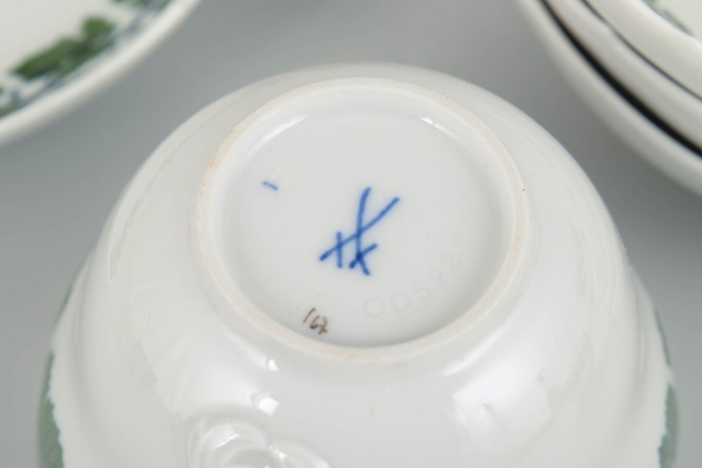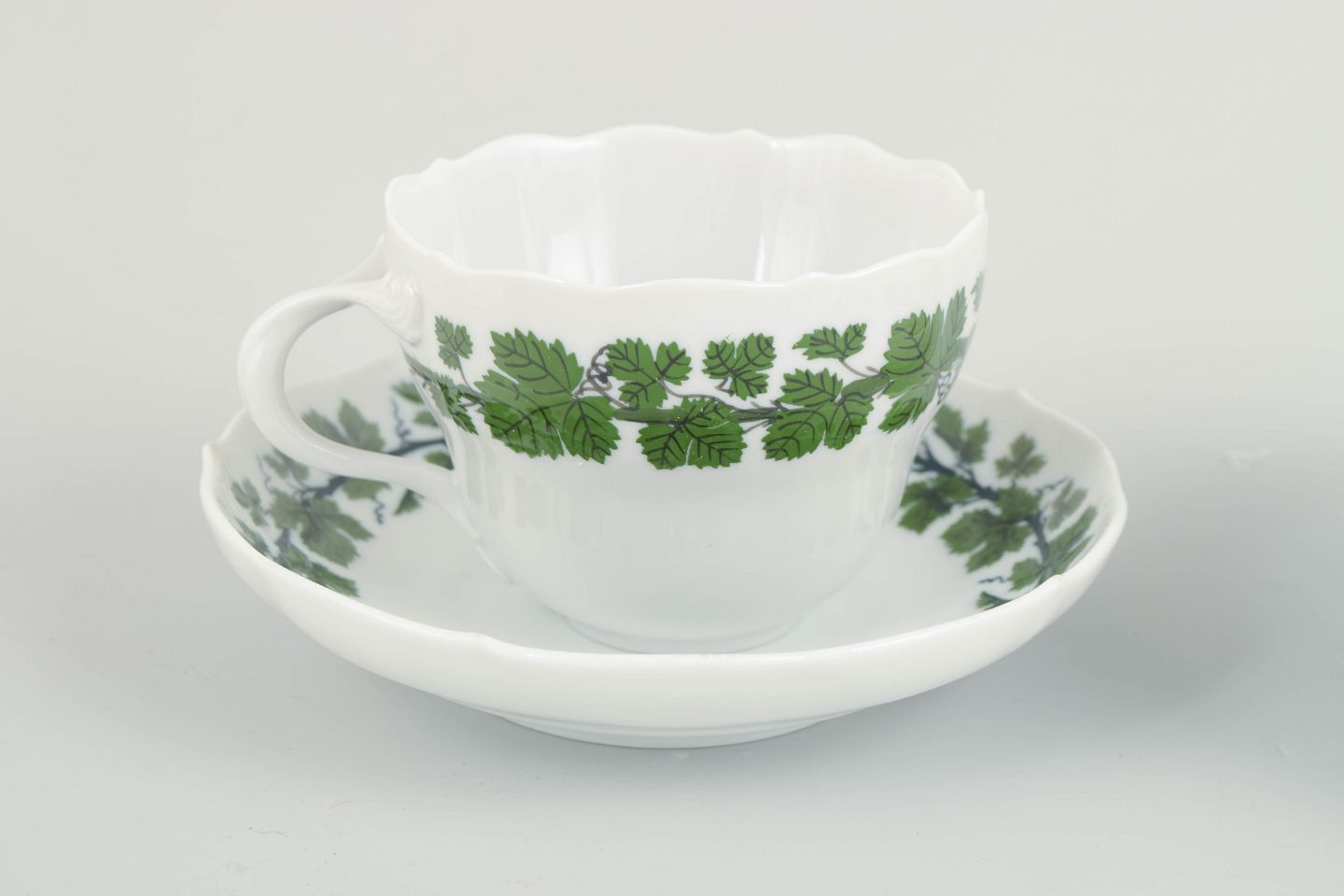 Meissen er Europas ældste porcelænsmanufaktur, grundlagt i 1710, og kendt for sin høje kvalitet og håndmalede dekorationer. Serien med grønne vinranker og vinblade er et klassisk bordmotiv, hvor den lette, botaniske ornamentik kombineres med porcelænets rene, elegante form.
