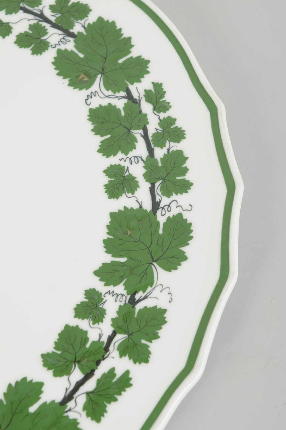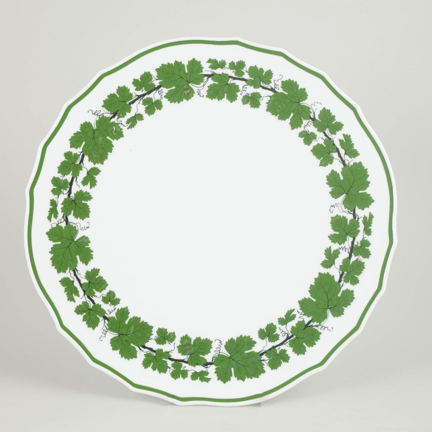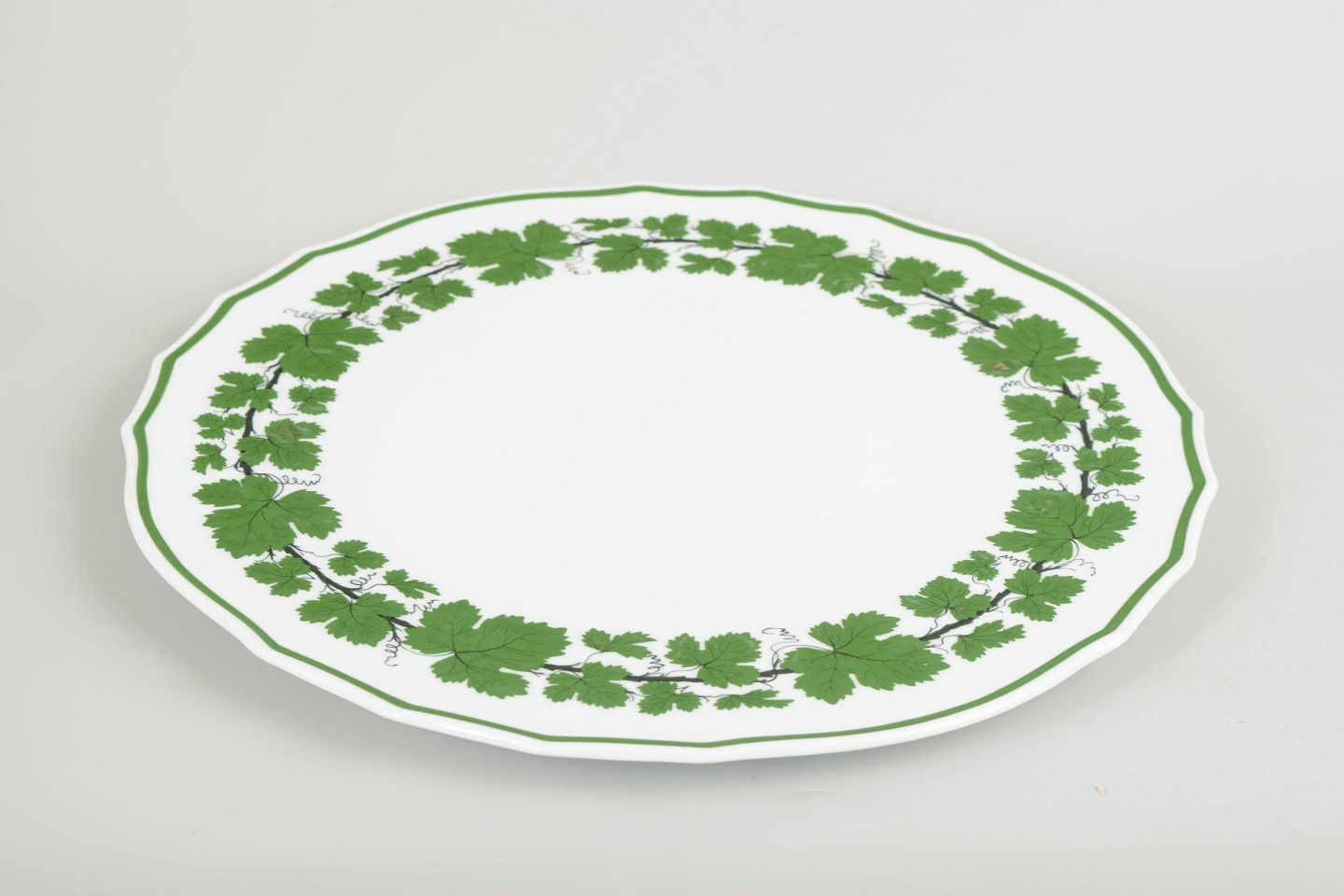 Meissen, stort lagkagefad fra den grønne vinløvsserie.Stort rundt kagefad i porcelæn med grøn vinranke- og vinløvsdekoration langs fanen; fra den grønne vinløvsserie.