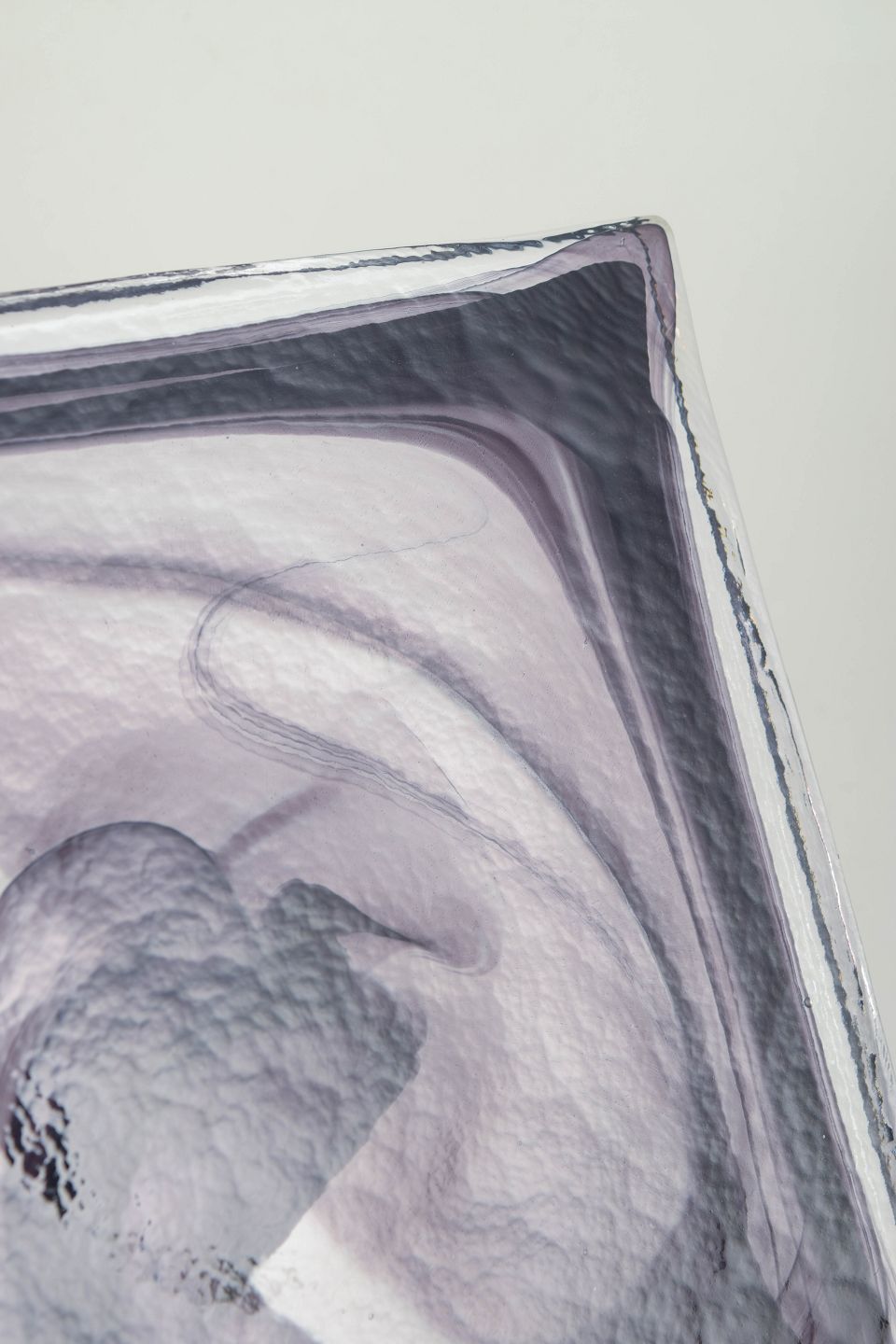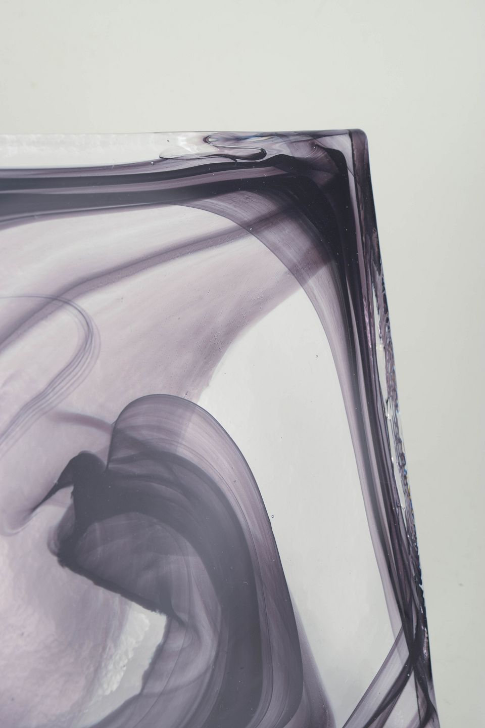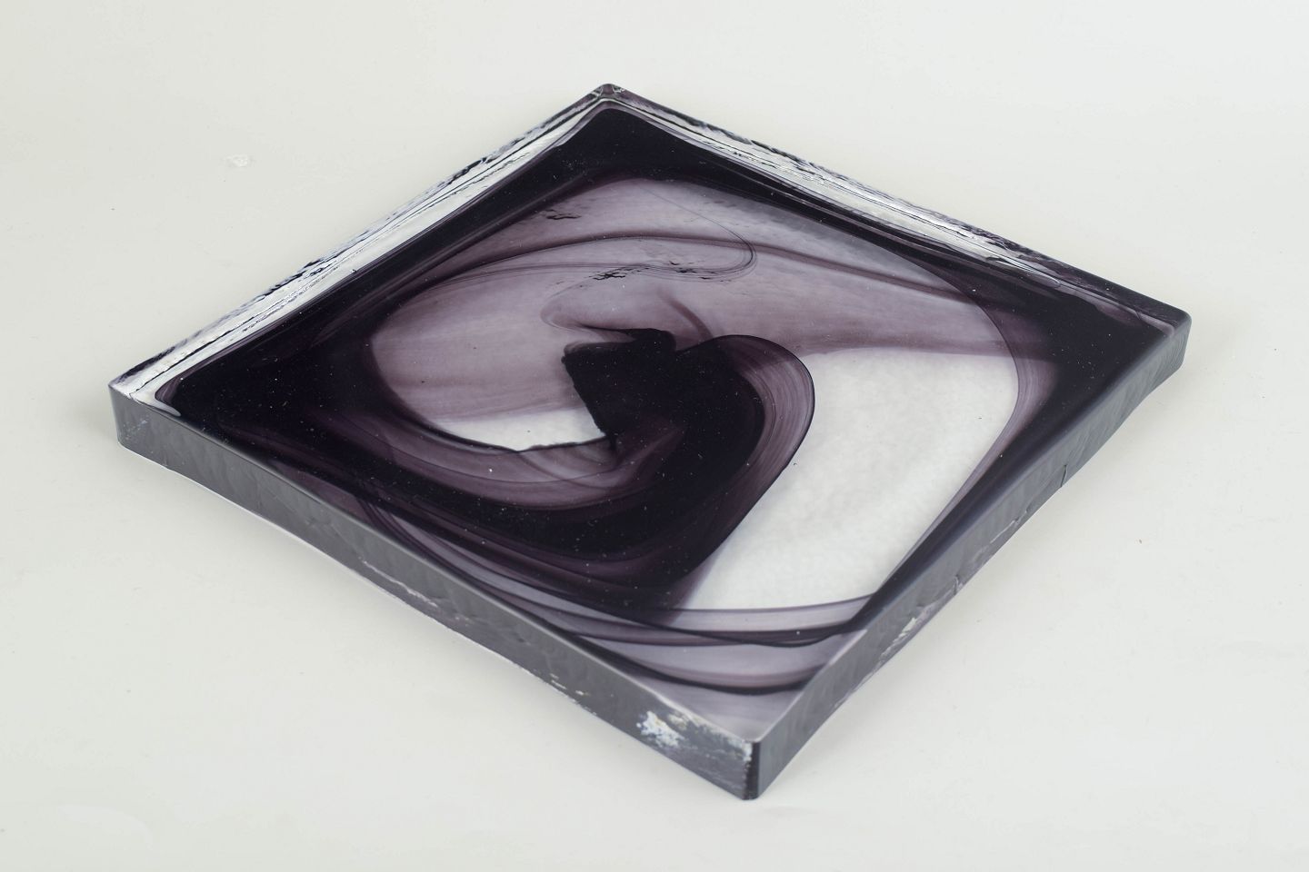 Kosta Boda, Cirrus Black, kunstglasobjekt.Fladt, kvadratisk objekt i klart glas med indkapslede, slyngede sorte og grå glastråde, der danner et abstrakt cirrus-lignende mønster. Modellen er kendt som Cirrus Black.