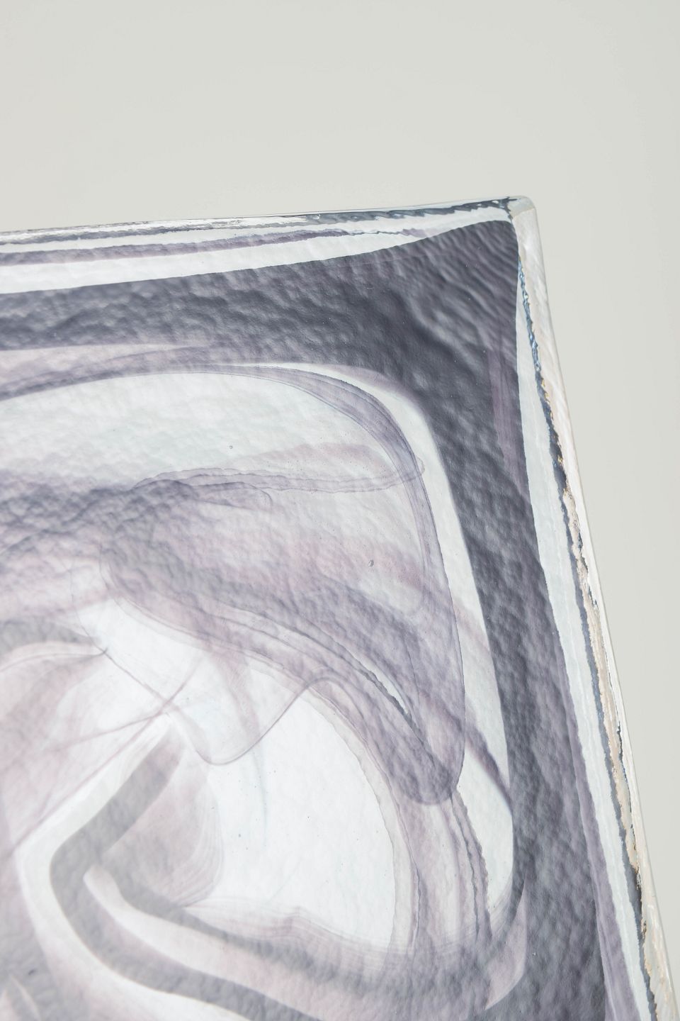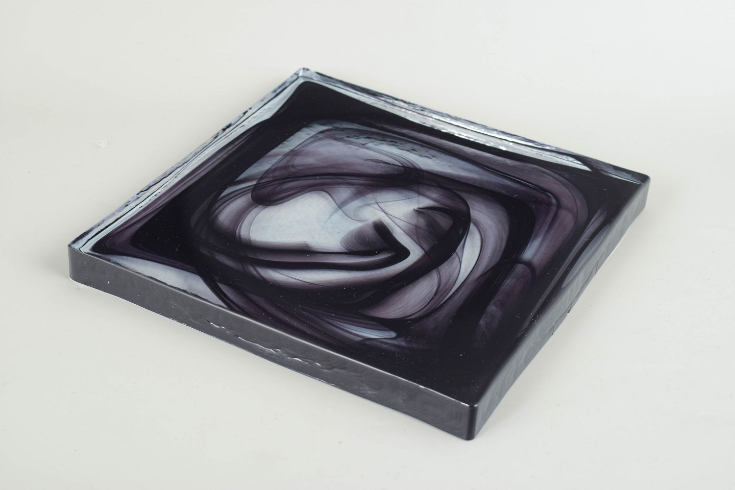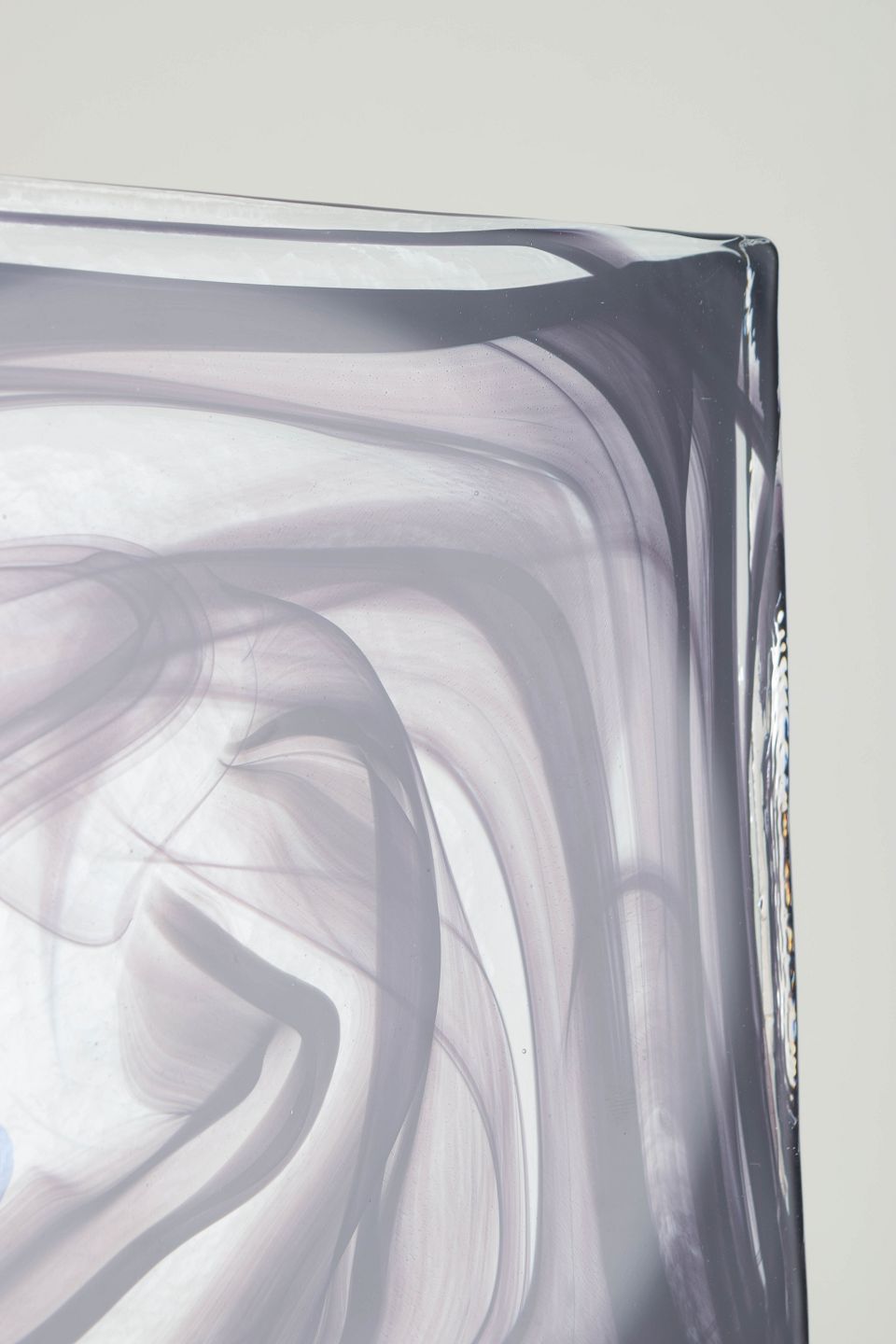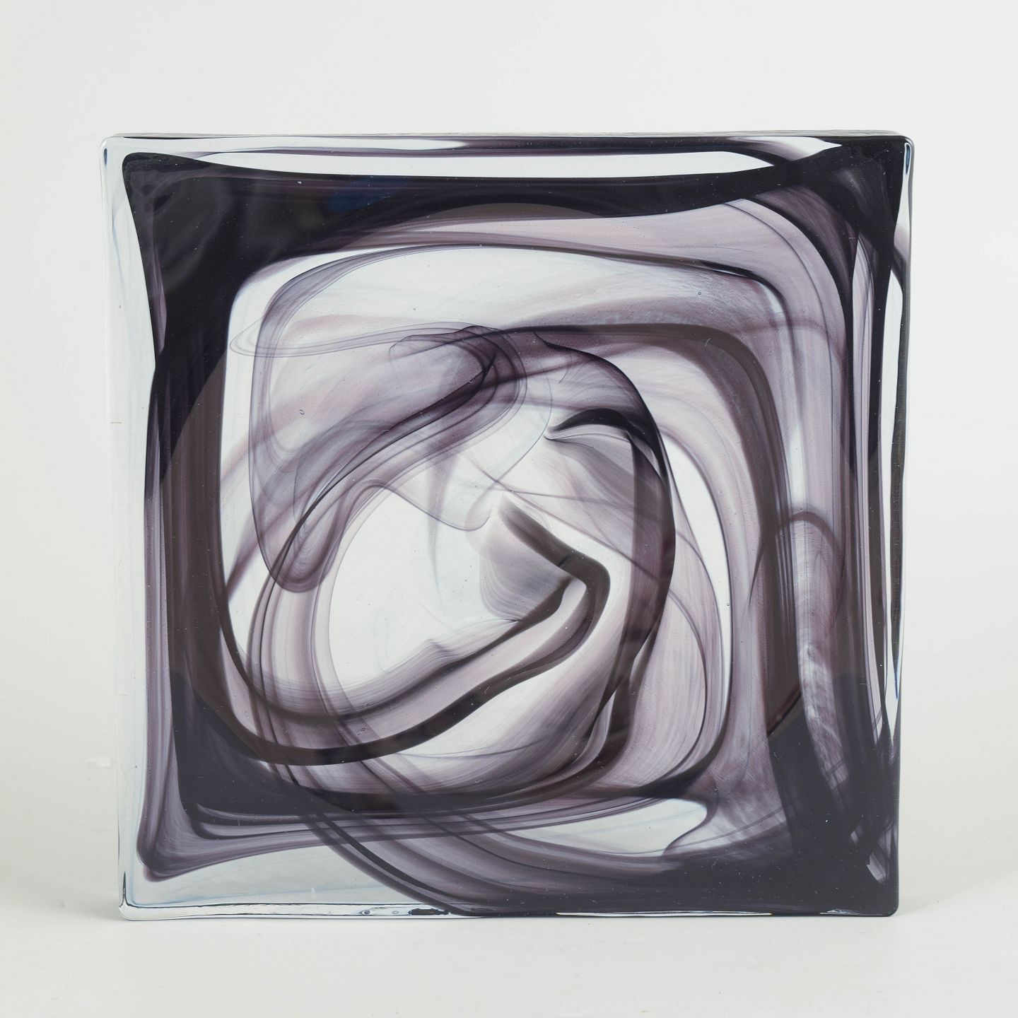 Kosta Boda, Cirrus Black, kunstglasobjekt.Fladt, kvadratisk objekt i klart glas med indkapslede, slyngede sorte og grå glastråde, der danner et abstrakt cirrus-lignende mønster. Modellen er kendt som Cirrus Black.