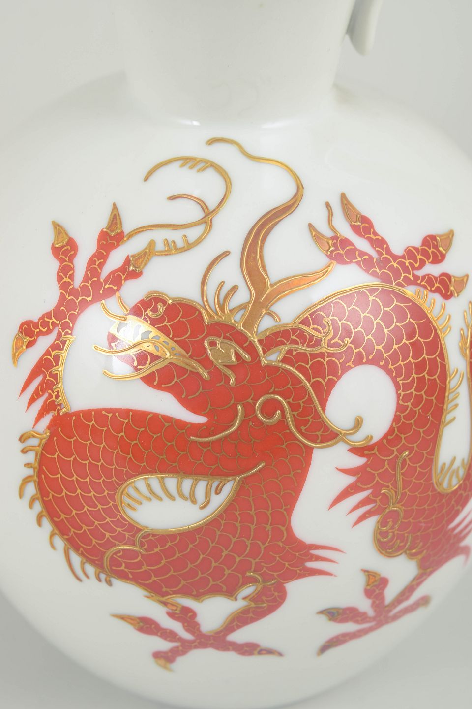 Schaubach Germany, kande med Mingdrage.Balusterformet kande i hvidglaseret porcelæn dekoreret med rød Mingdrage og forgyldt kant. Modellen er mærket Schaubach Germany og Gold Plated under bunden.
