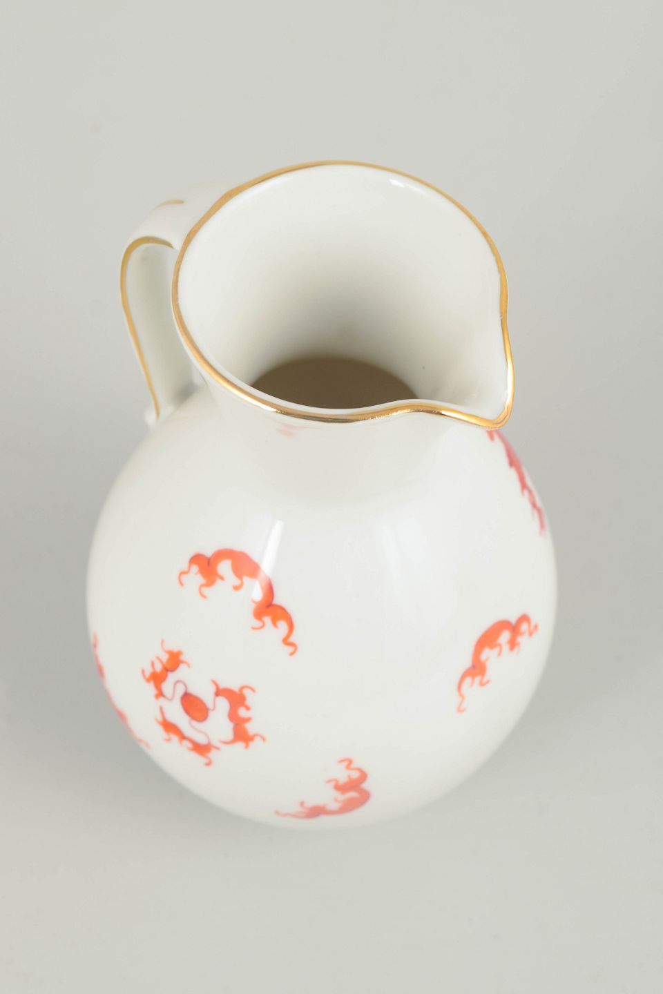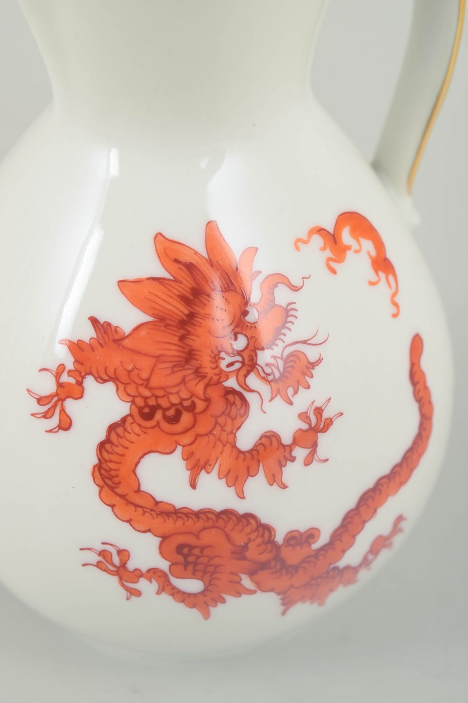 Kande med Mingdrage, Meissen-området.Balusterformet kande i hvidglaseret porcelæn dekoreret med rød Mingdrage og forgyldt kant. Modellen er fremstillet i Meissen-området og er ikke produceret af den kongelige Meissen-manufaktur.