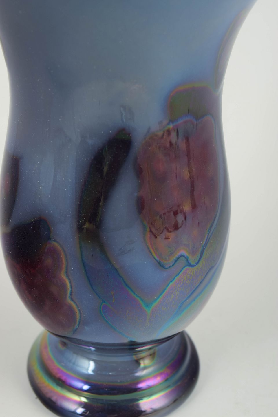 Edgar Böckman for Höganäs, vase.Dekorativ vase i glaseret keramik med blank luster-/metalglansglasur og abstrakte, iriserende farvespil i blå, violette og grønne toner.