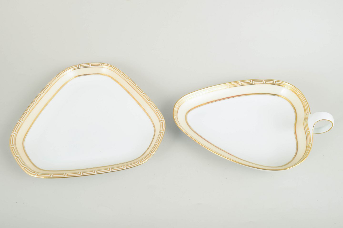 Bing & Grøndahl Rossini, sæt med 2 fade.Sæt med to trekantede fade i hvidglaseret porcelæn med forgyldt kant og geometrisk bort i art deco-stil; modeller 354 og 357.