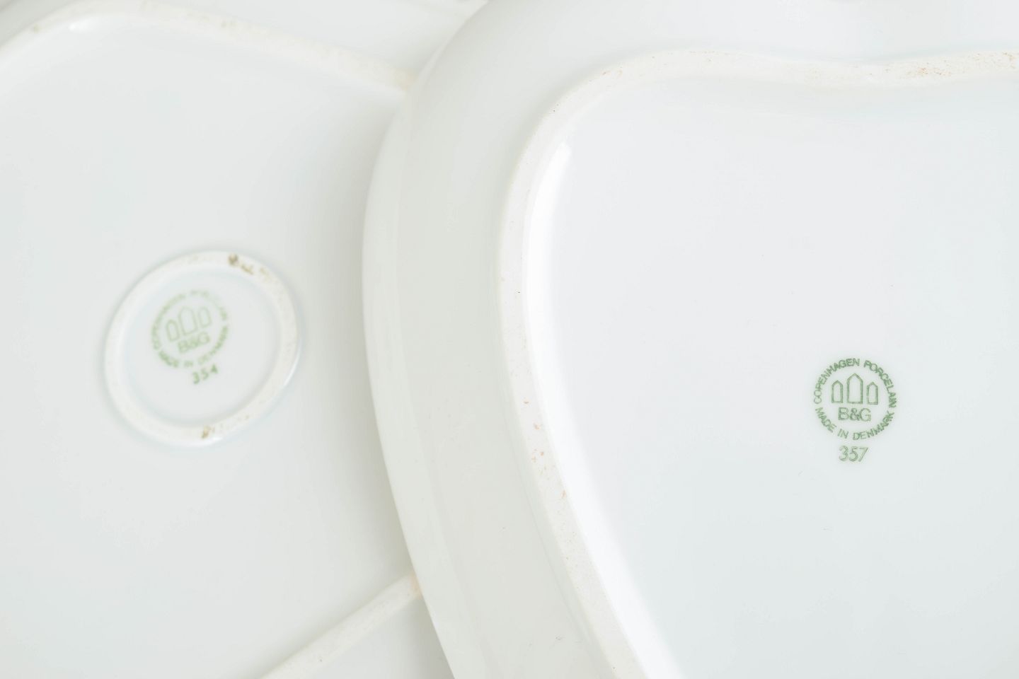 I 1920’erne fremstillede Bing & Grøndahl en række serveringsdele med et tydeligt geometrisk og stiliseret formsprog, inspireret af art deco. De karakteristiske former kombineret med forgyldt bort giver et elegant og moderne udtryk, typisk for periodens formelle borddækning.