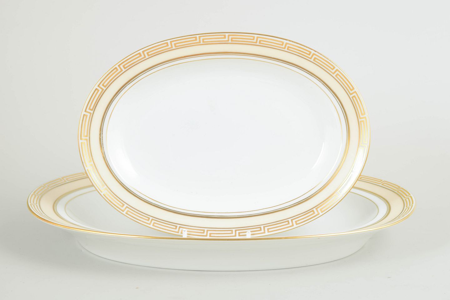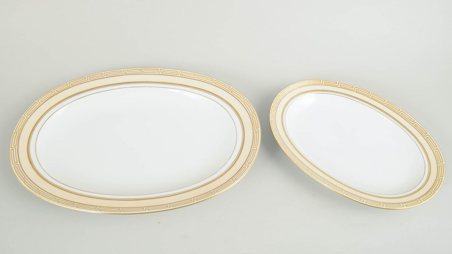 Bing & Grøndahl Rossini, sæt med 2 serveringsfade.Sæt med to ovale serveringsfade i hvidglaseret porcelæn med forgyldt kant og geometrisk bort i art deco-stil; model 18 og 316.