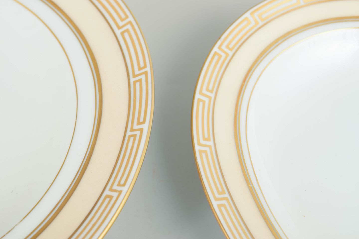 I 1920’erne fremstillede Bing & Grøndahl en række elegante serveringsdele med tydeligt geometrisk ornamentik, inspireret af tidens art deco-formsprog. Kombinationen af hvid porcelænsbund og forgyldt bort giver et raffineret og stramt udtryk, velegnet til det formelle dækkebord i mellemkrigstiden.