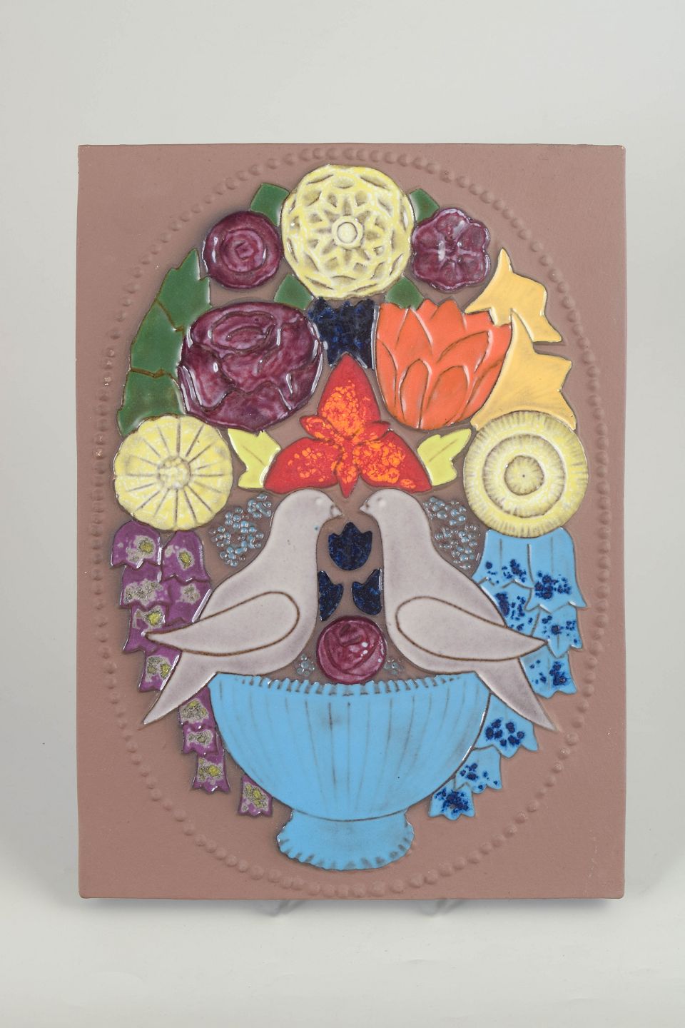 Upsala Ekeby, vægrelief af Sven-Erik Skawonius.Farverigt keramisk vægrelief med stiliseret blomsterbuket og to fugle i relief. Modelnr. 01945.