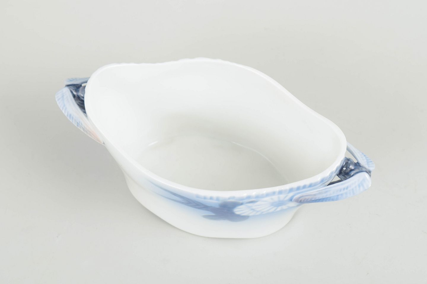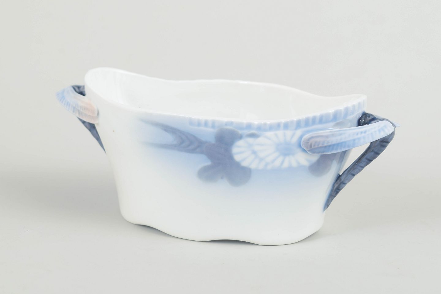 Royal Copenhagen, Skærsommernatsdrøm, lille skål med hanke.Lille åben porcelænsskål med to hanke og blå underglasurdekoration i serien Skærsommernatsdrøm.