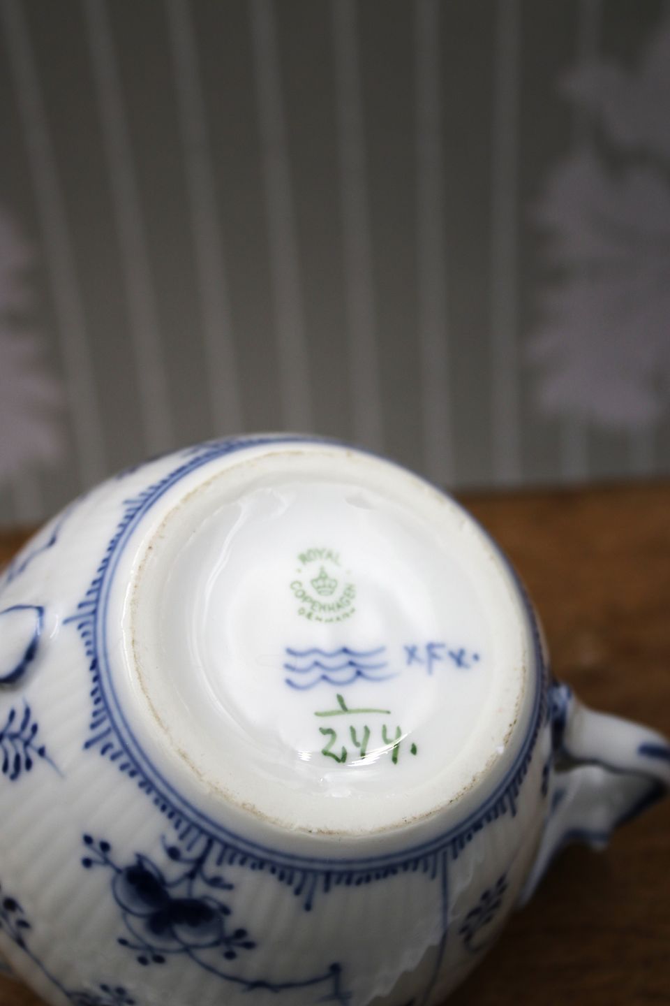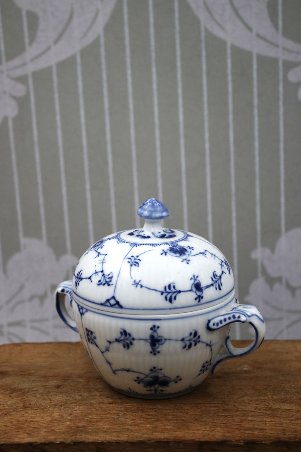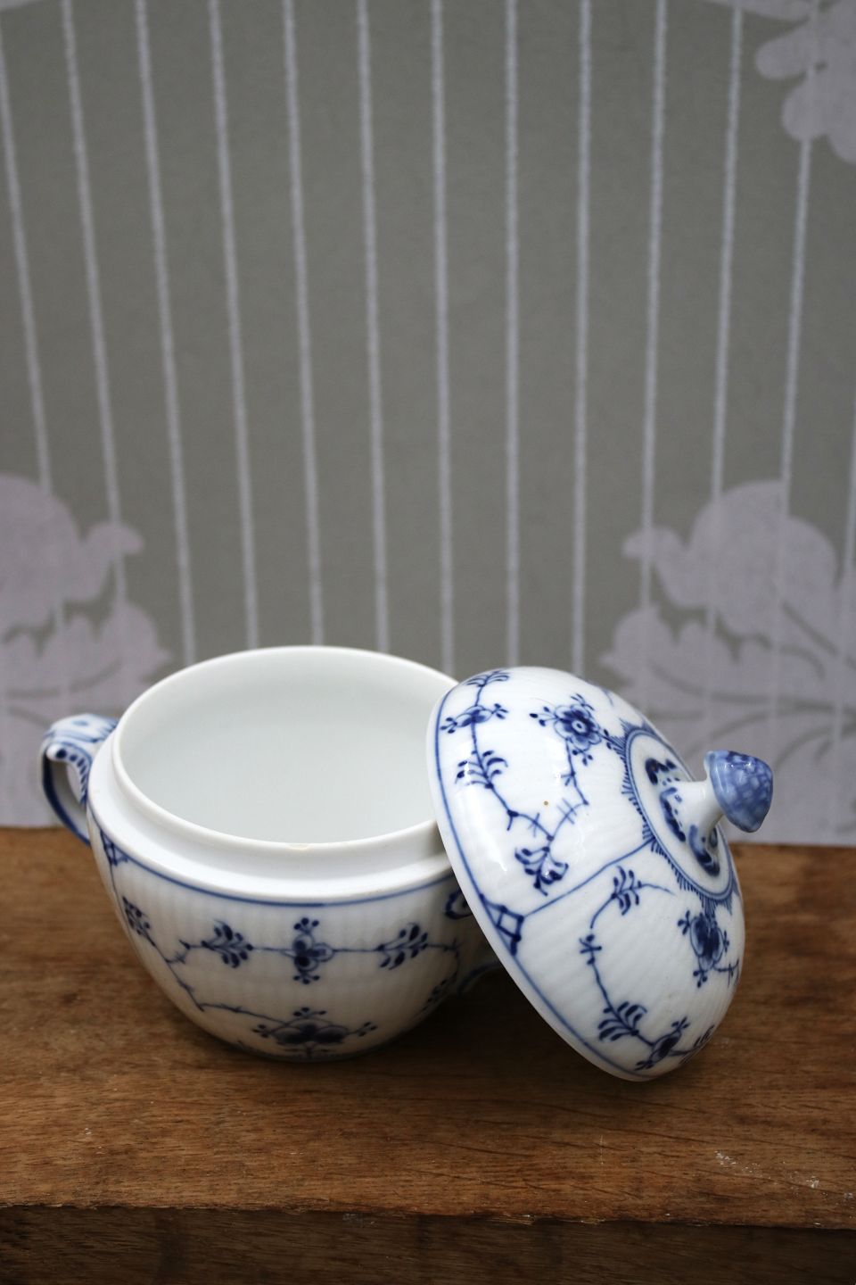 Royal Copenhagen Musselmalet Riflet sukkerskål med låg og hanke.H: 11cm. Dekorationsnummer: 1/244. 1.sortering.