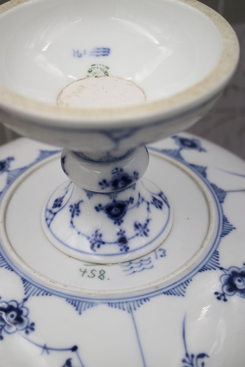 Frugt / kage opsats i Musselmalet Riflet fra Royal Copenhagen.Dekorationsnummer: 1/458. 1.sort. H: 14cm. Dia.: 23cm.