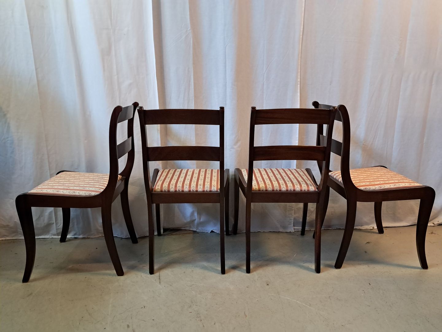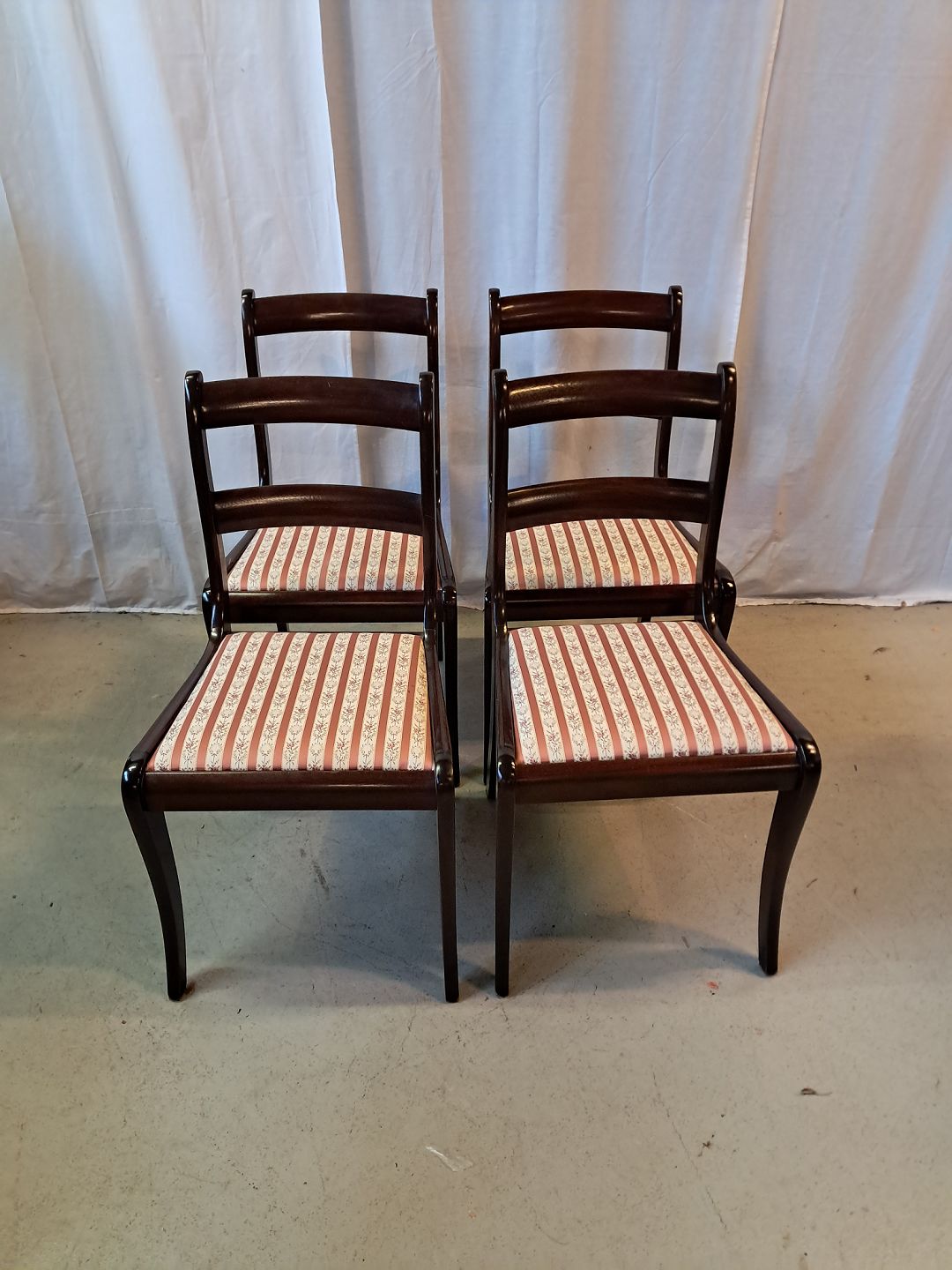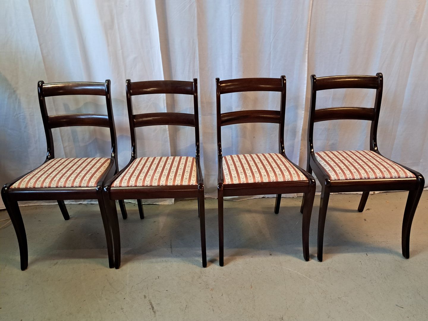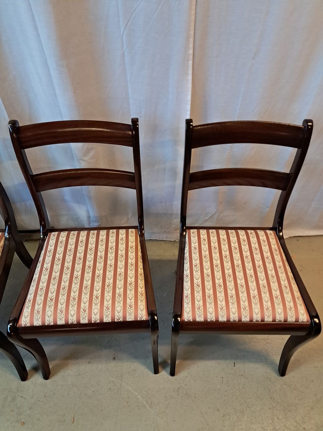 4 Stole i massivt mahogni og bøgetræ, fra 1980erne.De har brugsspor.