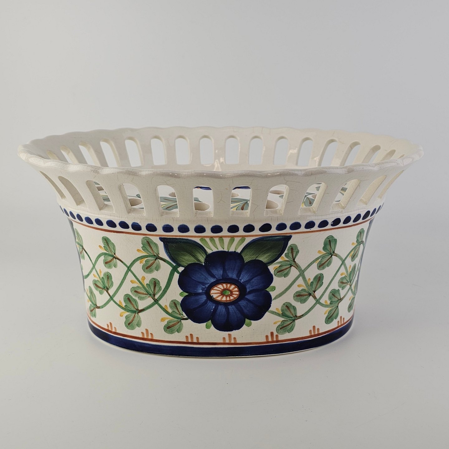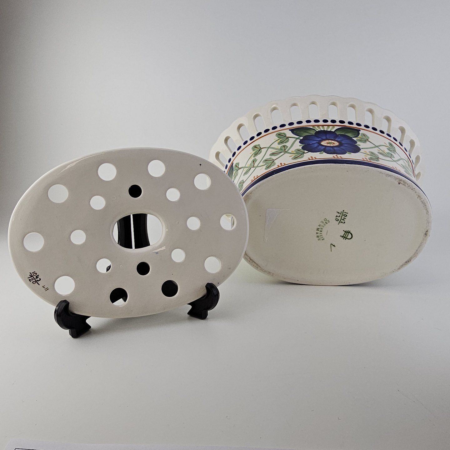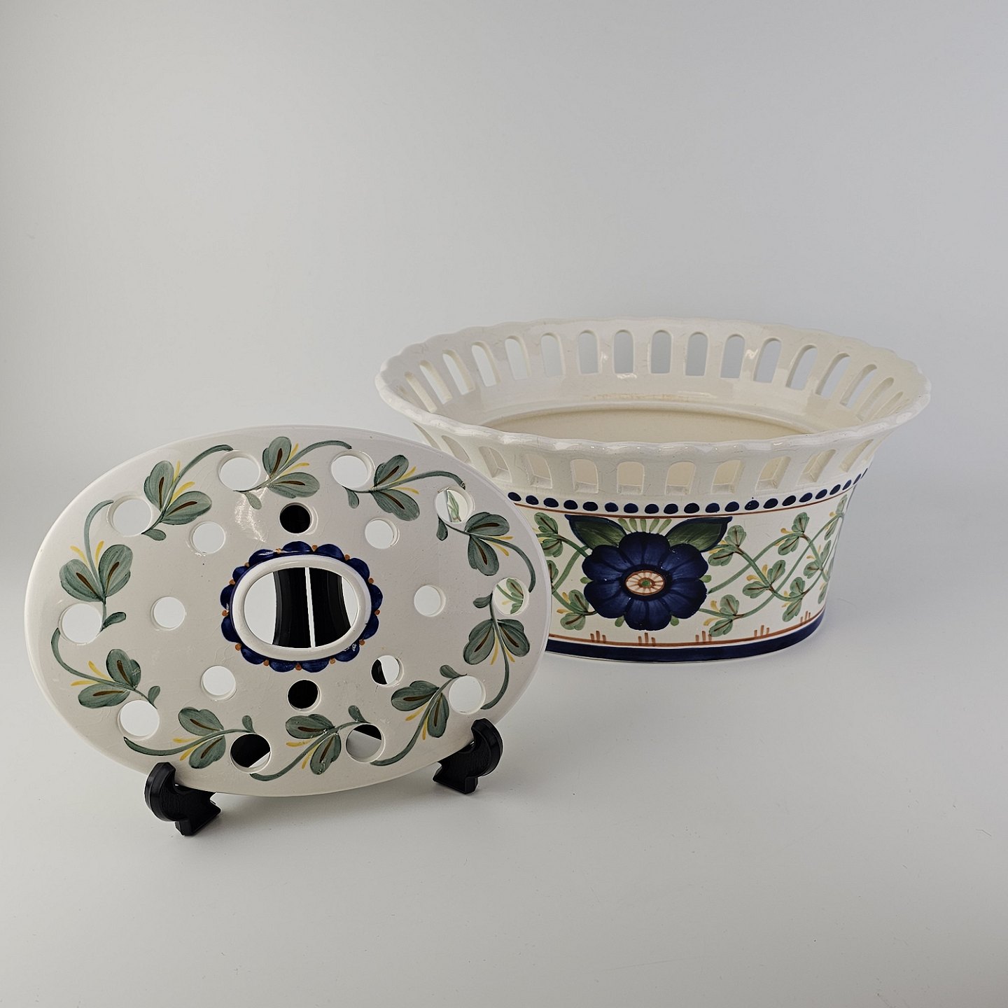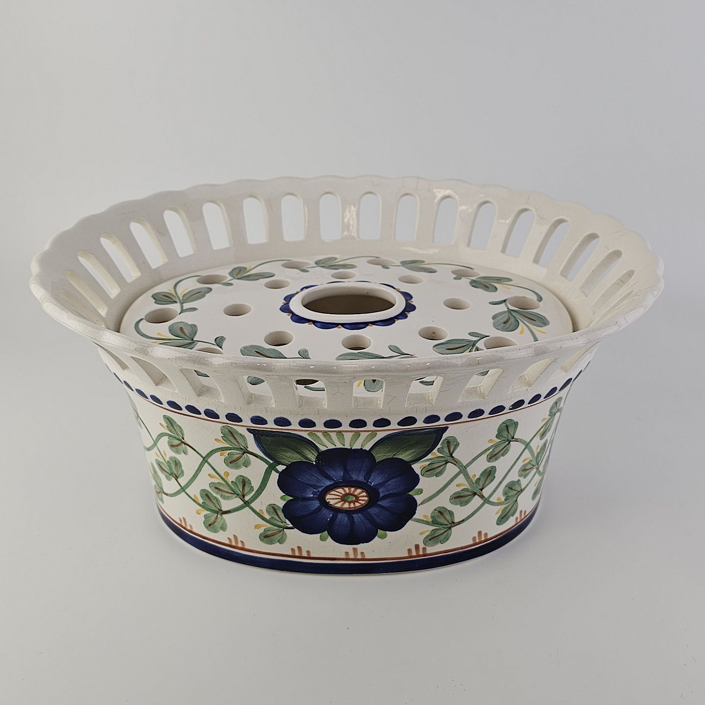 Oval jardiniere med låg i fajance med dekoration af en blå blomst og grønne blade. Nr. 1042/720Producent Aluminia
