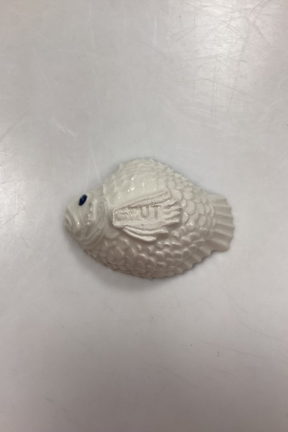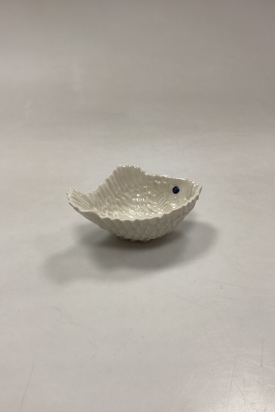 Royal Copenhagen Skål - Lille Fisk af Jeanne Grut. Hvidt stentøj med mørkeblå øjne. Signeret GRUT. Måler: L 12 cm x B 8,5 cm x H ca.4 cm
