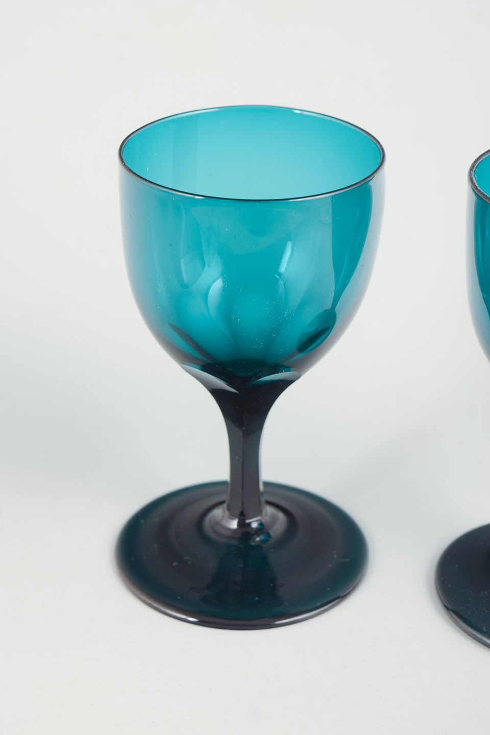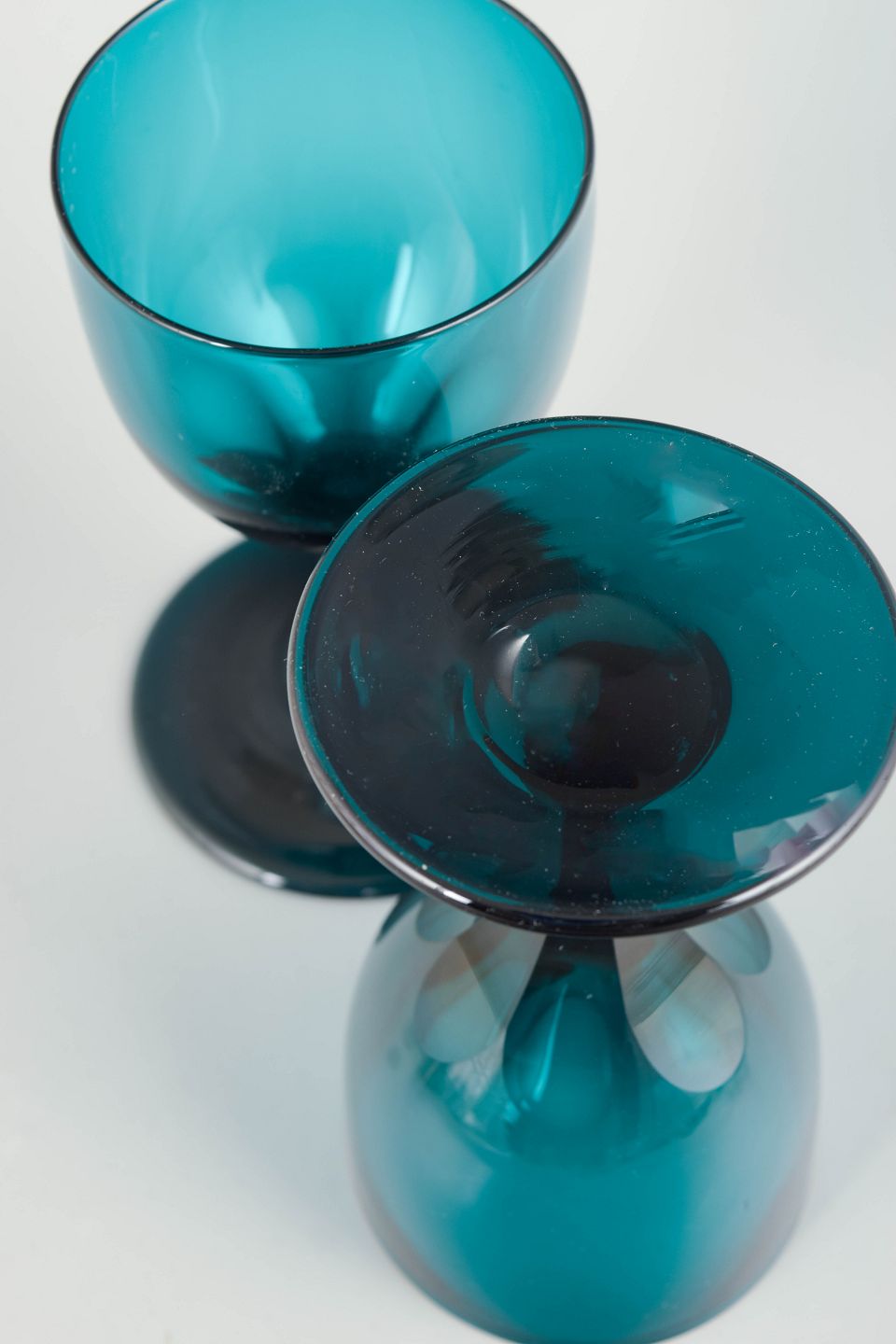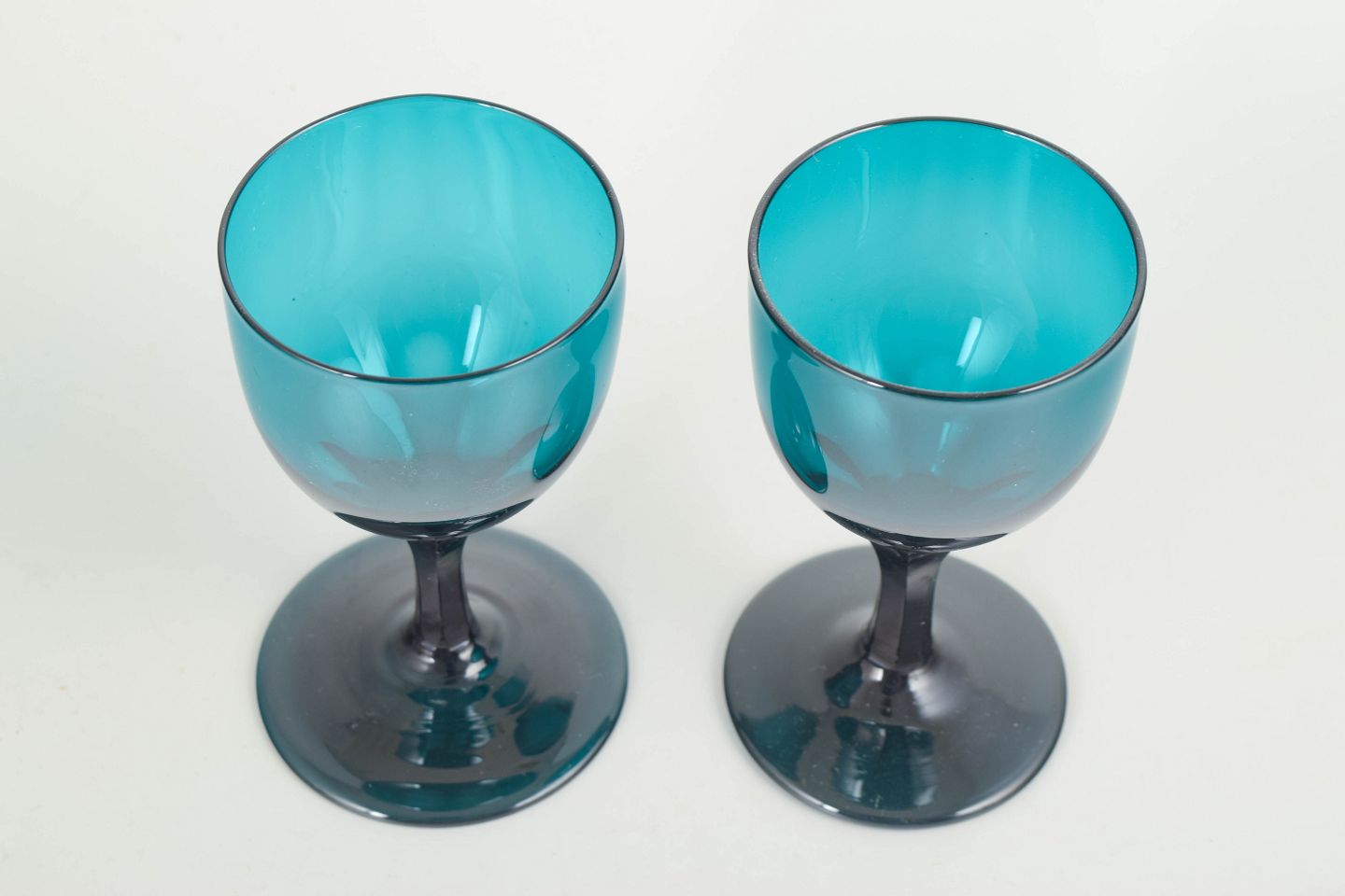 Art Deco Hvidvinsglas, Sæt Af 2.To hvidvinsglas i krystalglas med petrolblå kumme og mørkere, facetslebet stamme og fod.