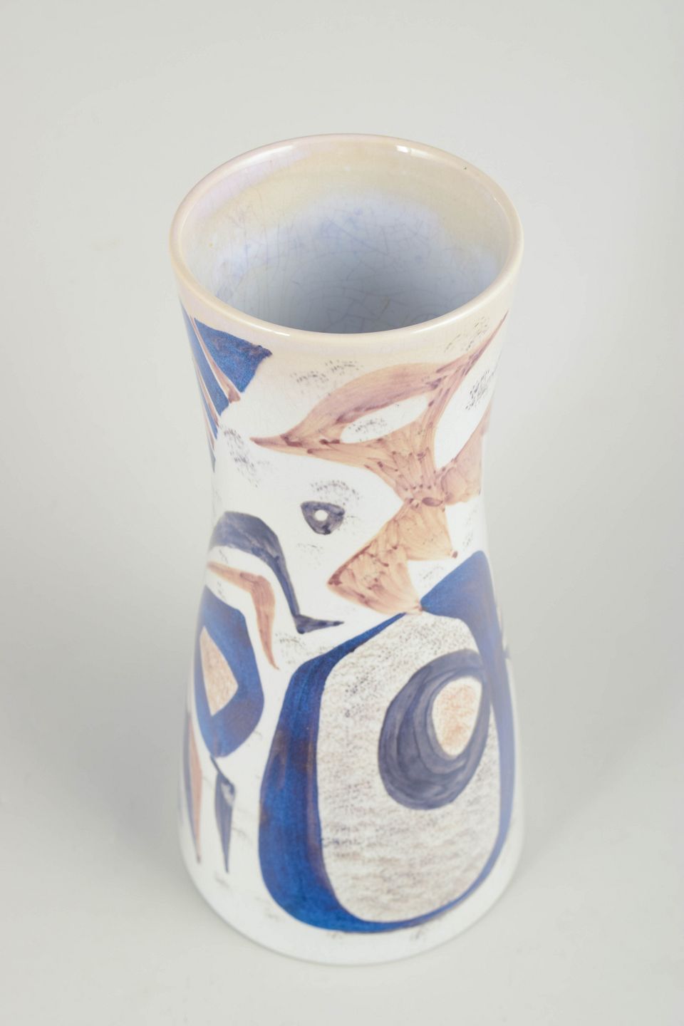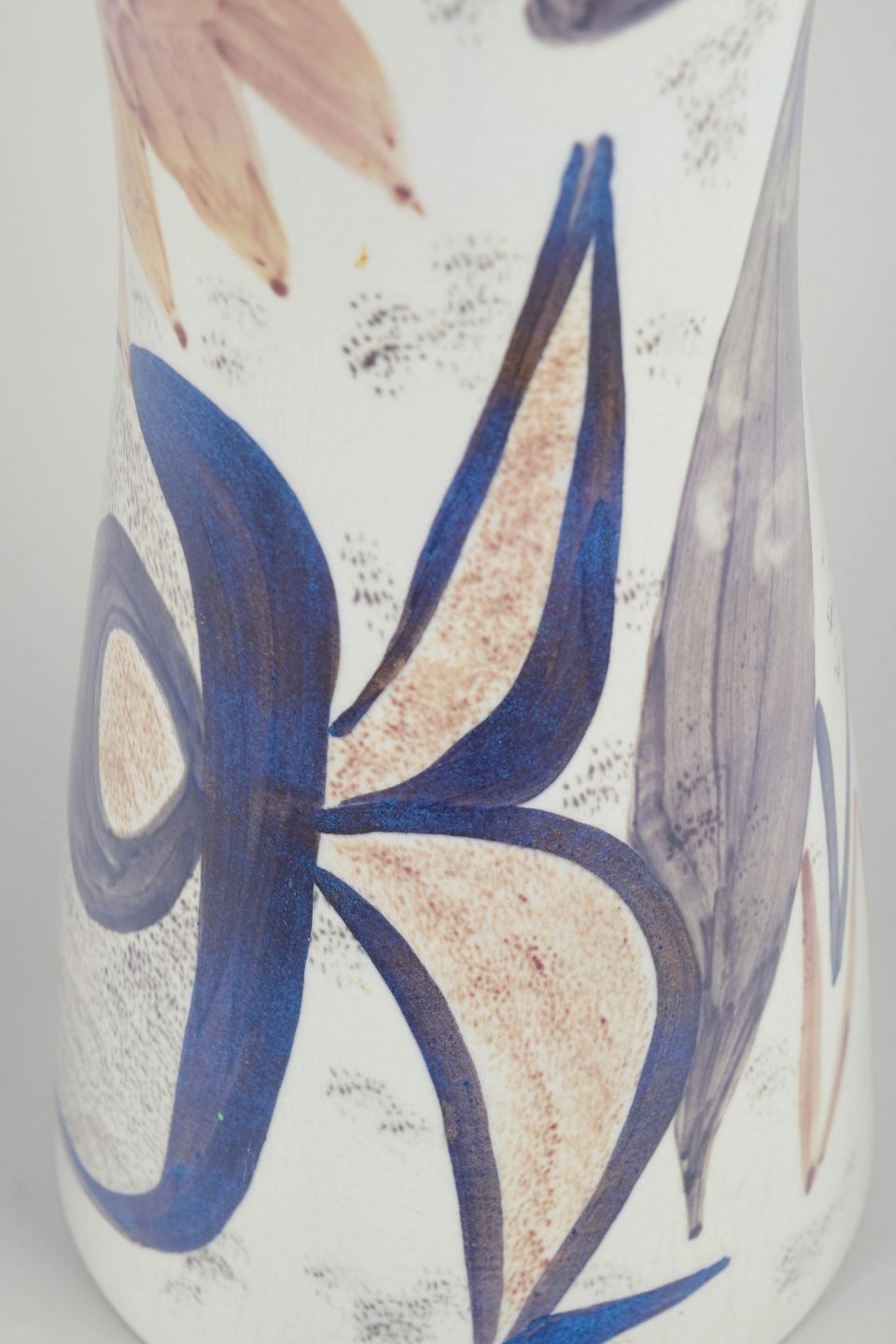 Stor, balusterformet fajancevase dekoreret med håndmalet abstrakt komposition i blå, grå og brune nuancer. Unikt værk udført som frit malet dekoration på glaseret fajance.