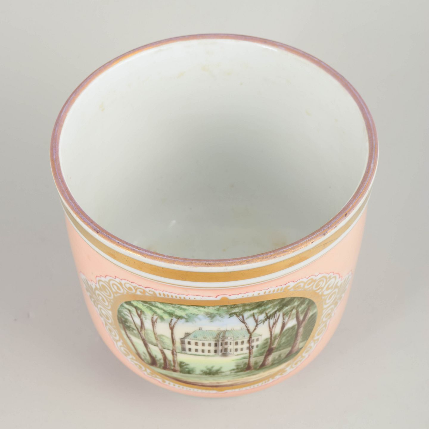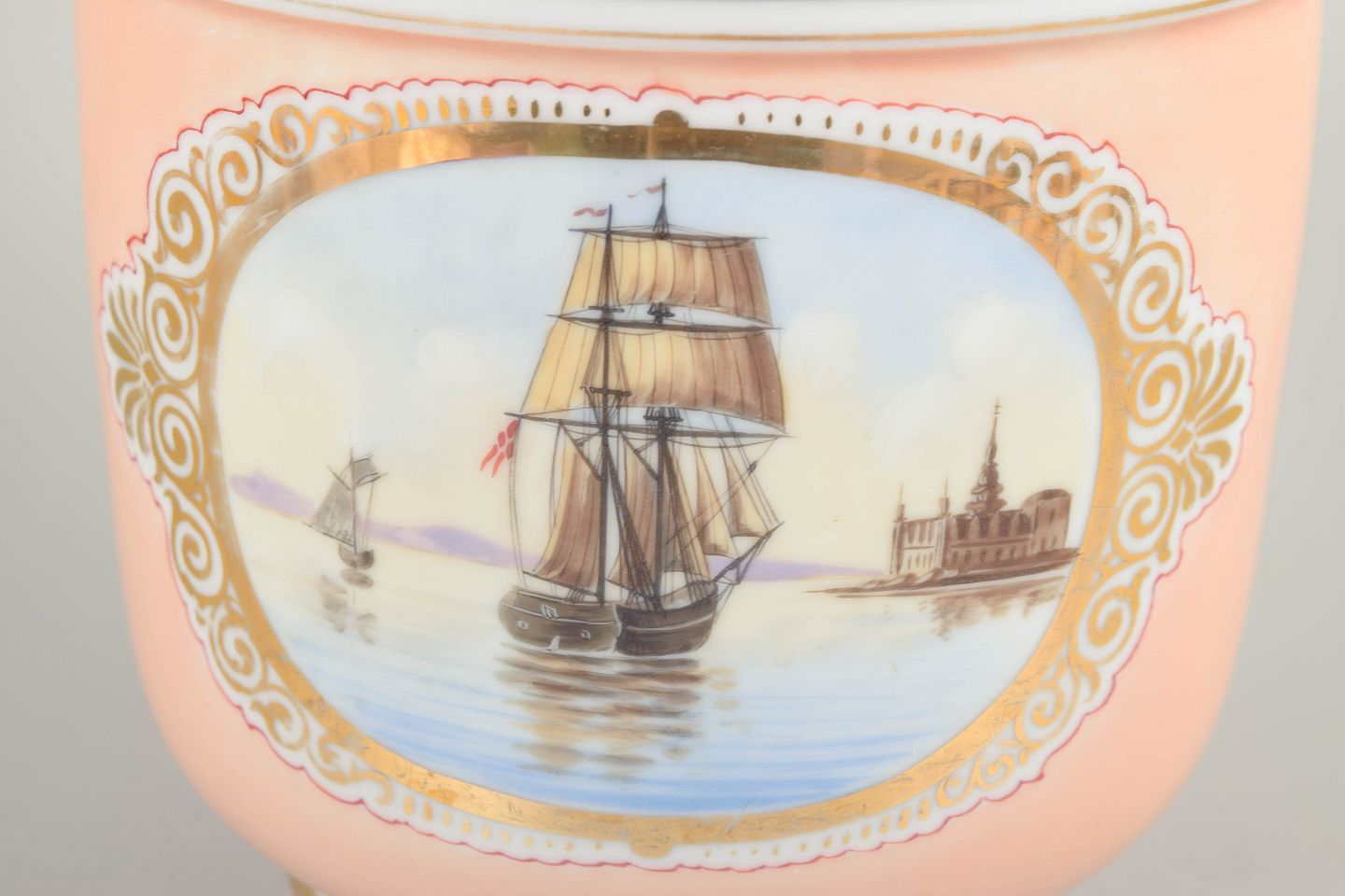 Dansk vase med motiv af Bernstorff Slot og Kronborg slot, håndmalet.Rund, let konisk vase i porcelæn med opaliserende rosa bundfarve og håndmalet prospekt af Bernstorff Slot og Kronborg slot i parklandskab med høje træer i forgrunden, indrammet af et ornamenteret felt og forgyldt bort langs randen. Klassicistisk inspireret form med lav fodring. Motivet er udført i bløde grønne og jordfarver med let idealiseret arkitektonisk gengivelse.