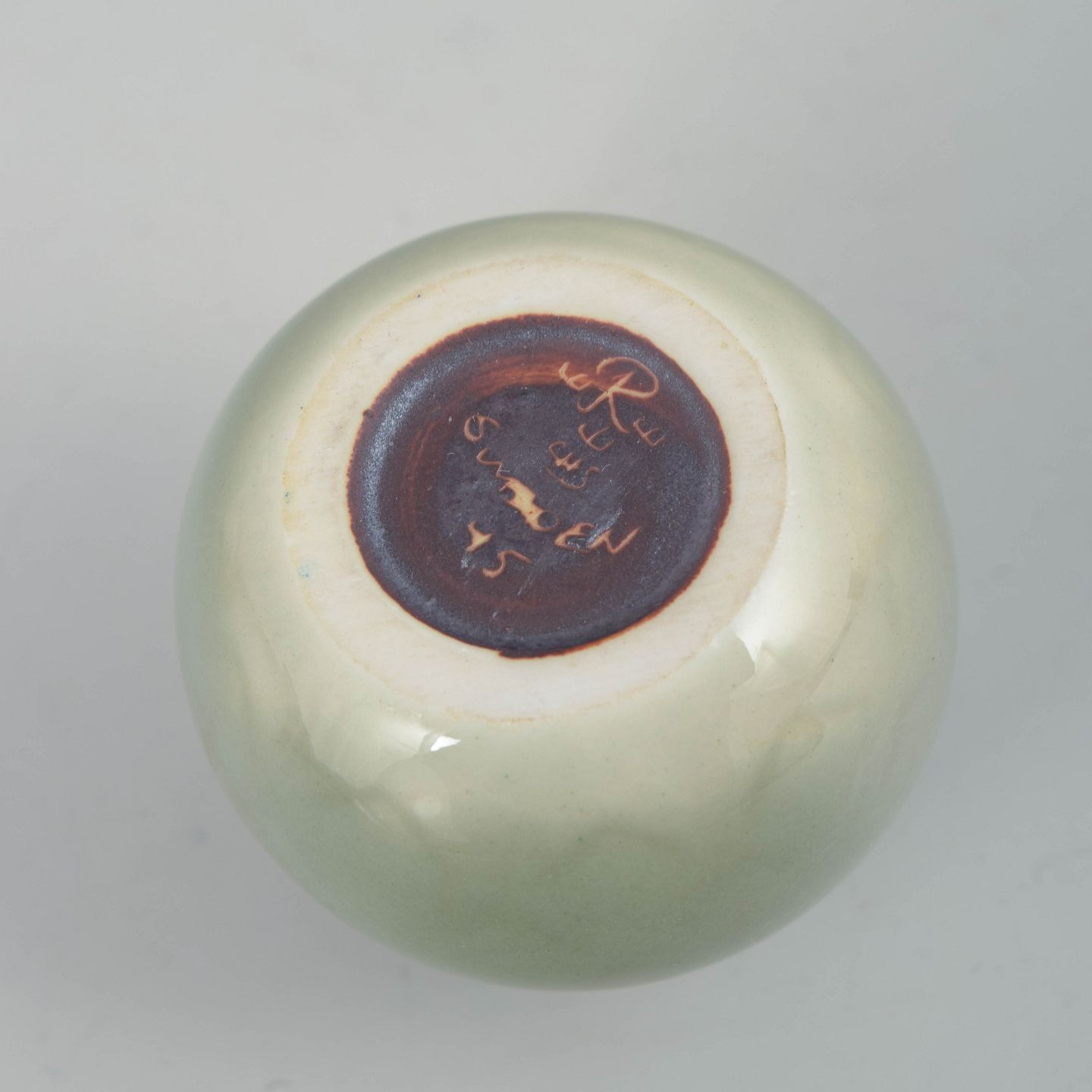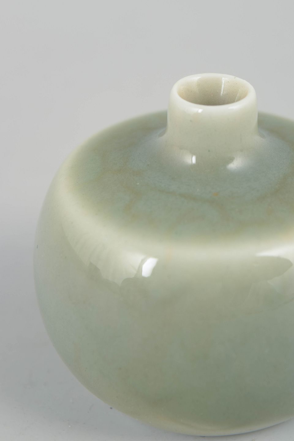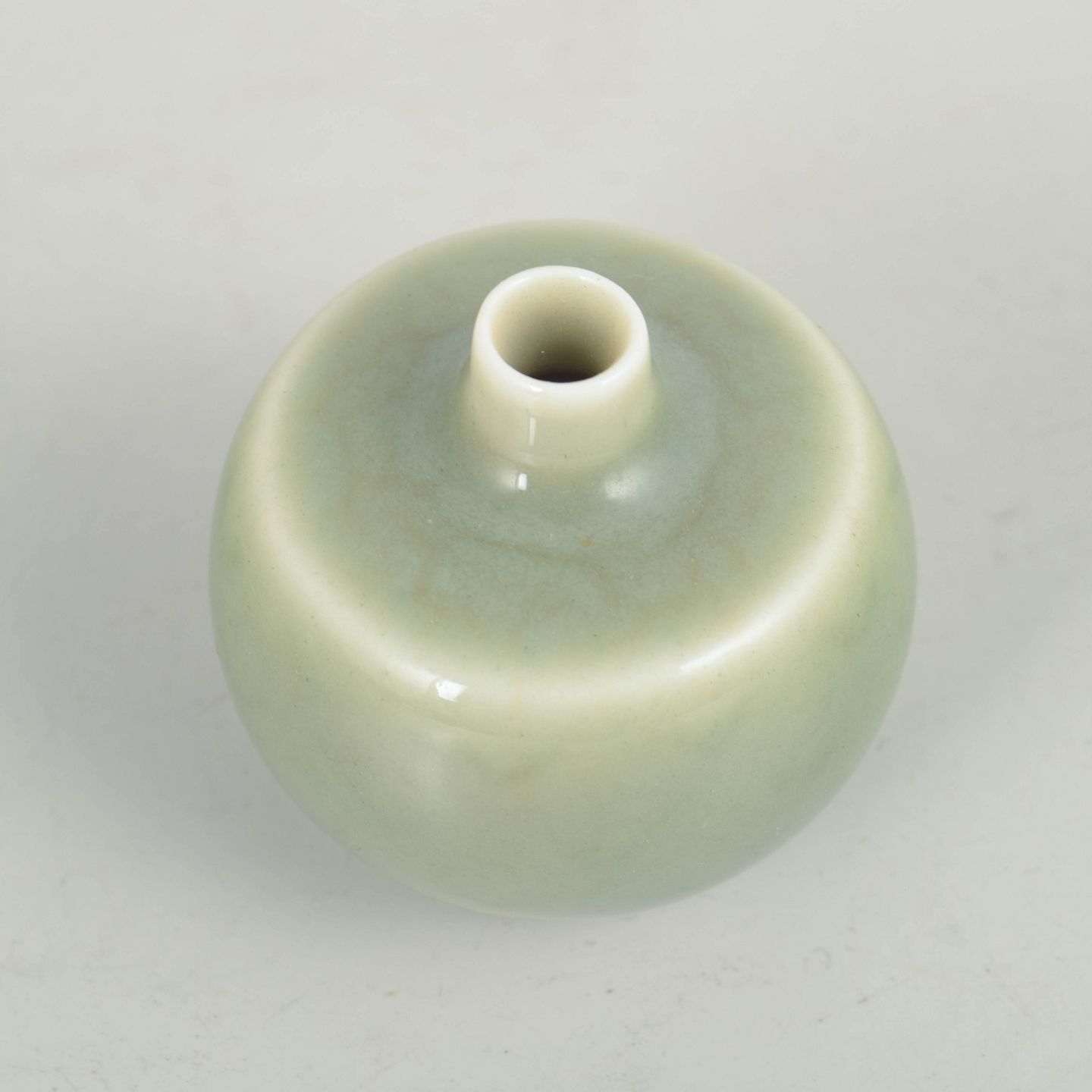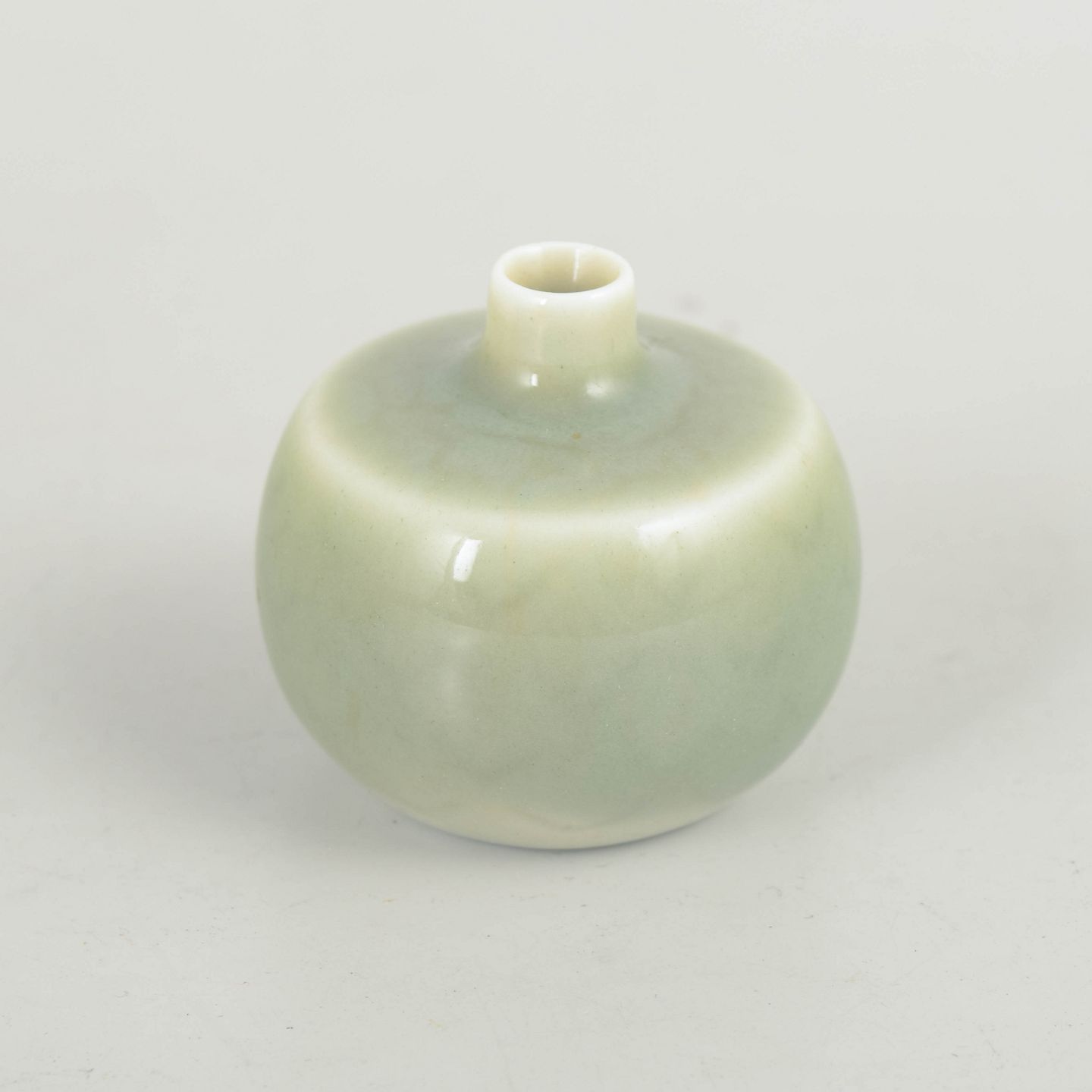 Carl-Harry Stålhane for Rörstrand, miniature vase.Lille rund vase i stentøj med blødt afrundet form og ensfarvet celadonglasur i lysegrøn tone. Glasuren har en rolig, silkemat overflade med lette nuancevariationer, typisk for Stålhane’s stramme og harmoniske formsprog.