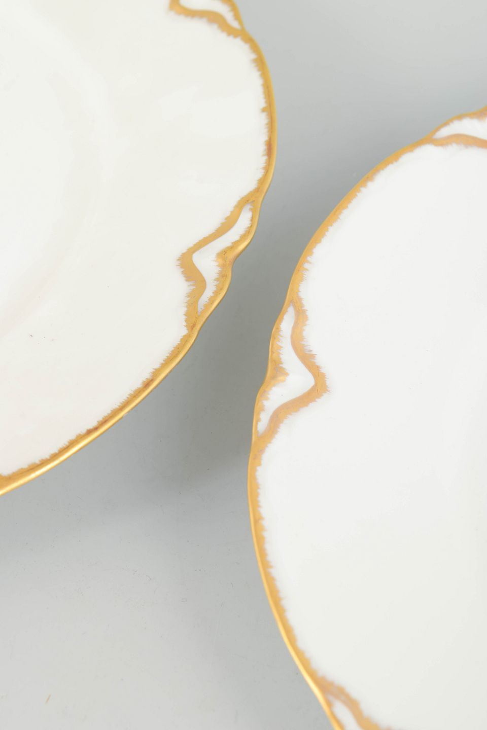 Haviland/Limoges, 2 middagstallerkener af porcelæn.To franske middagstallerkener i hvid fajance med bølget fane og dekoration i forgyldt kant samt stiliserede, Art Deco-inspirerede gulddetaljer langs randen.