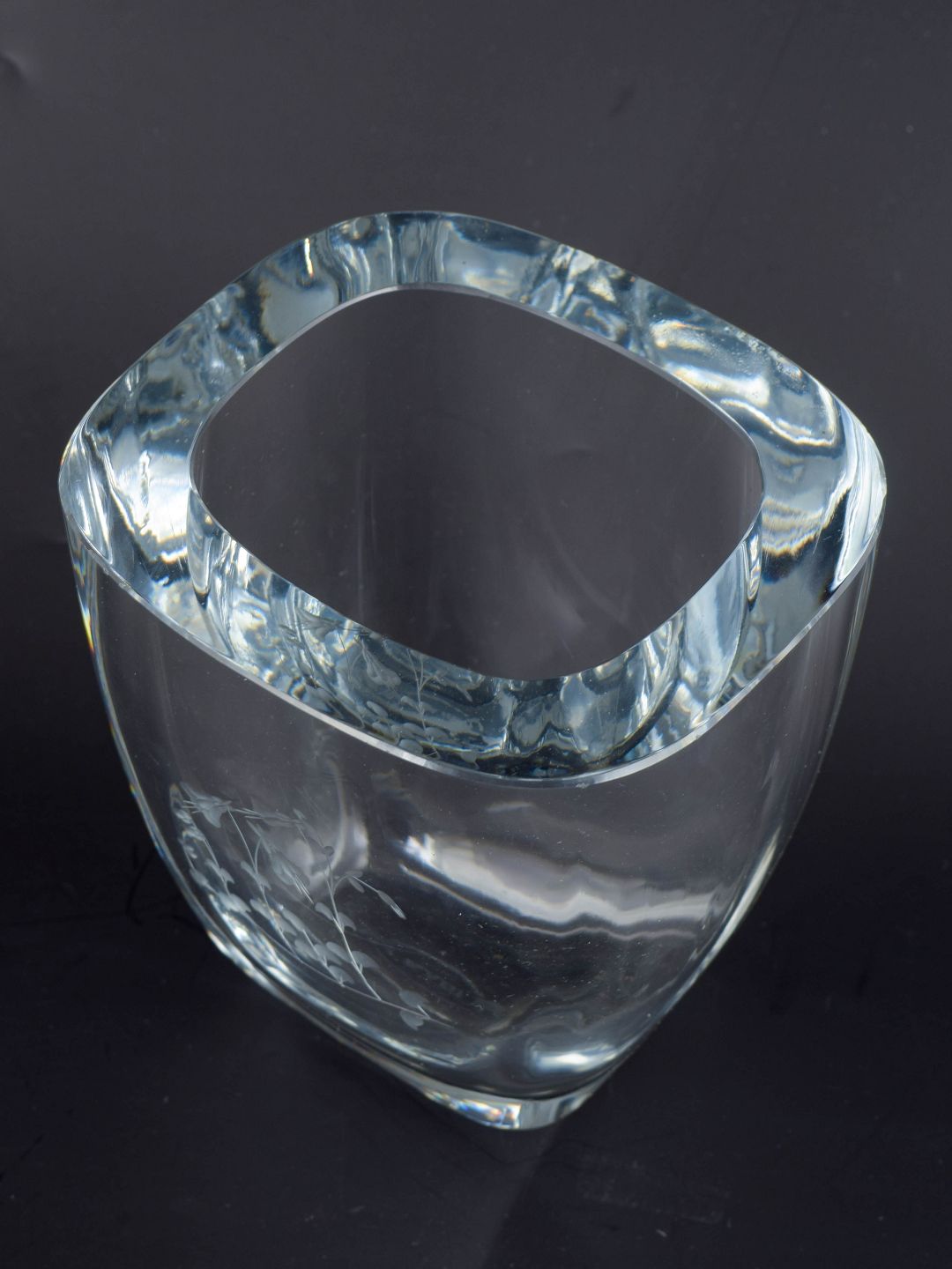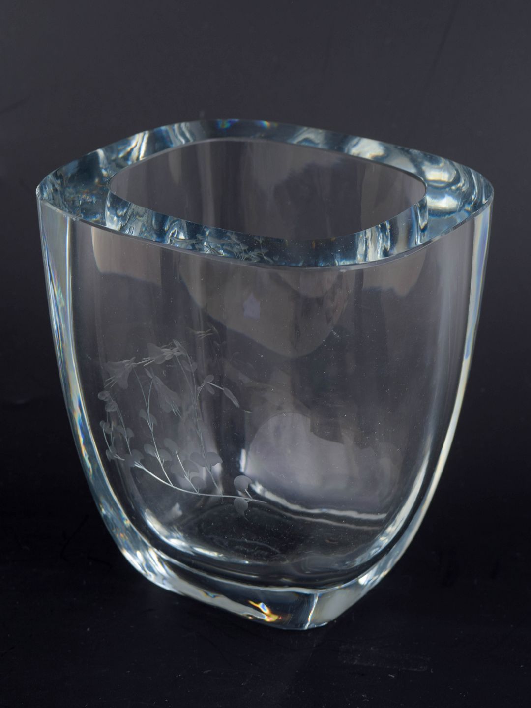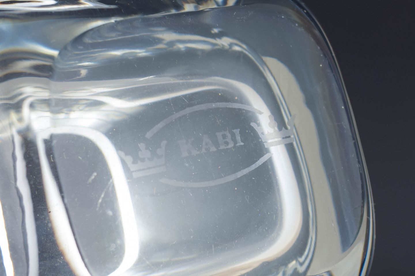 Svensk kunstglasvase, muligvis Orrefors.Kraftig, mundblæst glasvase med blødt afrundet, kvadratisk grundform og tyk, klar kant. Bærer en svagt ætset mærkning “KABI” i bunden.