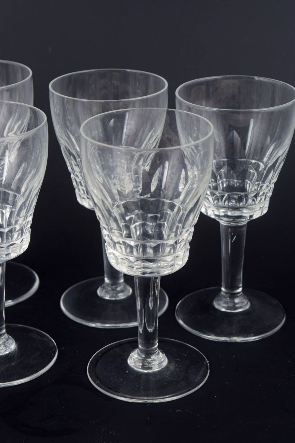 Fransk krystal, sæt med 7 portvinsglas.Sæt med syv franske portvinsglas i klart krystal med facetteret kumme og klassisk stamme. Form og slibning giver et elegant lysspil og et tidstypisk udtryk fra midten af det 20. århundrede.