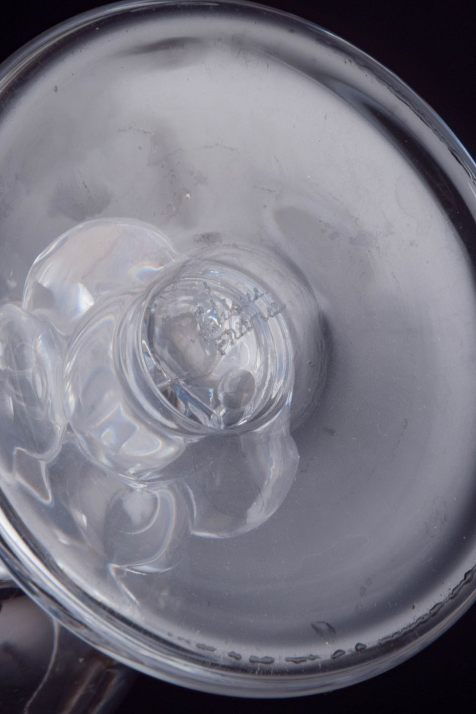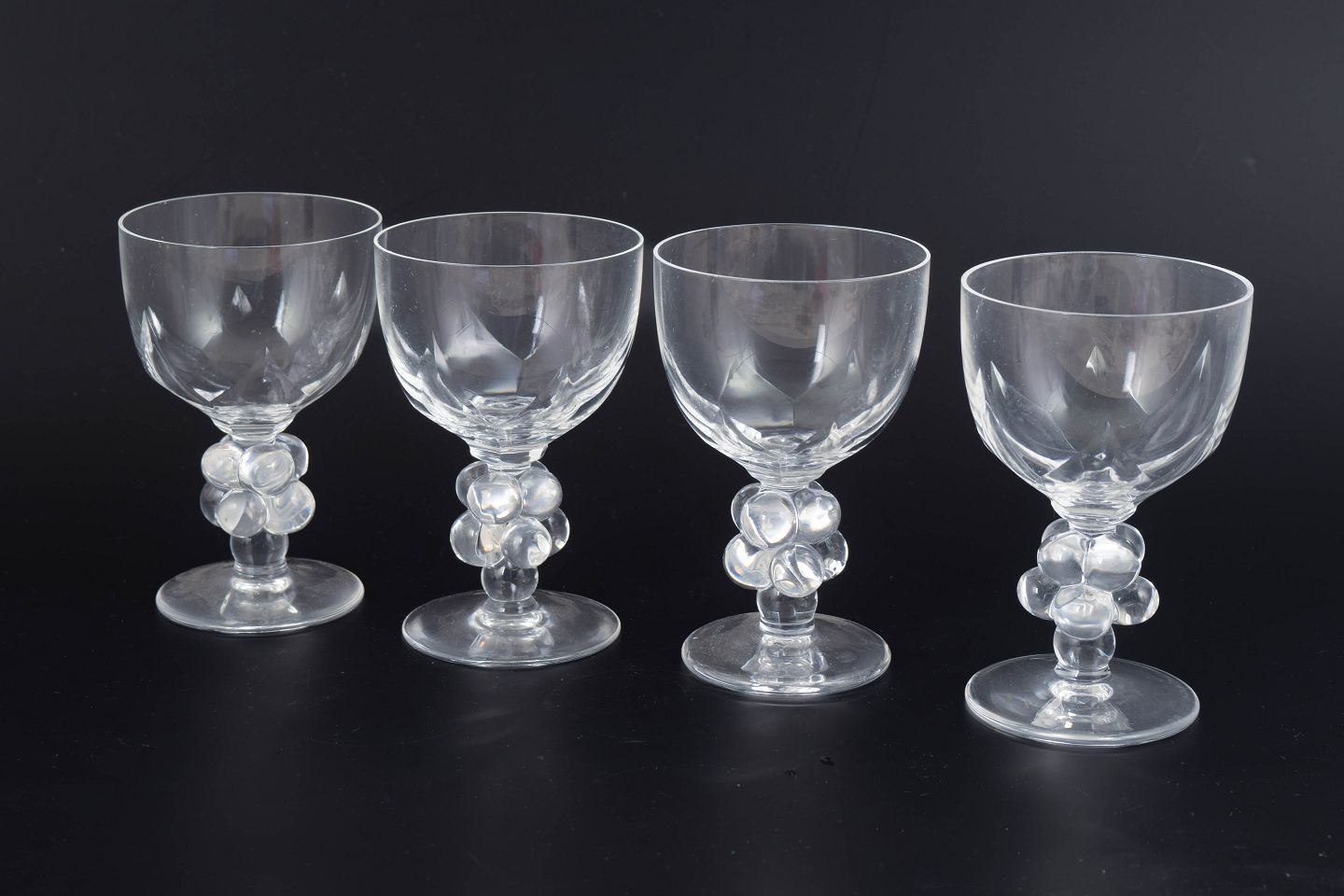 René Lalique, Clos Vougeot Bourgogneglas, sæt med 4.Sæt med fire store og sjældne vinglas i klart formpresset glas med facetslebet kumme og stilk udformet som drueklase. Modellen “Clos Vougeot” er udført med elegant Art Deco-inspireret symmetri, hvor de dekorative former både har en skulpturel og funktionel karakter. Glassene er signeret i bunden.