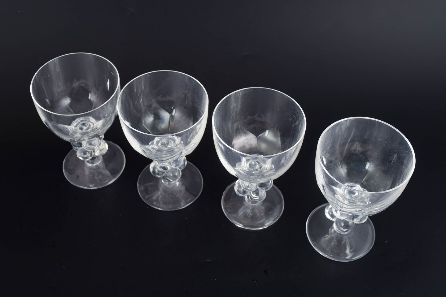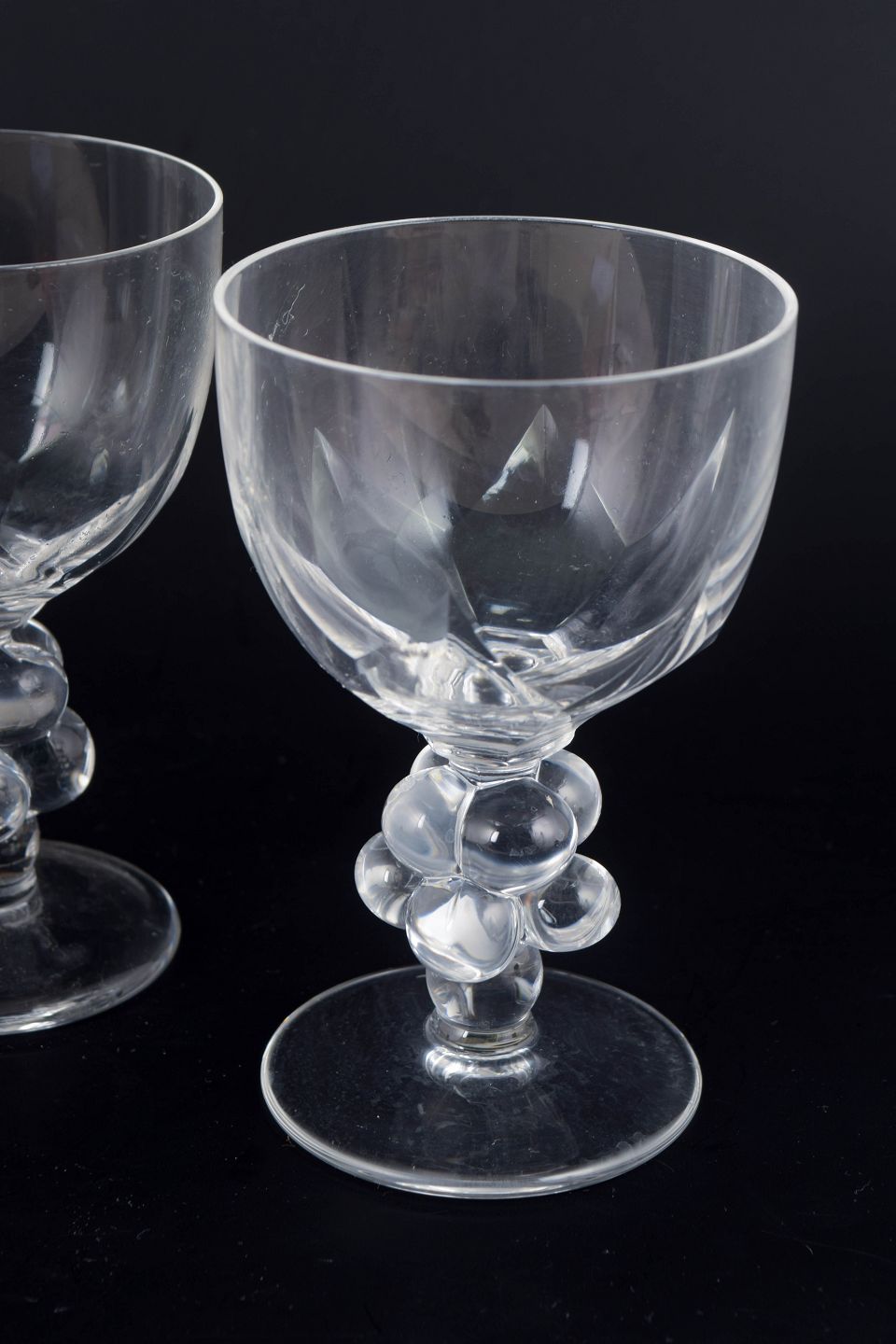 René Lalique, Clos Vougeot Bourgogneglas, sæt med 4.Sæt med fire store og sjældne vinglas i klart formpresset glas med facetslebet kumme og stilk udformet som drueklase. Modellen “Clos Vougeot” er udført med elegant Art Deco-inspireret symmetri, hvor de dekorative former både har en skulpturel og funktionel karakter. Glassene er signeret i bunden.