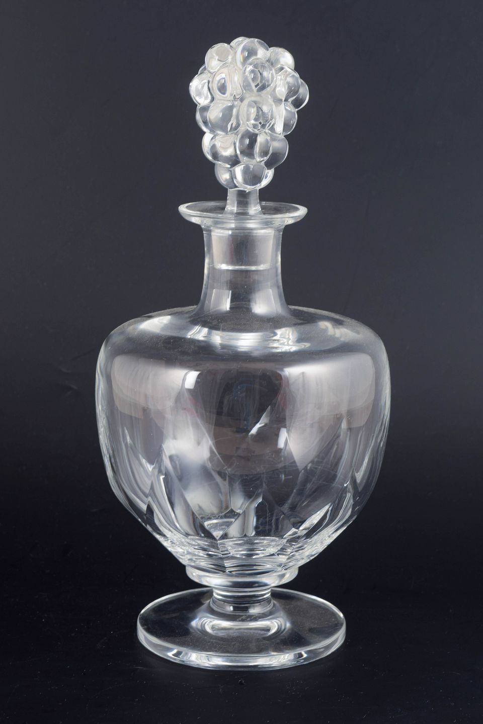 René Lalique, Clos Vougeot karaffel.Stor og sjælden vinkaraffel i klart formpresset glas med reliefsleben korpus og knop formet som drueklase. Modellen “Clos Vougeot” er udført med klassisk Art Deco-inspireret symmetri og elegante facetter, der reflekterer lyset og fremhæver glassets klarhed. Signeret i bunden.