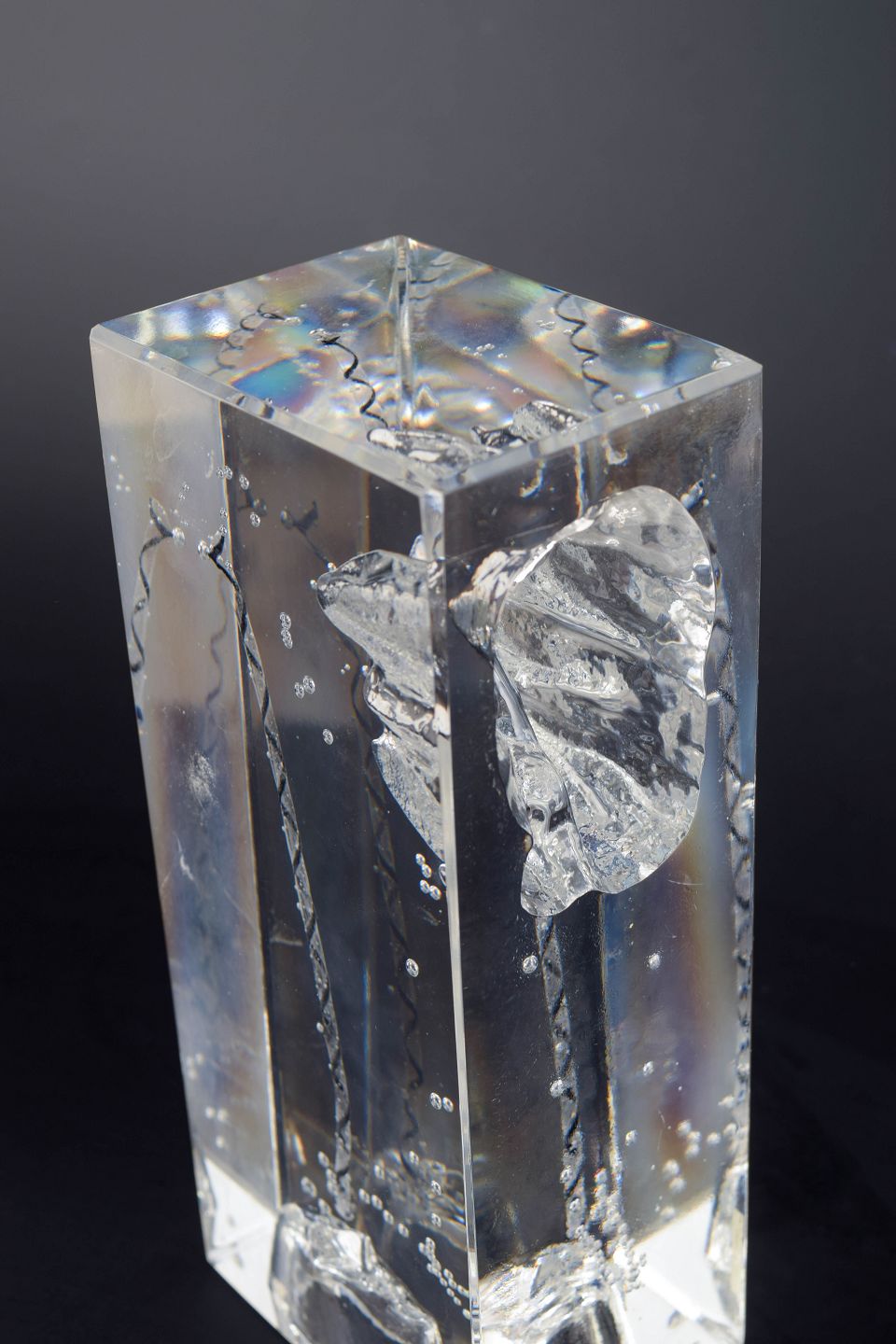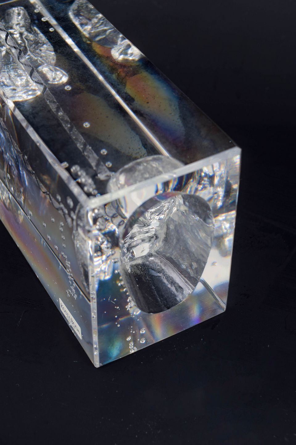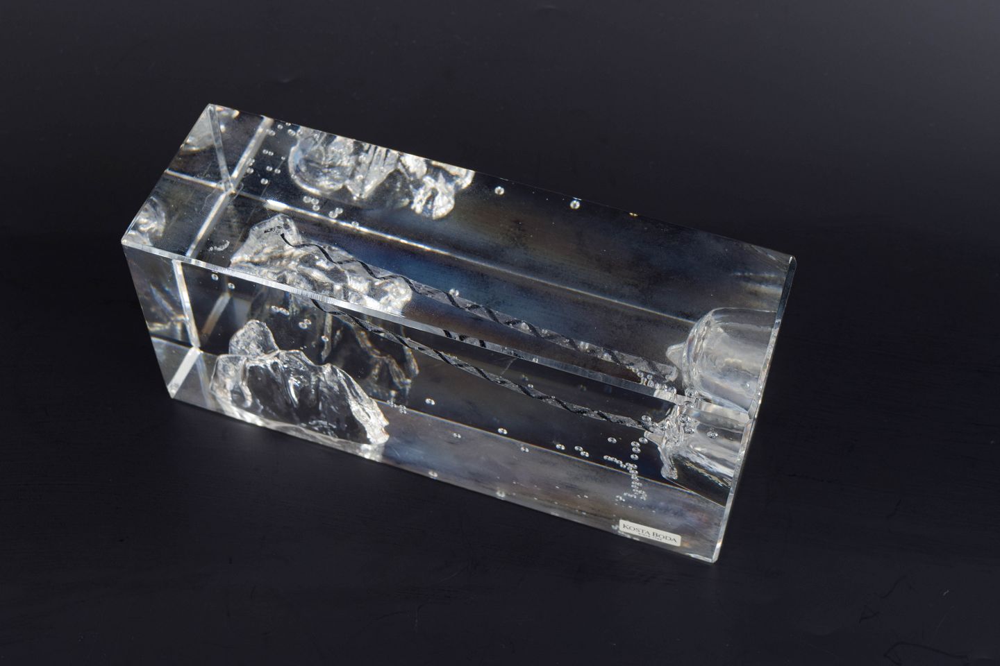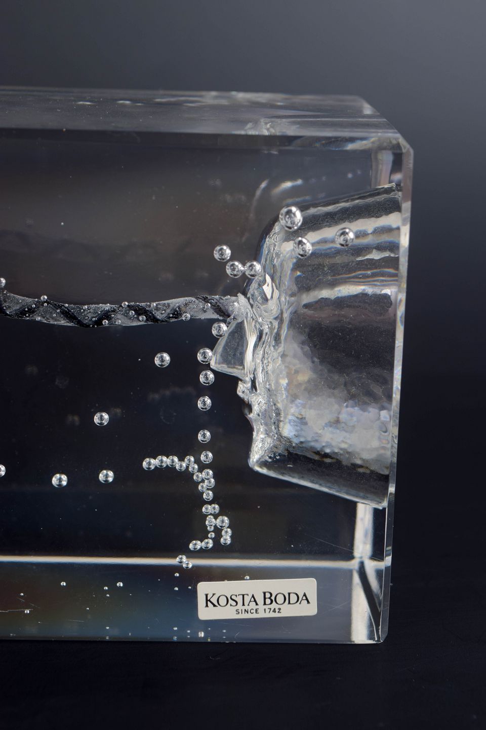 Bertil Vallien for Kosta Boda, “Crystal Fantasy”, unik skulptur i glas.Rektangulær, massiv kunstglasskulptur med indkapslet figurativt motiv og indsmeltede luftbobler, udført i klart glas med indre strukturer og optiske brydninger. Original Kosta Boda-klistermærke.