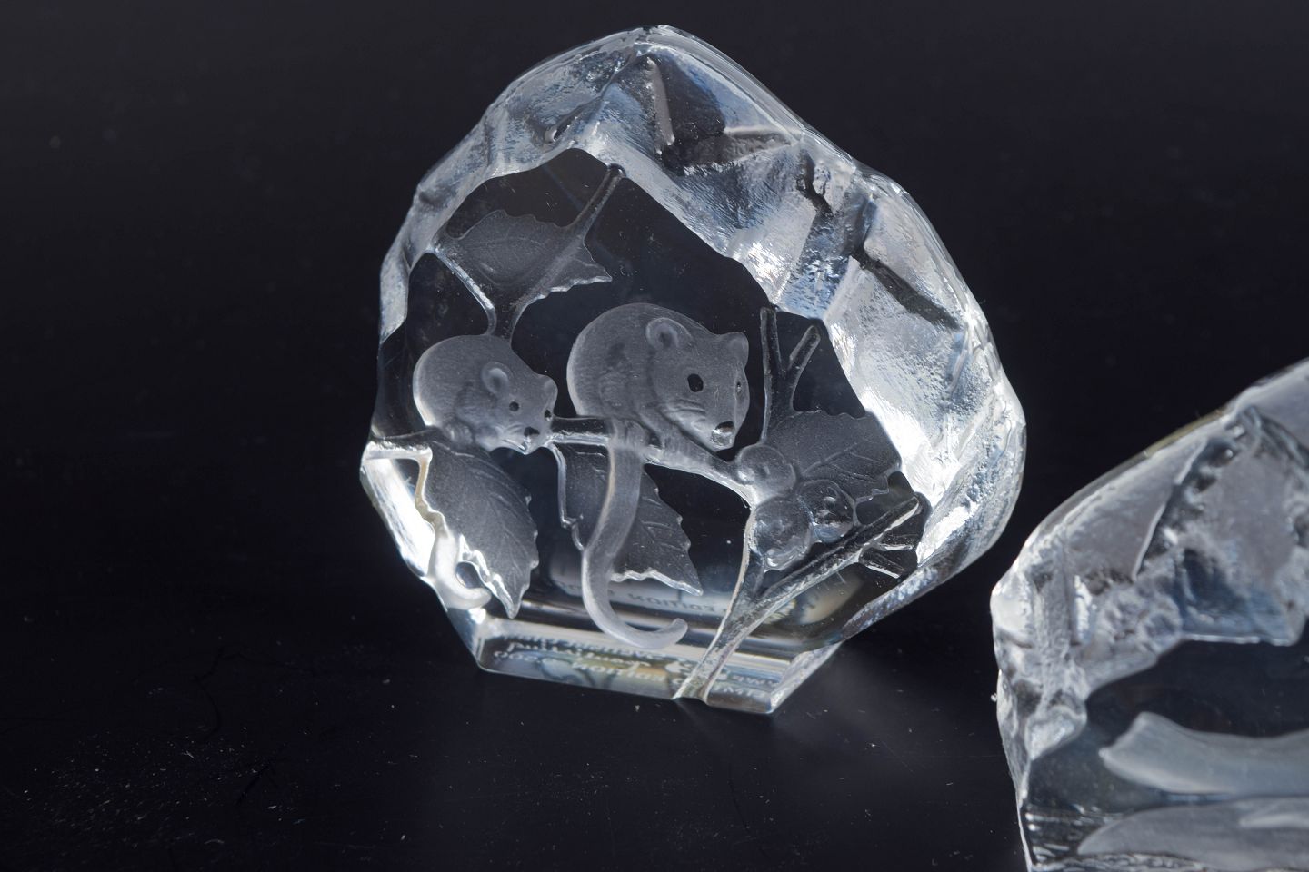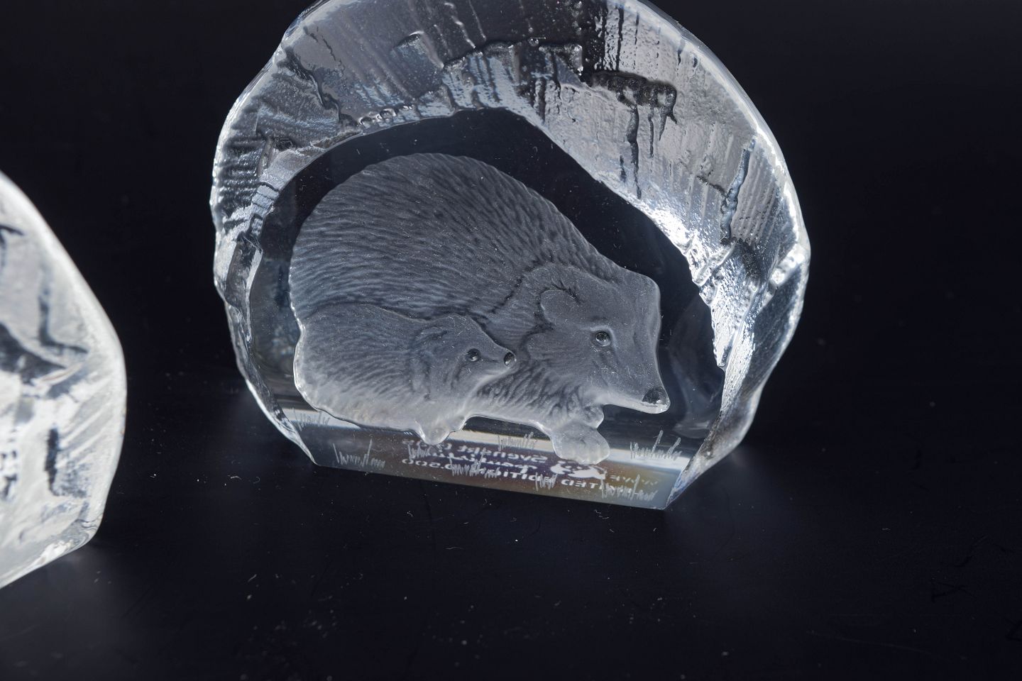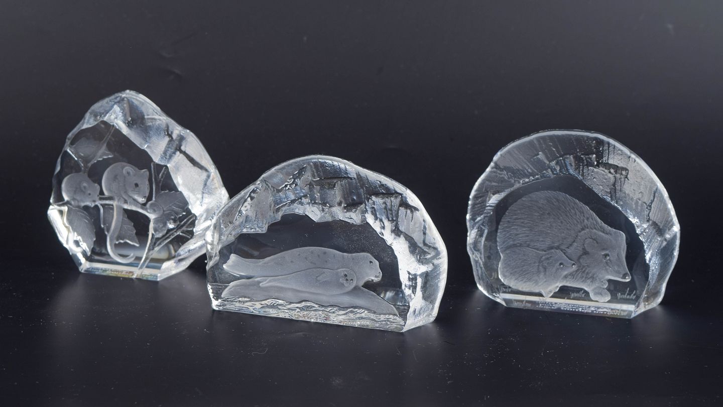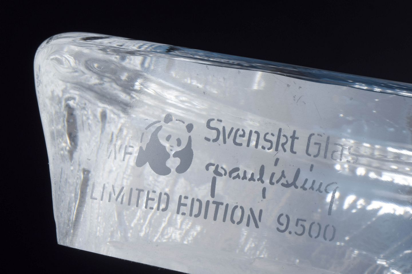 Paul Isling for Svenskt Glas, WWF figurer, sæt med 3.Skulpturelle kunstglasblokke med indgraverede dyremotiver, udført i klart glas og udgivet som limited edition i samarbejde med WWF.