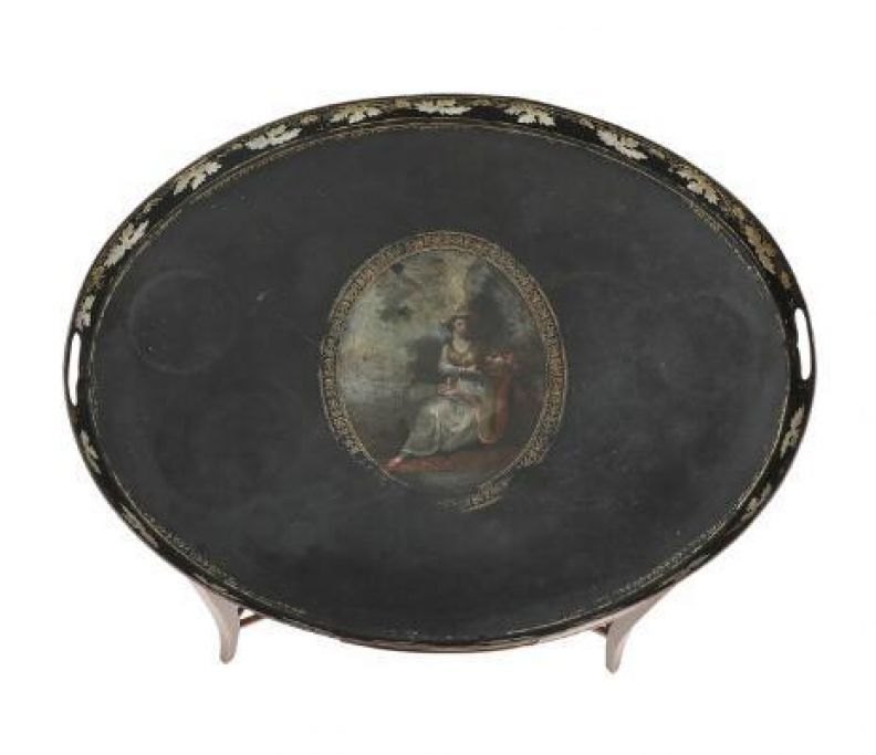 Ovaler Regency-Beistelltisch aus Mahagoni, um 1800, verziert mit Intarsien in Form einer Muschel, Gestell mit Schublade und Blindschublade, Seiten mit Kerzenhaltern, inklusive Tablett aus schwarz lackiertem Metall mit Motiv einer sitzenden Frau. H. 75 cm, B. 50 cm, L. 65,5 cm.Bestellnummer: 28968